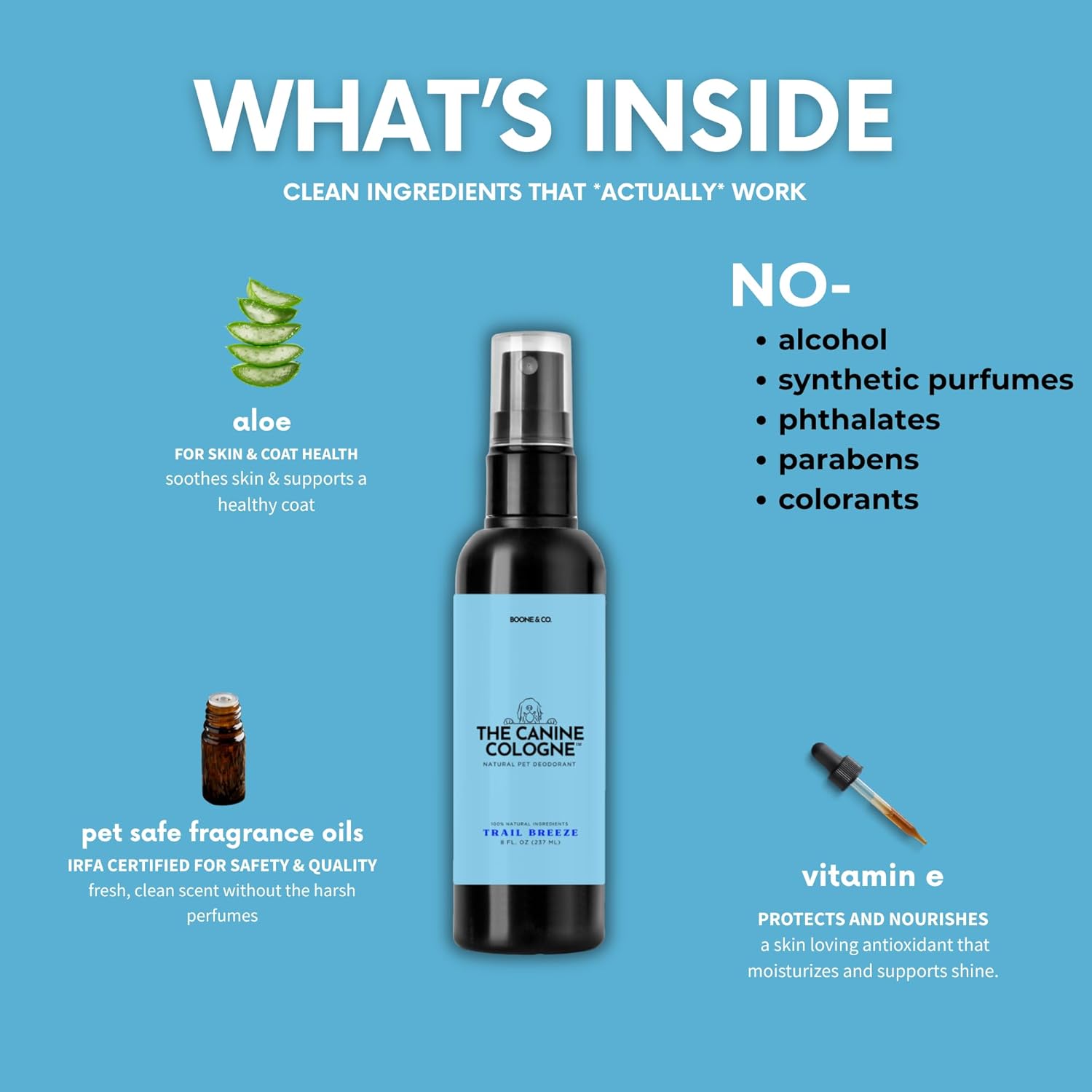 Boone & Co. Canine Cologne is a premium dog deodorizing spray made to keep your pup smelling fresh between baths. Formulated with clean, pet-safe ingredients like aloe vera, and phthalate-free fragrance oils, this alcohol-free grooming spray is gentle on your dog’s skin and tough on odor. Whether your dog just got back from a hike or rolled in something questionable, a quick spritz is all it takes to restore freshness. Available in three long-lasting signature scents inspired by all of the wonderful things life has to offer: Saltflower – crisp ocean air and soft florals Trail Breeze – bright cucumber and melon breeze Golden Hour – warm almond and sun-drenched coconut Crafted in small batches in the USA, Boone & Co. Canine Cologne is the perfect daily dog spray for odor control, coat refreshment, and clean, natural scent. Just shake, spray onto your dog’s coat, and brush through. Safe for all coat types and gentle enough for daily use.