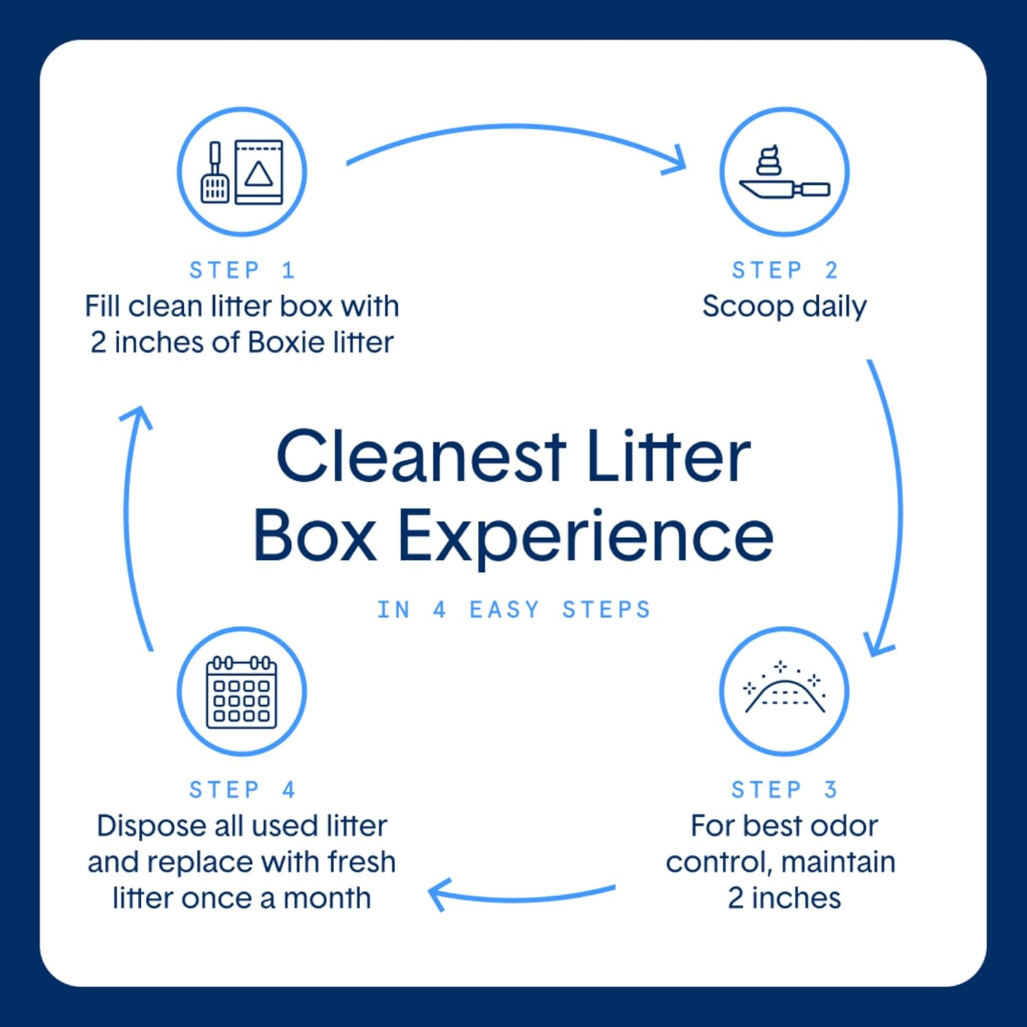 - Directions: Fill disinfected litter box with 3 inches of litter, scoop daily. For best odor prevention, maintain 3 inches of litter. Replace all used litter with fresh litter once a month. Dispose in trash, do not flush down toilets or drains. Boxie is landfill friendly. Not for internal use. Not meant for use as compost or as a traction aid. Store in a cool, dry place. Product filled by weight; some settling may occur. We recommend introducing any crystal litter to kittens after 2 months of age.