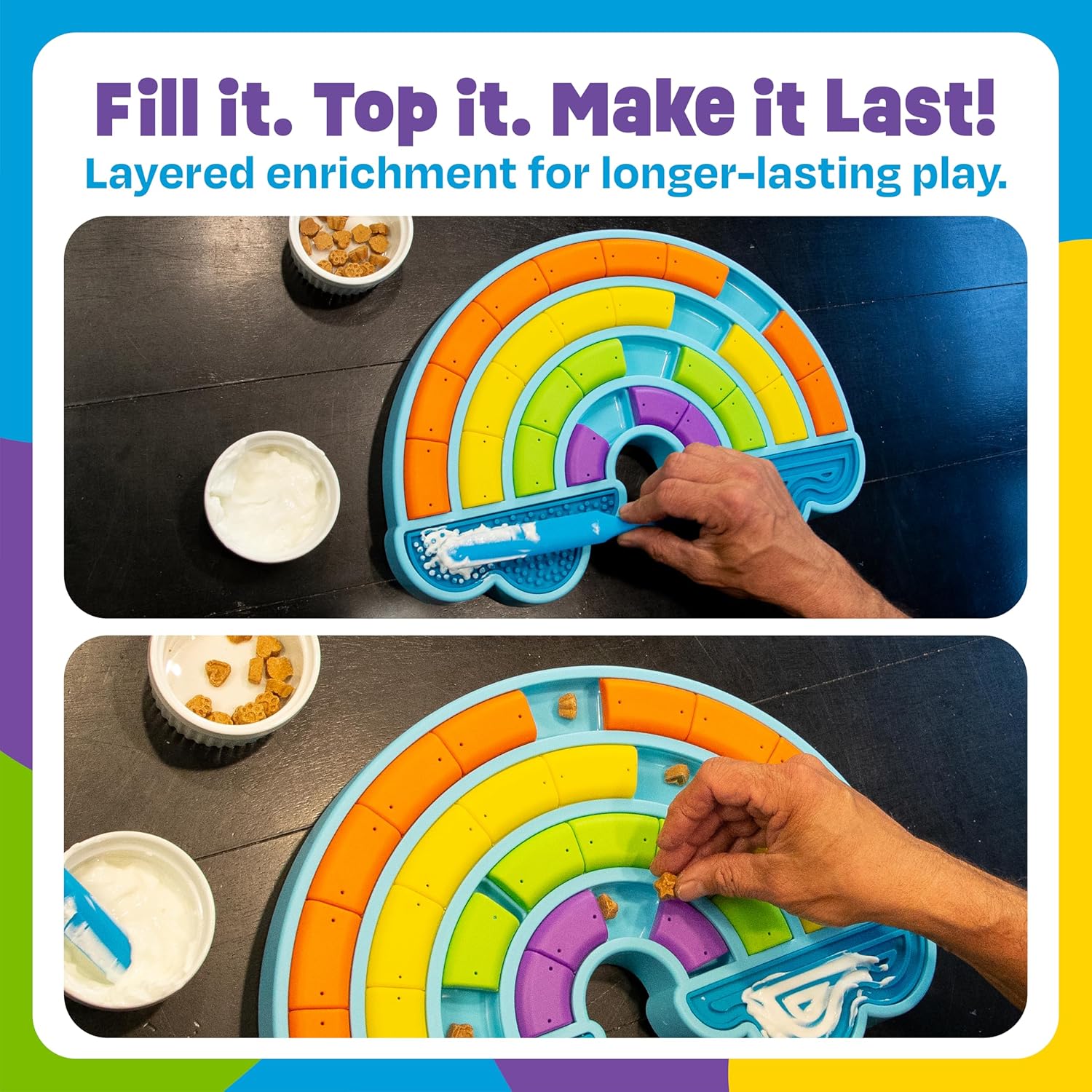 Help dogs discover the hidden treats and lick mat eats at the end of this rainbow! As dogs explore 28 hidden treat compartments and 2 removable suction-cup lick mats, they’ll discover ways to keep calm and focused while chowing down. If you’re looking for enrichment, slow feeder bowls and puzzles help fast eaters slow down to promote gut health. Made from BPA-free, food-safe materials, this interactive dog toy's also safe for the freezer or dishwasher. It even makes a great dog birthday gift! What are the main benefits that pets receive from this toy? The Calming Rainbow Treat Puzzle & Lick Mats help dogs ease anxiety, promote good behavior, and keep brains engaged How many pieces are included with this toy? This set includes 3 pieces. What is this toy made from? Our lick mats are made from durable, food-safe silicone that's designed for years of use. Where can I get a replacement part? While we're unable to stock replacements for every component that comes with our toys, we'll do our best to find the part or piece that makes your toy whole again. Just submit a request here with a description of the piece, and we'll let you know if we find it.