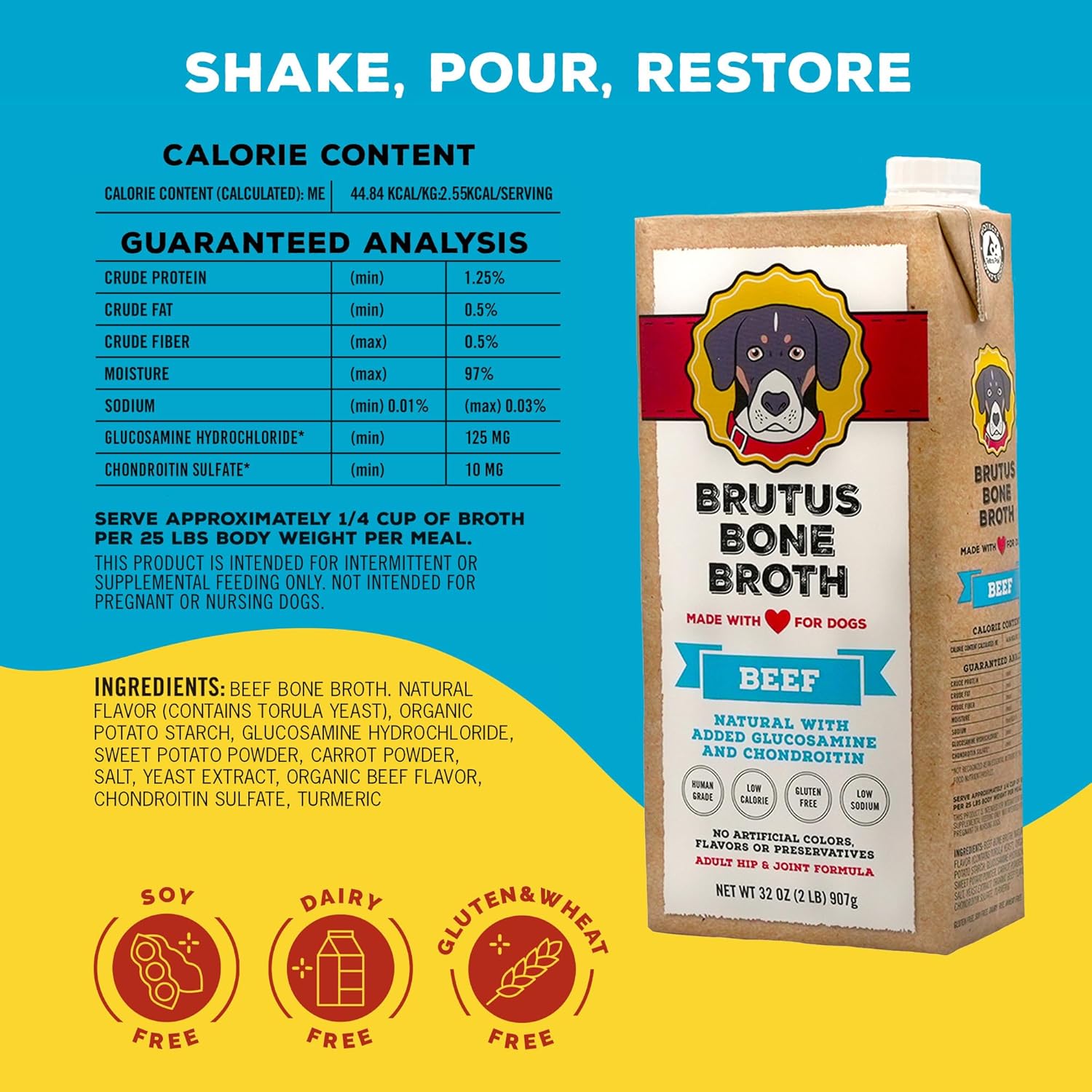 About this item SUPPORTS JOINT HEALTH: Every serving of Brutus Bone Broth for dogs is infused with Glucosamine and Chondroitin to support healthy hips and joints in all dogs including puppies and older dogs. ALL NATURAL INGREDIENTS: Brutus Bone Broth is made with all natural human grade ingredients, nutrients and flavors and is gluten free. BIG ON FLAVOR AND NUTRIENTS, LOW ON SODIUM: Our hydrating dog broth topper is made with all natural, delicious, savory flavors and makes dry dog food easy to eat. It is packed with protein and vitamins while only containing 0.1% sodium. MADE IN THE USA: All Brutus Bone Broth for dogs products are made and packed in our human-grade facilities right here in the USA. ENVIRONMENTALLY AND SOCIALLY CONSCIOUS: Brutus Bone Broth products are packaged in sustainable, eco-friendly packaging. A portion of all proceeds are used to help animals. Packaging may vary. › See more product details