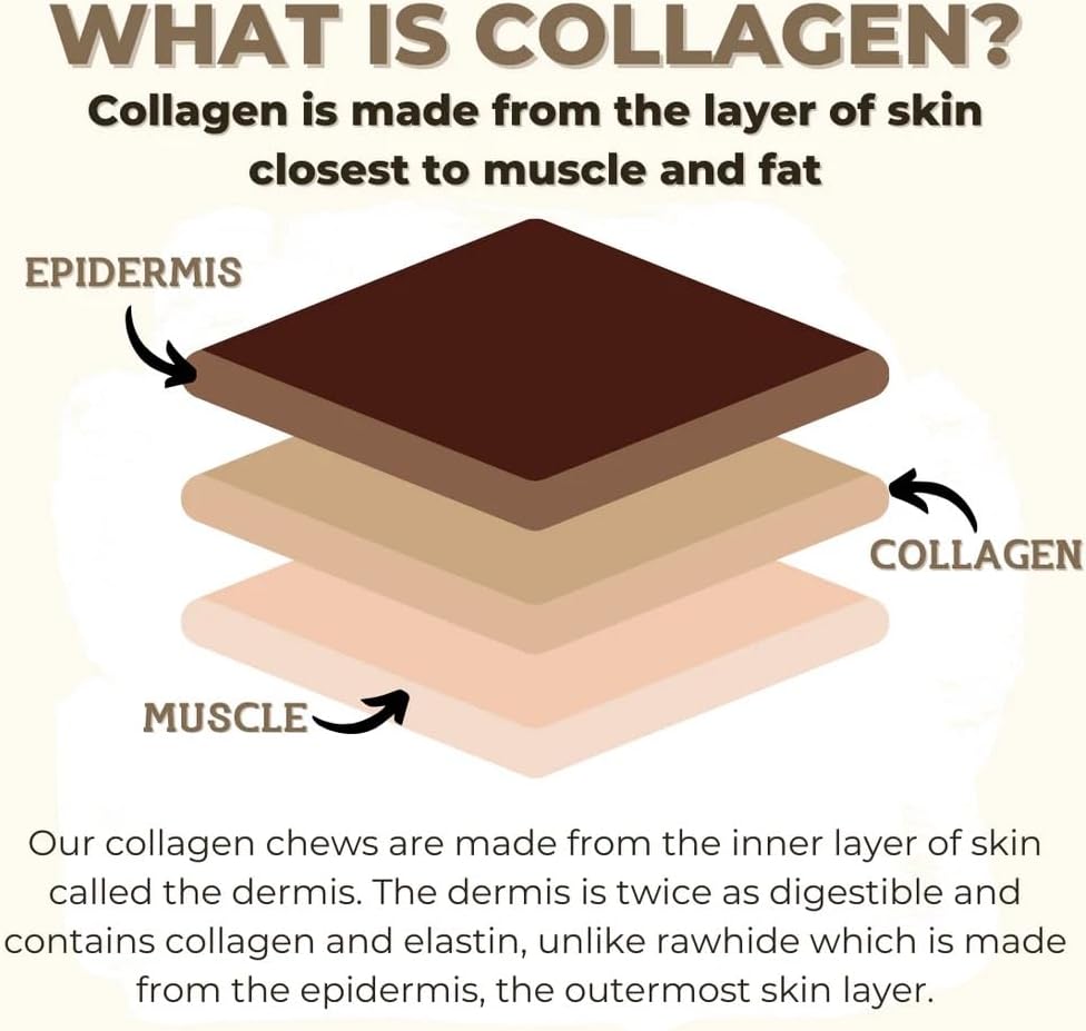 About this item 100% All-Natural Beef Collagen: Made from high-quality, single-ingredient beef collagen, these 6-inch chews are perfect for dogs who love to chew while promoting overall health and wellness. Supports Skin, Coat & Joint Health: Collagen is known for promoting healthy skin, a shiny coat, and strong joints. Ideal for senior dogs or active pups that need extra joint support. Long-Lasting & Highly Digestible: These chews are designed to keep your dog entertained while being easy on the stomach. A great alternative to rawhide, providing hours of chewing without the risk of indigestion. Dental Health Benefits: The firm texture of the chews helps clean teeth and gums, reducing plaque and tartar buildup while satisfying your dog’s natural chewing instincts. Perfect for All Dog Breeds & Sizes: Whether you have a small or large dog, our 6-inch beef collagen chews are the perfect treat to reward and keep them occupied. › See more product details