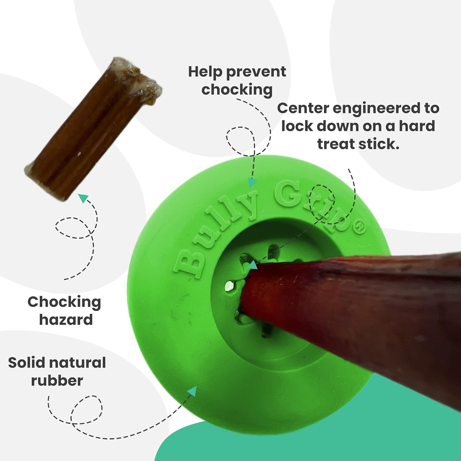 Bully stick holder that fits most bully sticks and hard treat sticks from 1/2" wide to just under 3/4" wide Multi-Functional Dog Toy and Safety Device! Made with non toxic chew resistant durable natural rubber designed for dogs that like to chew (supervise use). Helps prevent choking and stomach blockage in dogs when eating treat sticks. Quality Inspected, Assembled and Packaged in the USA. Twist the Bully Grip onto the treat stick by gripping the bully grip in one had and the treat stick in the other. Twist until the treat stick is completely in the bully grip. Works best if you place the Bully Grip on the thickest part of the treat stick. › See more product details