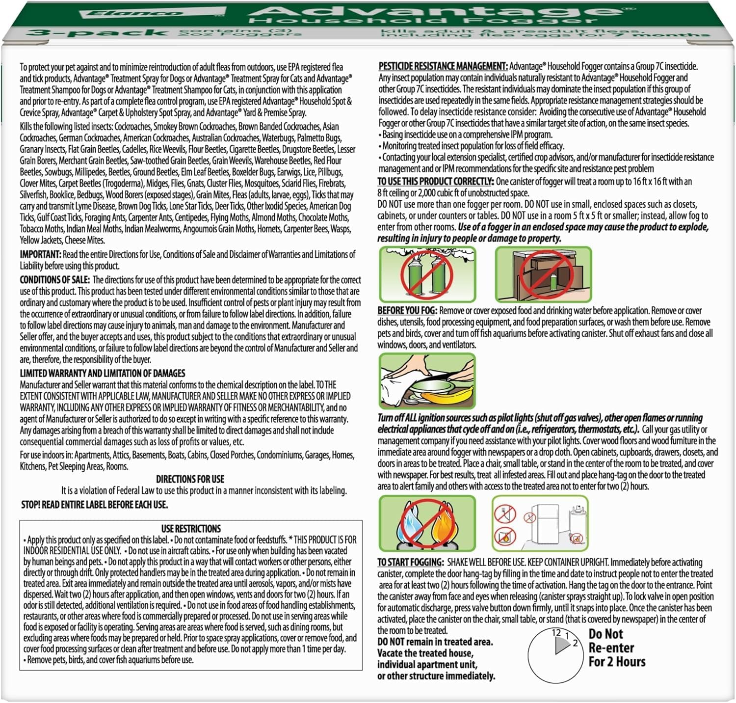 An excellent value from the Advantage brand, Advantage for Large Cats offers topical flea prevention and treatment to kill fleas fast* and prevent new infestations. These topical flea drops kill adult fleas on cats before they lay new eggs. Apply at the base of your cat's skull. This treatment works hard for 30 days to treat existing flea infestations and prevent further infestations on cats for up to four (4) weeks. Only 5% of a flea infestation is found on your pet - with the other 95% being found off your pet and in their environment. This can make flea infestations feel impossible to treat. Advantage Household Fogger is a powerful solution for eliminating fleas, ticks, cockroaches, bed bugs, flies and other labeled pests from your home. The formula is designed to kill adult fleas and their eggs and ticks - catching them before they grow up to bite. Use this flea fogger to reach insects in carpets, rugs, drapes, upholstery, pet bedding, floor cracks and open cabinets. It provides long-lasting flea and tick prevention - killing fleas and ticks for 7 months, so you and your pets can get back to the things you love most. The Advantage product family helps you fight fleas comprehensively - killing fleas on your pet, in your home and in your yard. To get the most out of Advantage Household Fogger, it's best to use it as part of a complete flea treatment program powered by Advantage. Treat your dogs and cats with topical flea treatments, shampoos or sprays, your home and furniture with spot treatment flea spray or foggers and your yard with Advantage Yard & Premise Spray. This package contains three 2 oz. canisters that are designed for indoor use. Each canister of Advantage Household Fogger is capable of treating a room up to 16 ft. x 16 ft. with an 8 ft. ceiling or 2,000 cubic ft. of unobstructed space. This means you can easily treat multiple rooms in your home with just one package.