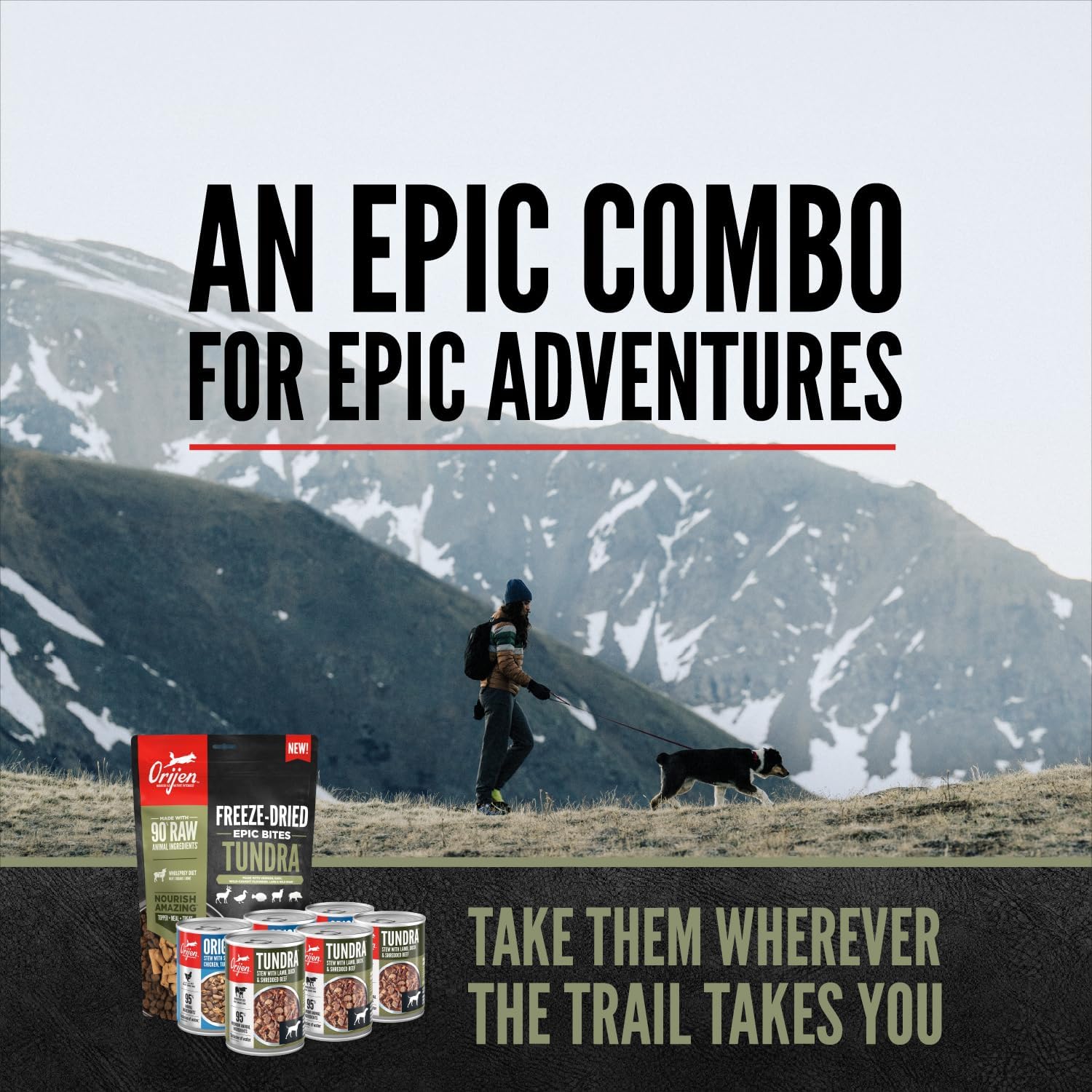 Give your dog a complete and flavorful mealtime experience with this ORIJEN bundle featuring Epic Bites Freeze-Dried Tundra Recipe and the Stew with Shreds Wet Dog Food Variety Pack. Epic Bites deliver 90% raw animal ingredients*, including venison, duck, wild-caught flounder, lamb and wild boar, and can be fed as a topper, standalone meal or rewarding treat. The Stew with Shreds Variety Pack includes three cans of Tundra Stew with lamb, duck and shredded beef, and three cans of Original Stew with shredded chicken, turkey and eggs. Each Stew with Shreds recipe is crafted with 95% animal ingredients*, including nourishing WholePrey organs, and enriched with bone broth for a burst of flavor and added hydration. Made in the USA with quality ingredients from around the world, this bundle offers protein-packed nourishment in both freeze-dried and wet food forms. *Approximate and derived from the unprocessed state of the ingredients. Our included raw ingredients are delivered frozen.