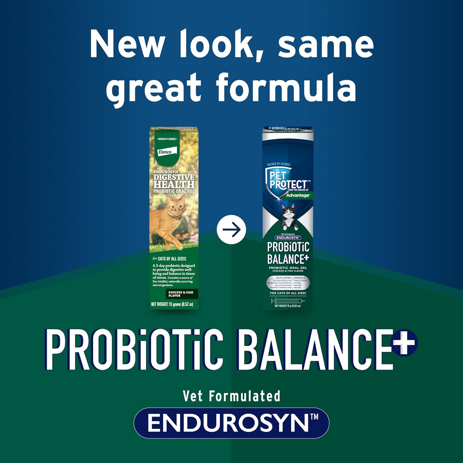 Give your cat long-lasting protection against fleas and ticks with a Seresto Cat flea and tick collar. Unlike other flea and tick protection, Seresto Cat flea and tick collars kill and repel fleas for eight continuous months. Seresto Cat flea and tick collars are recommended by veterinarians, stocked by 8,000 vet clinics* and trusted by pet owners for nearly a decade. Seresto Cat gets right to work killing existing fleas on cats within 24 hours. Reinfesting fleas are killed within two hours – before they lay eggs – delivering protection against further flea infestation for eight months. Seresto Cat collars make your cat’s comfort a priority by killing on contact, so pests don’t have to bite your cat to die. Seresto Cat collars also kill re-infesting ticks in as quickly as six hours, and they prevent tick infestations within 48 hours of the initial application. Pet Protect Probiotic Balance+ cat probiotic supplement is a unique, patented oral supplement to support a healthy gut when your cat needs it most. This chicken- and fish-flavored probiotic oral gel contains vet-formulated ingredients to provide advanced support for stress-induced digestive issues, microbial balance, intestinal well-being, and post-antibiotic and deworming therapy. It also helps maintain energy and electrolyte balance. Pet Protect Probiotic Balance+ cat supplements provide your cat with prebiotics and probiotics, amino acids, electrolytes, vitamins, fatty acids, and lactic acid bacteria to help balance the digestive system, as well as glutamine, which serves as a fuel source for cells in the small intestine and large bowels. Pet Protect Probiotic Balance+ uses the same vet-formulated Endurosyn formula that has been sold in vet clinics to provide ongoing digestive health and probiotics for cats. Cat supplements and vitamins like Pet Protect Probiotic Balance+ can help support your furry friend's digestive needs, helping them live the life they deserve.
