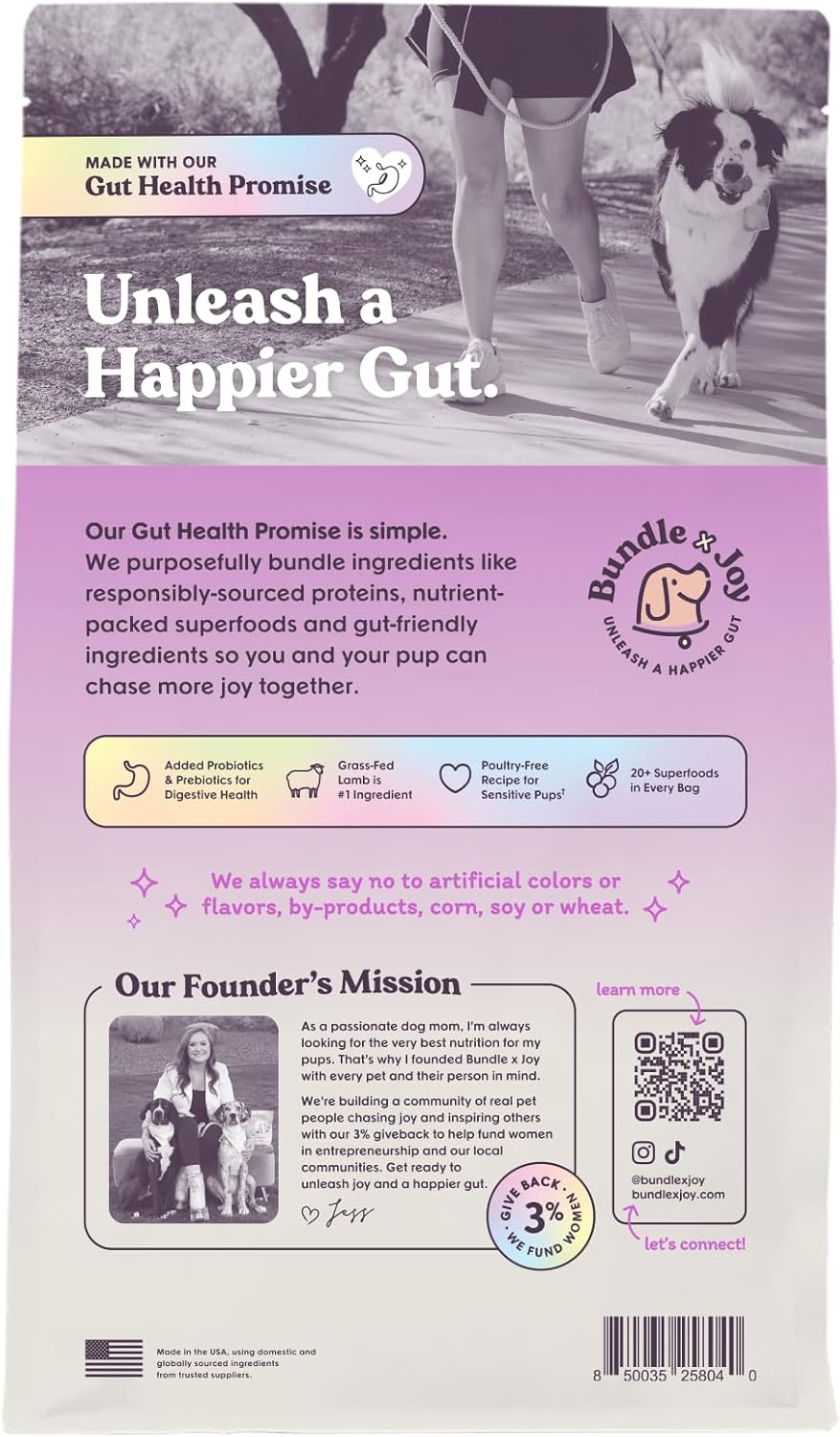 About this item REAL NEW ZEALAND LAMB DRY DOG FOOD: Made with New Zealand lamb as the first ingredient, our Brave dry dog food recipe is a natural and healthy dog food with added dog probiotics for sensitive stomachs. NATURAL INGREDIENTS: Made with 20 plant-based superfoods in every bag including flaxseed, pumpkin, apples, carrots, and cranberries. A delicious flavor enjoyed by all dogs, even picky eaters. FOR ALL ADULT BREEDS AND SIZES: Bundle x Joy dog food has omega fatty acids to support healthy skin and a shiny coat and probiotics to support digestion. The kibble pieces are small enough for small breed dogs to enjoy. GRAIN FREE DOG FOOD: Our wholesome lamb dog food recipe is grain free and chicken free with no corn, wheat, soy, artificial colors, flavors or preservatives. Great for dogs allergic to chicken. 100% FEMALE-FOUNDED COMPANY: Bundle x Joy is committed to empowering women in all walks of life. We harness a 3% give-back to fund women in entrepreneurship and our local communities. › See more product details