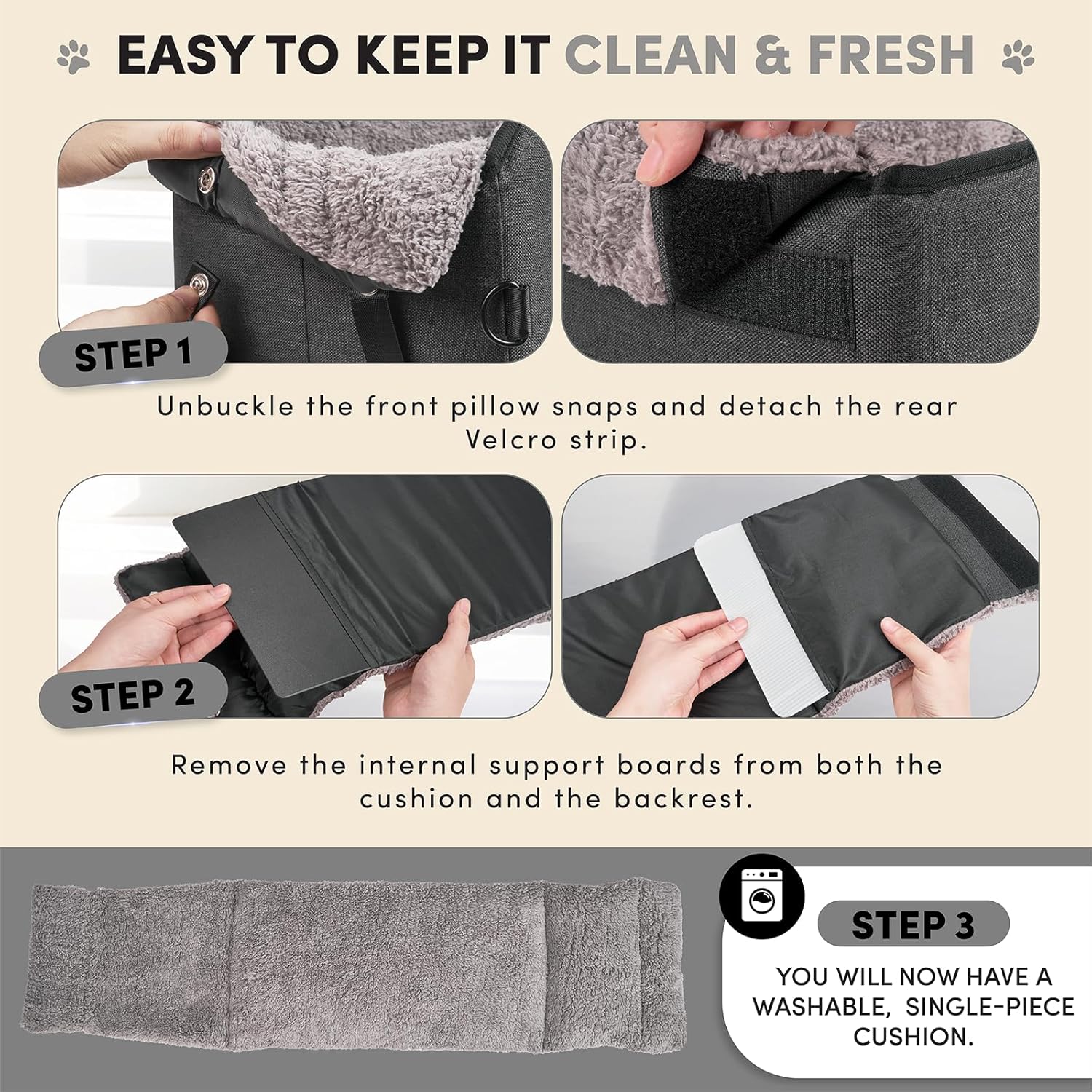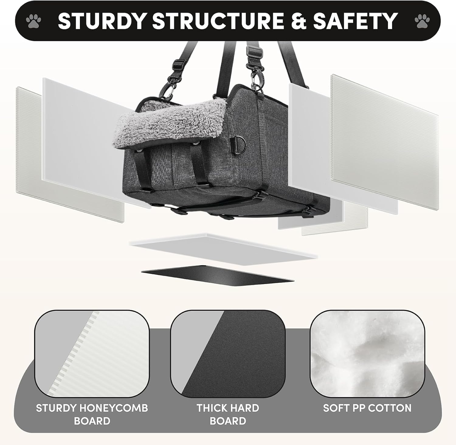 About this item Enhanced Safety Design -- Built with a reinforced honeycomb board surrounding a plush pearl cotton interior, this console dog bed offers superior impact protection during sudden stops or sharp turns—keeping your pet calm and injury-free. Non-Slip and Stable on the Armrest -- Features dual side straps that anchor securely to both front seat headrests, plus bottom straps that wraps firmly around the console lid—keeping the carseat steady even on bumpy rides. All-Around Comfort & Easy to Clean -- All-around ultra-soft plush fabric surrounds your pet for a full wrap-around snuggle feel. The raised front pillow supports neck and head alignment. The back pad, seat cushion, and pillow detach easily and are machine washable, ensuring your pet’s bed stays fresh and clean. Personal Space for Small Pets: Designed to fit most SUVs, trucks, and mid-sized sedans (recommended armrest size ≥17" L × 9.8" W), this product is suitable for pets under 11 lbs and up to 12 inches in body length (from neck to tail). It creates a comfy, dedicated space for your pet, while still allowing you to focus on driving and enjoy the ride. 2-in-1 Design for Travel & Home Use -- More than just a booster center console car seat—it doubles as a shoulder carry bag for vet visits or café days, and transforms into a comfy bed for indoor lounging or outdoor picnics. Wherever you go, your pet stays close and comfortable. › See more product details
