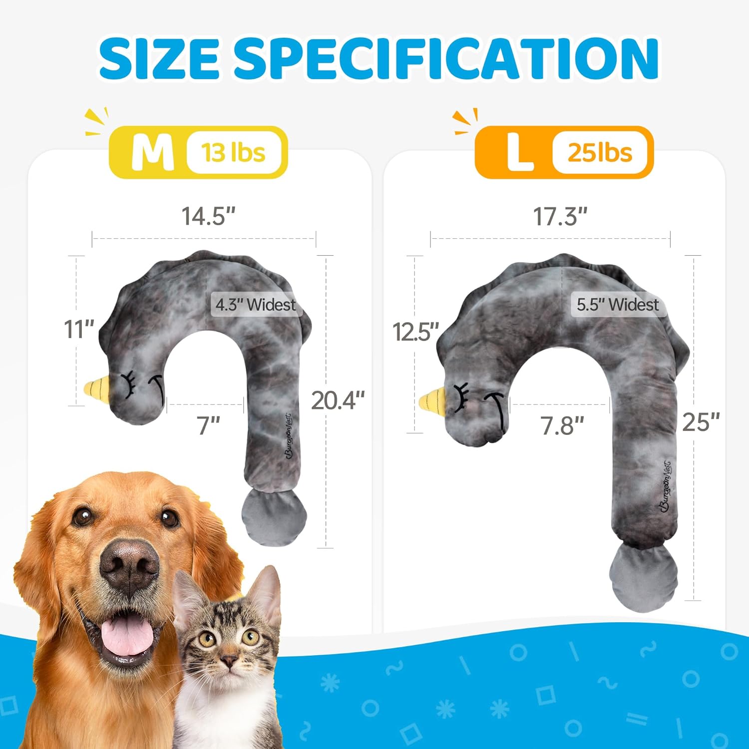 About this item SOFT AS A CLOUD: Filled with our unique Cloud Cotton material, this pet pillow delivers a cloud-like softness, providing cats and dogs with more comfort for restful sleep. TWO SIZE OPTIONS – this bed pillow is designed to fit pets up to 13 lbs (M, small dogpuppykitten) or 25 lbs (L, medium dog t), ensuring a snug and comfortable resting spot for pets of varying sizes. DREAM PATTERN DESIGN: The charming tie-dye question shape is designed to support your pet's head, neck, and back, offering ergonomic comfort that fits their natural curve for better sleep. EASY TO CLEAN: Fully machine washable and safe for tumble drying, so you can easily keep it clean and fresh without any fuss. COMFORT MEETS FUN DESIGN: Combining comfort and style, the playful look offers a cozy resting place while adding a whimsical touch to your pet’s favorite space (bed,cat tree, room,everywhere at home). › See more product details