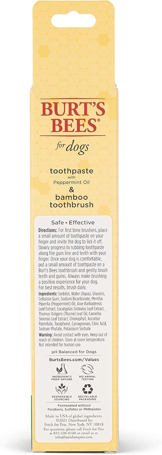 Since 1984, Burt's Bees has been working with nature to create products that nurture your health. We believe that pets are family, so we're bringing the same natural attention and care to your closest furry friends. From Burt's Bees grooming products to dog dental care and cat dental products, Burt's Bees is here to keep your pet healthy. Natural, effective, and pH balanced for dogs, the Burt's Bees for Dogs Fresh Breath Oral Care Kit makes it easy to keep your dog's oral care healthy and clean. The Burt's Bees for Dogs Natural Oral Care Kit is the perfect dog dental care training kit for dogs. This dental care kit for dogs comes complete with a dog toothpaste and toothbrush set. The dog toothpaste is a 2.5 oz tube of 99.5% natural dog toothpaste. It is made with honeysuckle and peppermint oil and has a fresh mint flavor that puppies love. This dog toothpaste is made from natural ingredients to be safe and effective. This toothpaste for dogs has no colorants, no sulfates, no added fragrances, and is cruelty free. This dog dental care kit for dogs also comes with a soft bamboo toothbrush for dogs. When used with the Burt's Bees for Dogs Bamboo dog toothbrush with natural bristles, the dog toothpaste and dog toothbrush make the ideal dog oral care kit for your dog's oral care routine. Use Burt's Bees for dogs products that are made in the USA to give your dog healthy and clean teeth. Teach dogs about the importance of good dog dental health with this oral care kit for dogs. Directions: For first time brushers, place a small amount of toothpaste on your finger and invite the dog to lick it off. Slowly progress to rubbing your finger along the gumline and teeth. Then put a small amount of toothpaste on the Burt's Bees toothbrush and repeat. Always make this a positive experience for your dog. For best results, brush daily. Warnings: Avoid contact with eyes. Keep out of reach of children. Store at room temperature. Not intended for human use.