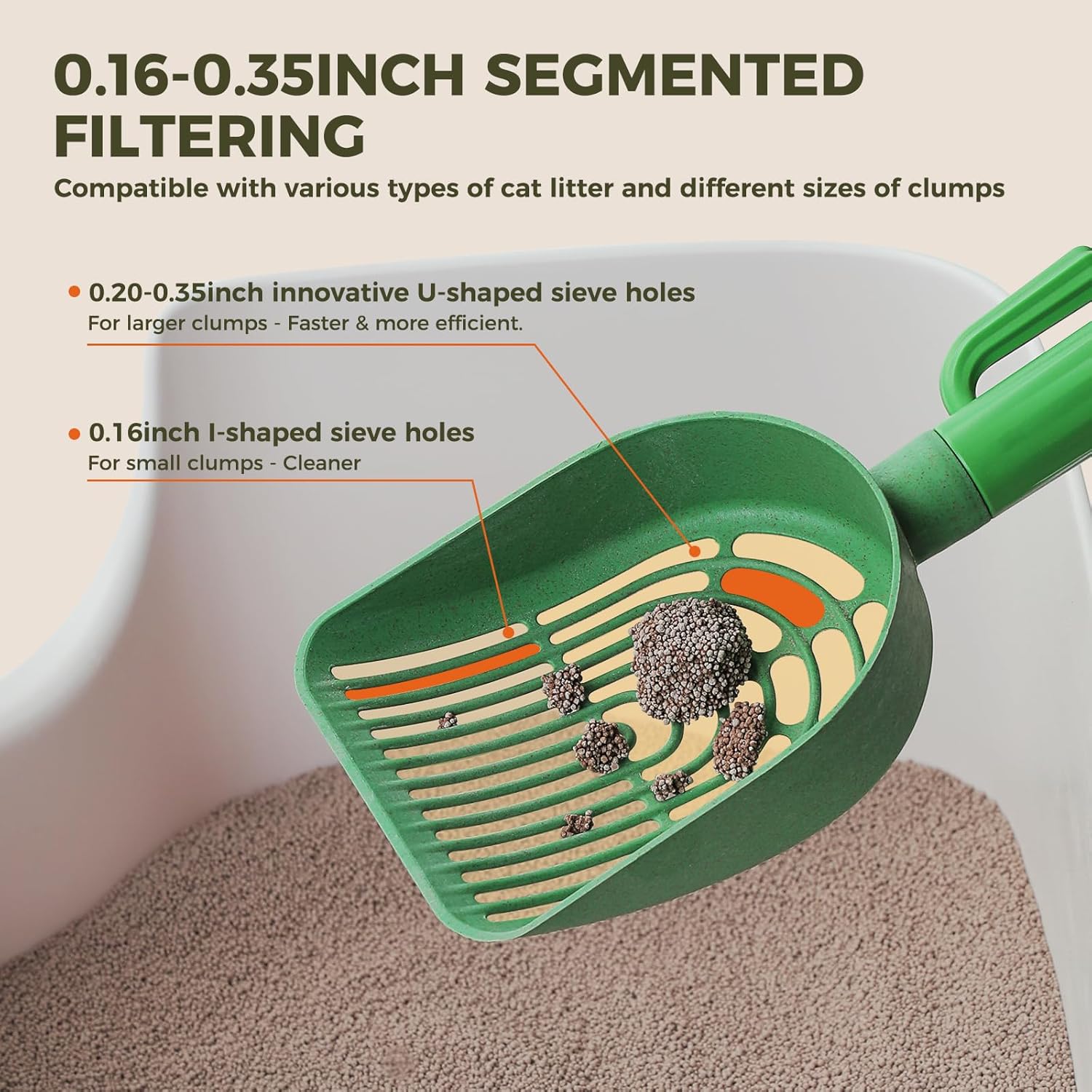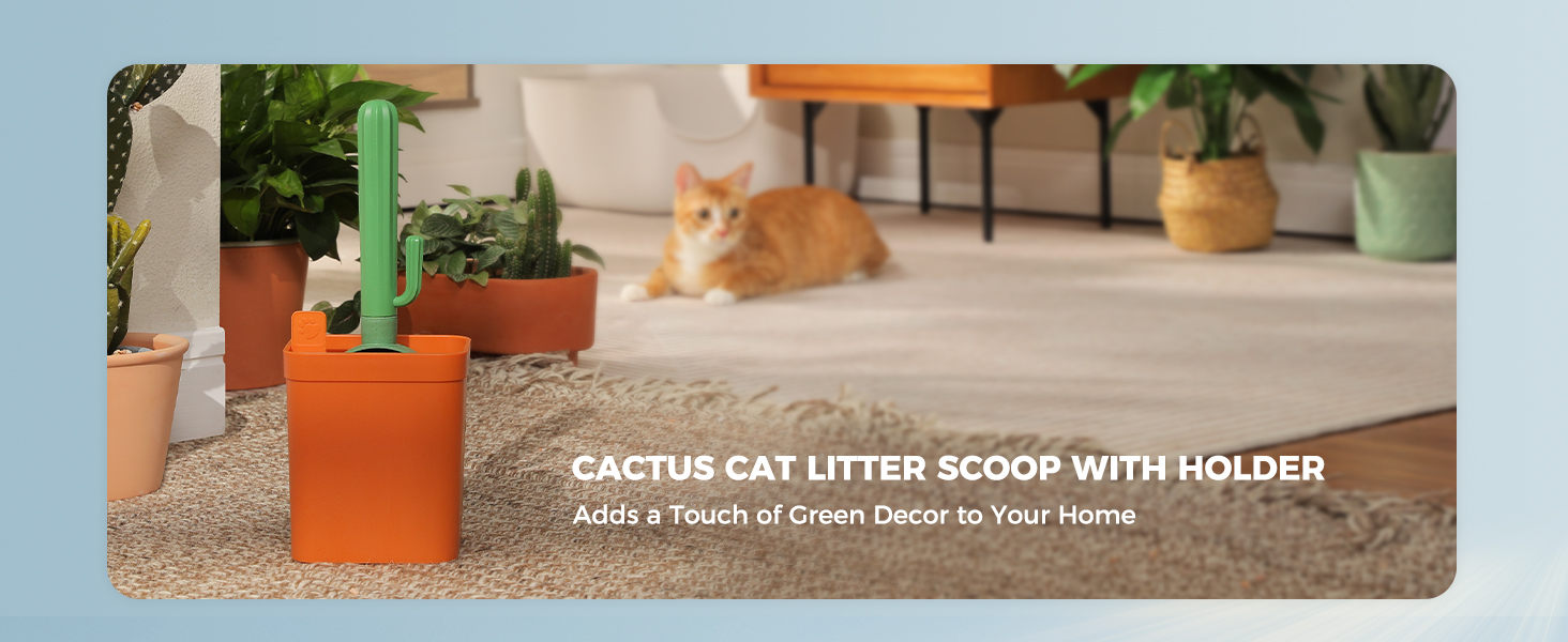 PATENTED DESIGN - ELEGANT SCOOPING EXPERIENCE - The cactus shaped cat scooper offers a refreshing vibe. Its planter design also serves as an elegant home decor piece. The litter scoop holder provides a dedicated space for the scooper, making your floors cleaner and your home more organized. The design and functionality of this product are protected by patents. 2 REPLACEABLE SCOOPS - ECO-FRIENDLY WHEAT MATERIAL - The shovel heads are made from wheat straw plastic, a sustainable and renewable resource. This eco-friendly material helps decrease dependency on petroleum-based plastics and minimizes microplastic pollution. The set includes 2 scoop heads for convenient replacement as needed. The handle is made from durable ABS plastic, known for its strength and durability, which reduces the need for frequent replacements and helps minimize waste. 2X FASTER & 3X CLEANER - 0.16" to 0.35" SEGMENTED FILTERING - The shovel surface is divided into two areas. AREA 1: The 0.2"-0.35" innovative U-shaped holes, designed for rapid sifting and litter leakage, thus increasing cleaning efficiency. AREA 2: The 0.16 inches I-shaped holes efficiently trap small clumps to enhance cleanliness. This design is compatible with various types of cat litter and different sizes of clumps, including tofu litter, bentonite, silica gel litter and so on. BIOMIMETIC 3D RIDGE STRUCTURE FOR LESS STICKING - Inspired by the cactus, our litter box scoop features a unique wavy, 3D edge on each ridge, designed for quick and smooth litter separation. Unlike flat-surfaced alternatives, this reduces resistance and minimizes contact area, effectively preventing litter from sticking. Additionally, it enhances mechanical strength, preventing deformation of the poop scoop. ONE-STOP STORAGE FOR ALL YOUR SCOOPING ESSENTIALS - 1 roll of degradable trash bag is included in the set and a storage space in the litter scooper holder. The bags included fit the size of standard household trash cans. Features a swift and easy-to-use drawer-like compartment for garbage bag storage, making trash disposal more convenient. Holds up to 3 rolls of standard garbage bags. You might also consider taking this kitty scooper with bag when traveling. › See more product details