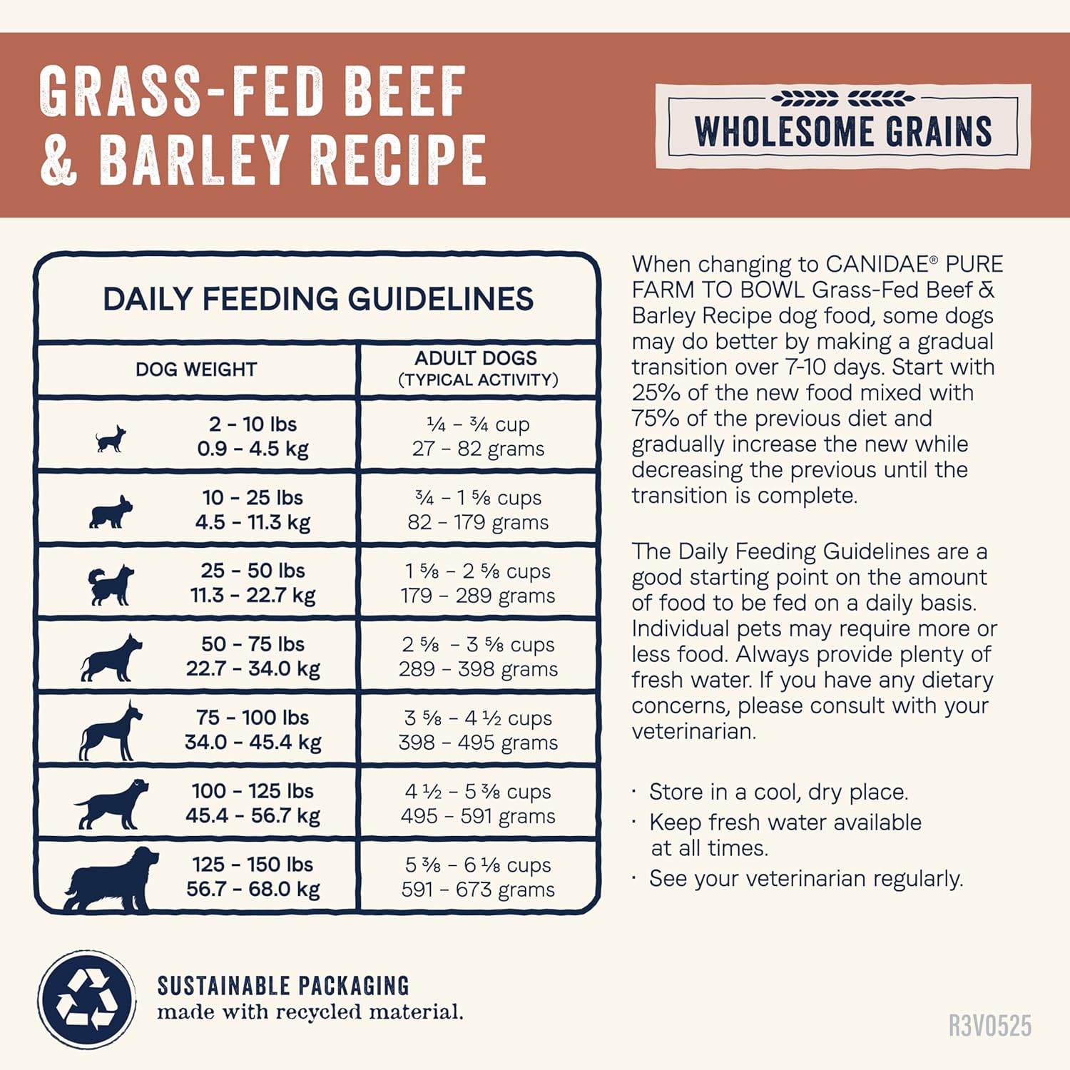 - Directions: Please see product packaging for complete feeding and feeding transition instructions. Every dog is a little different, so optimal feeding amounts may vary with age, breed, size, activity level and environment. Consult your veterinarian about your pet’s ideal weight and adjust feeding amounts as needed. Keep fresh water available at all times.