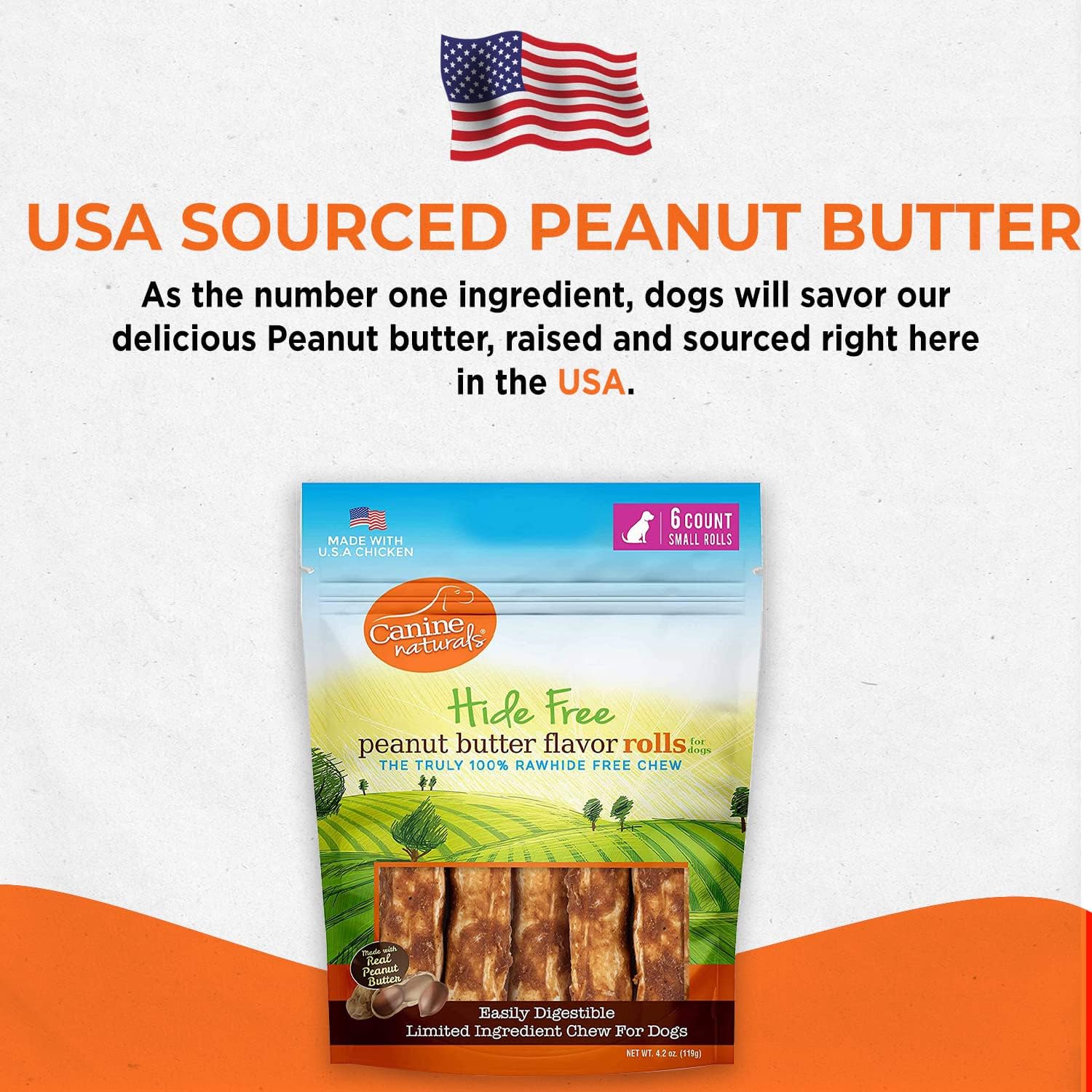 Canine NaturalsⓇ Hide Free Chews are a healthy and delicious alternative to rawhide products. Some brands or product names imply their chews are hide-free, when in fact “collagen” derived from rawhide or some form of animal hide is used in their process. Why? Because animal hide provides a longer chew time for a lower cost as a by-product of other production, which can be difficult for your dog to digest. We proudly state 100% Rawhide Free directly on our packaging. With the 6 pack of our 2.5” peanut butter rolls, they’ll still enjoy plenty of healthy, safe, and satisfying chew time.** Our limited ingredient recipe is lab proven to be up to 400% more digestible than rawhide based products.* We only use real peanut butter in the chew’s coating to ensure your dog can safely enjoy the irresistible peanut butter flavor they crave. Made with care and integrity; our healthy dog treats contain zero artificial flavors, colors, or filler ingredients like corn, wheat, or soy. More than just a tasty treat, the long-lasting chew helps clean your dog’s teeth and gums while satisfying their natural chewing instinct, giving your pet the satisfaction and flavor that rawhides can't! With great flavors and real ingredients, Canine NaturalsⓇ chews are a healthy and rewarding treat that’s sure to please. *In Vitro Hide Free Study Performed by Dr. Maria Godoy at the University of Illinois. **We recommend buying a chew that is larger than your dog’s mouth. A chew that is larger than your dog’s mouth helps ensure they chew and work on the product versus just swallowing it.
