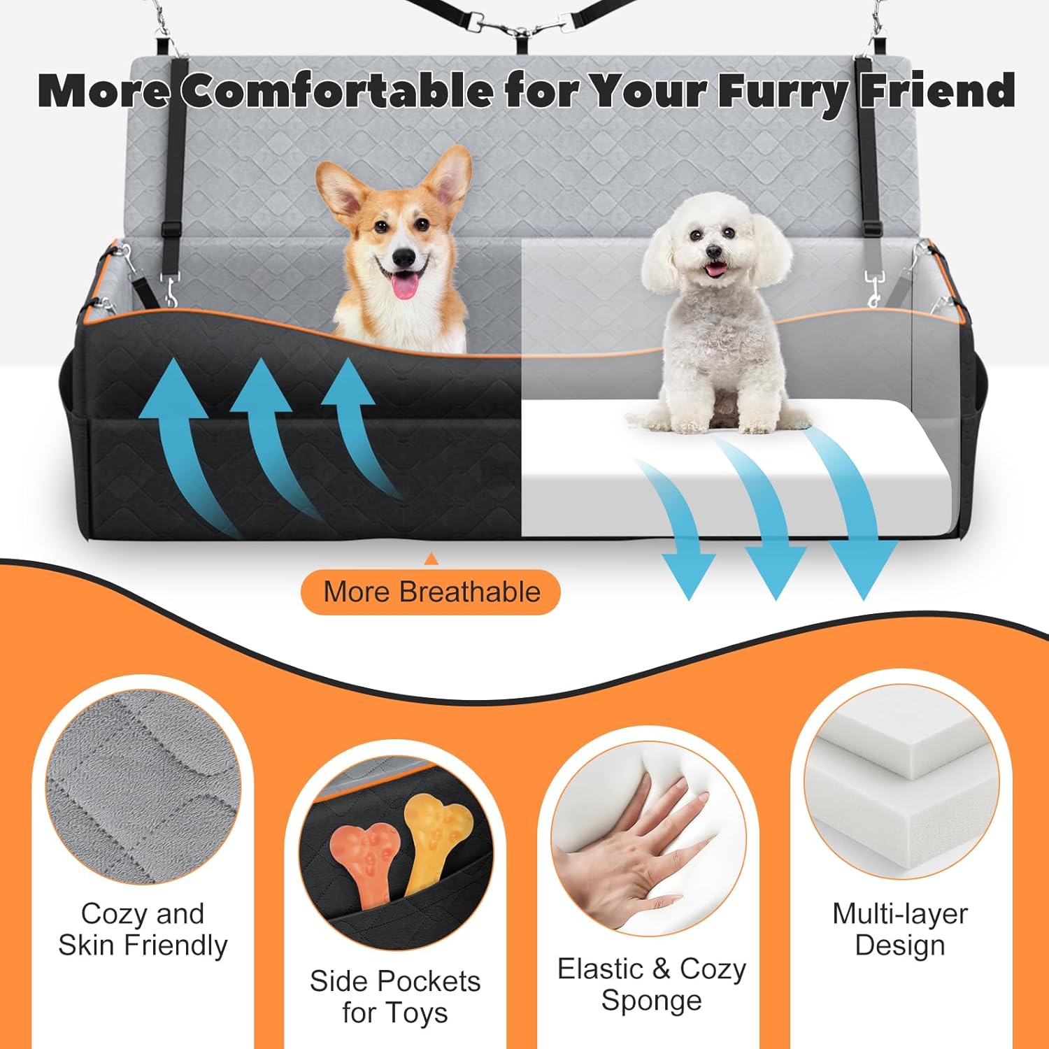 About this item Security & Comfort: The travel seat for dogs is made of hard-wearing polyester fiber that is strong and long-lasting. High quality sponge padding provides stable support to the bottom and sides of the dog booster seat, creating a cosy and comfortable space for your beloved pet. 4.5-inch thick sponge cushion raises the dog seat, allowing most dogs to enjoy the view out the window and relieve travel anxiety. Ample Space: Designed for pet-owning families, this dog car seat is suitable for most cars. It measures 49.21*19.69 in, about the size of 2 seats in the car back seat. The large dog booster seat holds up to 100lbs and provides ample space for large or 2 medium or 3 small dogs. Side pocket can be used to store pet toys. With the company of toys, your pet is not bored on the go. Multiple Fixing Design: The dog car bed is designed with multiple fixing, including a car seat pin, a car seatbelt fixing, a lanyard attached to the rear seat headrest and 2 pet safety belts. The non-slip bottom increases stability. With this pet car seat, you can focus on driving with confidence and enjoy a safe journey with your pet. Machine Washable: The car seat for dogs outer sleeve is a removable short plush cover. It is waterproof fabric for easy daily tidying. Dust and stains on the surface can be effortlessly wiped off with a damp cloth. When you need to clean it, open the side zips, take out the sponges and then put the seat cover into the washing machine. The machine-washable design saves your time, so you can spend more precious time with your furry friend. Easy to Install: The large dog car seat is easy to install without tools. Just 4 steps to complete and start a safe and enjoyable journey with your pets. Tips: It is vacuum compressed packaging. After opening the package, please wait patiently for 24-48 hours for it to recover to the best condition. › See more product details