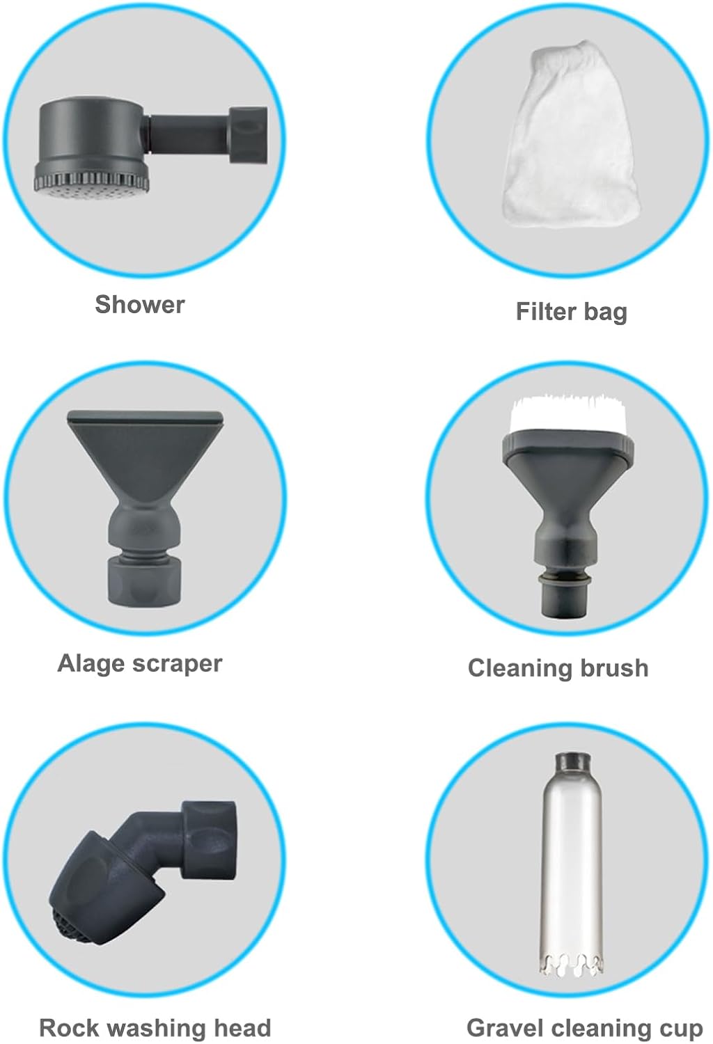 6IN1 Functional: Aquarium automatic gravel vacuum kit can effectively achieve :Water changing;Sand washing(When cleaning the sand, it is necessary to use it correctly and avoid allowing the sand to be sucked into the water pump);Debris cleaning;Scrub the fish tank;Water filter;Water cycle. Super Powerful:30W,110V/60Hz.It helps you quickly change the water, add water, and suck up dirt and impurities in your fish tank.Not suitable for fish tanks ≤20 gallons.the power is too strong. Special Design of Pump:It is different from the pump structure of the ordinary gravel vacuum, which greatly reduces the probability of sand blocking the pump. And ordinary gravel vacuums are easy to get stuck in the sand. In the case of sand stuck dead pump, only need to remove the connection pipe, wash with water, you can continue to use. Adjustable Length:20~45 Inches.Used in most sizes of fish tanks, turtle tanks.The minimum drainage level is 0.5 inches. Accessories:6ft water tubing,1pc scraper , 1pc filter shower , 1pc brush head , 1pc sand washing head,1pc sand vacuum , 1pc filter bag,The filter bag is not suitable for washing sand. › See more product details