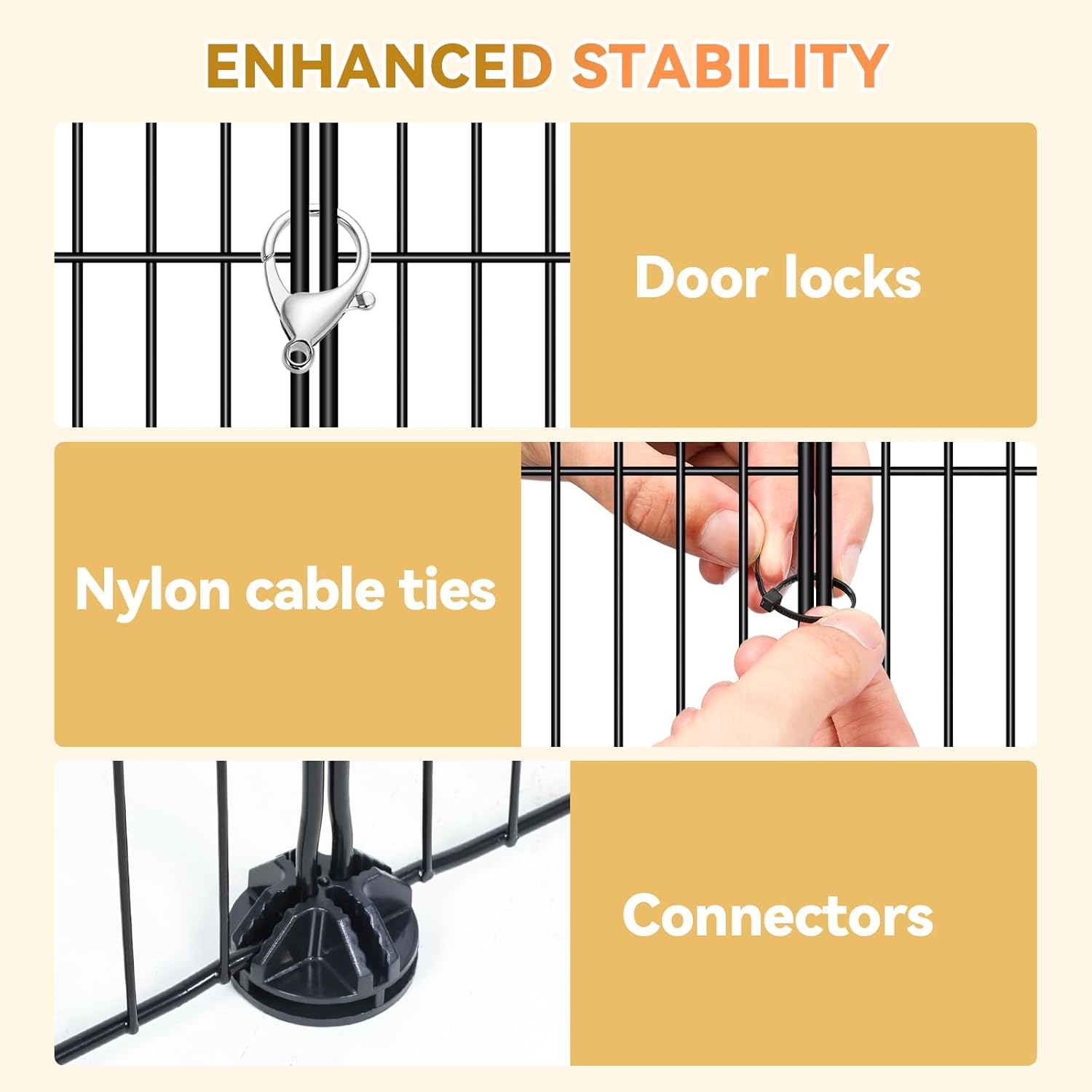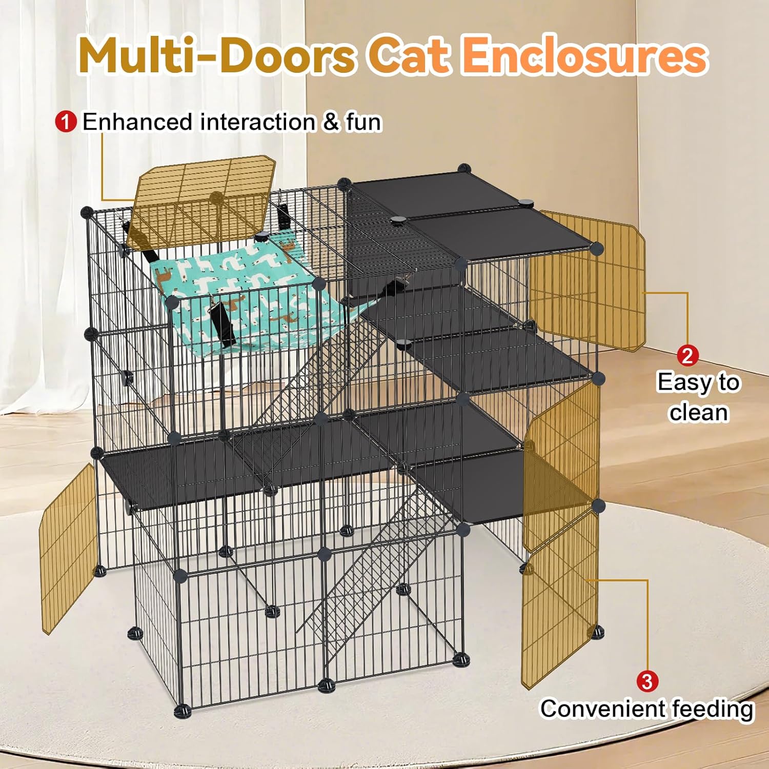 About this item 【Indoor/Outdoor Cat Enclosure】Measuring 36 x 24 x 36 inches, the cat cage is ideal for 1-3 cats indoor & outdoor. The spacious catio cat enclosure is also suitable for other small pets like rabbits, guinea pigs, chinchilla, ferret, squirrel, etc. We provide free hammock, you could purchase other cat supplies to decorate the metal wire cat enclosure, making a spacious and comfy room for your cats indoor or outdoor. 【Multi-door Design】Our cat playpen provide 5 doors. You can assemble the doors at different places of this cat crate, which would be super convenient to interact with your pet, feed, clean the cat cages indoor and easy access for the small animals. 【Safe Platform & Ramp】The platforms connected by ramps allowing your small pets to climb and explore safely. The smooth platform can profect the cat's paws from being hurt. This 3-tier cat playpen for indoor cats enclosed provides cats or kittens a secure and stimulating environment to play and rest. 【Easy To Assemble】Customize Your Perfect Cat Kennel! You can DIY assemble this cat cage with the accessories included in the this jaula para gatos. You can tailor the size and layout to match your style and your cat’s needs. 【Sturdy and Durable】With unique anti-tipping design, secure the indoor cat enclosure to the wall with expansion screws and fixed straps. Crafted from durable rust-resistant steel wire, the cat cages comes with door locks and upgraded connectors, while included zip-ties increase the stability and durability of the kitten cage. › See more product details