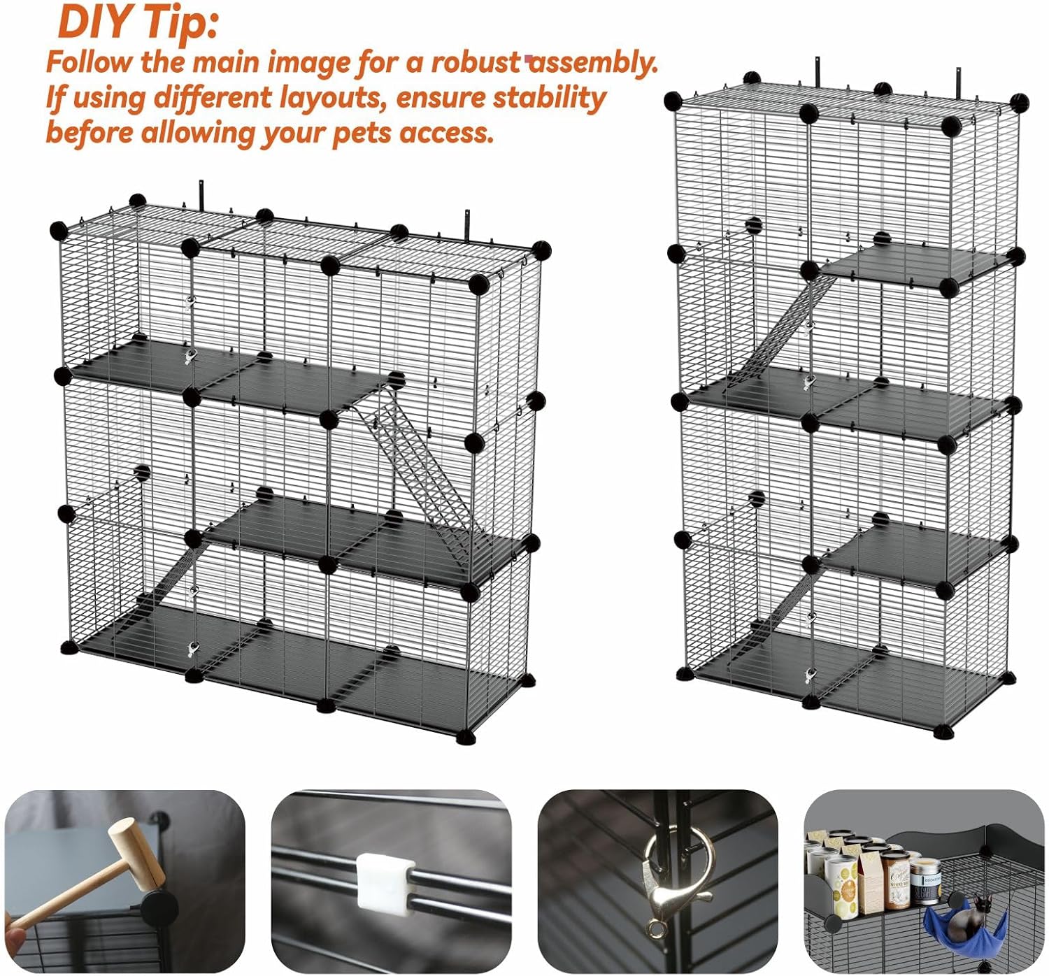 About this item Warning: The cat cage comes with 20 cable ties, 30 plastic clips, and a wooden mallet to enhance stability. Please make sure to use all of them to securely fasten the wire panels before placing your pets inside. Storage Space: The top measures 29.52" x 15.35", offering ample space to store pet food, toys, and other supplies efficiently. It can hold up to 11 pounds, making it also perfect for displaying flowers or home decor. Keep your space neat and organized. Spacious & Comfy: Measuring 27.9" x 14.2" x 45.3", our 2-tier cat enclosure offers ample space for 1-2 cats to play and rest. It features 2 front doors for easy cleaning, feeding, and convenient interactions. Paw-Safe Platforms: The smooth yet sturdy platforms are designed to be gentle on your cat’s tender paws. With a 1.7" bar spacing, our cage is perfect for pet cats. DIY C&C Cage: The panels we provide are enough to assemble a complete cat kennel. You can create a customized pet pen based on the different spaces and sizes in your home. › See more product details