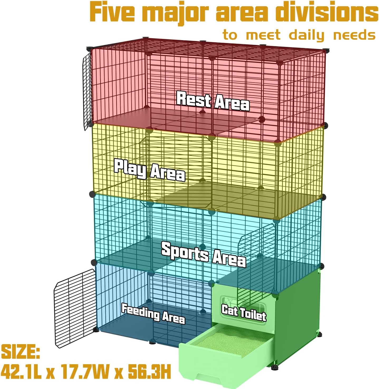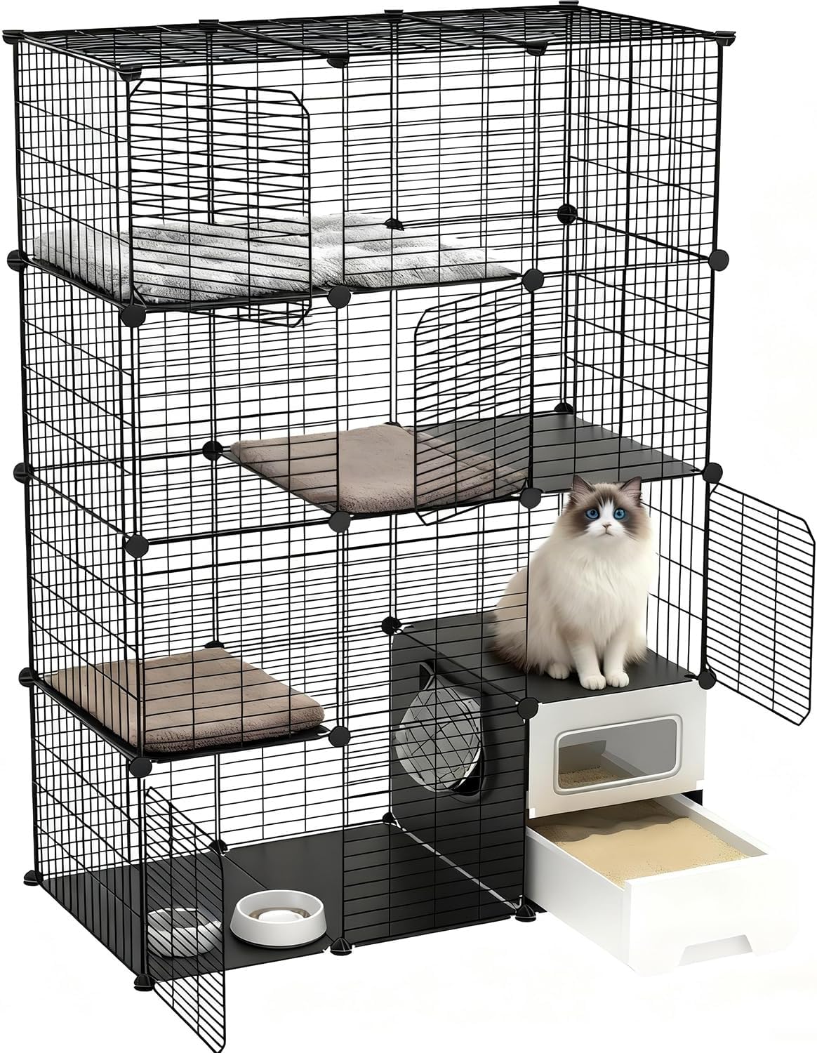About this item Spacious Cat Cage – Measuring 42.1" (L) x 17.7" (W) x 56.3" (H), this large cat playpen offers plenty of room for 1–2 cats to play, climb, rest, and explore safely. Built-In Litter Box Area – Features a separate section for your cat’s toilet, keeping it apart from the play space. No need to open the cage for cleaning—maintenance is quick, easy, and helps keep the rest of the enclosure fresh and odor-free. 4-Tier Design – Built with four levels and three sturdy platforms, this cat cage creates a safe and engaging environment. Each layer can serve as a separate space, giving your cat a variety of places to play, rest, and explore. Safe & Sturdy – Designed with seamless platforms that are gentle on your cat’s paws. The 1.2" wire spacing prevents escapes while ensuring airflow and visibility, so you can easily interact with your cat through the mesh. Multi-Door Design – Features 4 doors, with one on each level, making it easy to access your cat at any time. Convenient for feeding, cleaning, or simply taking your cat out for play and interaction. › See more product details