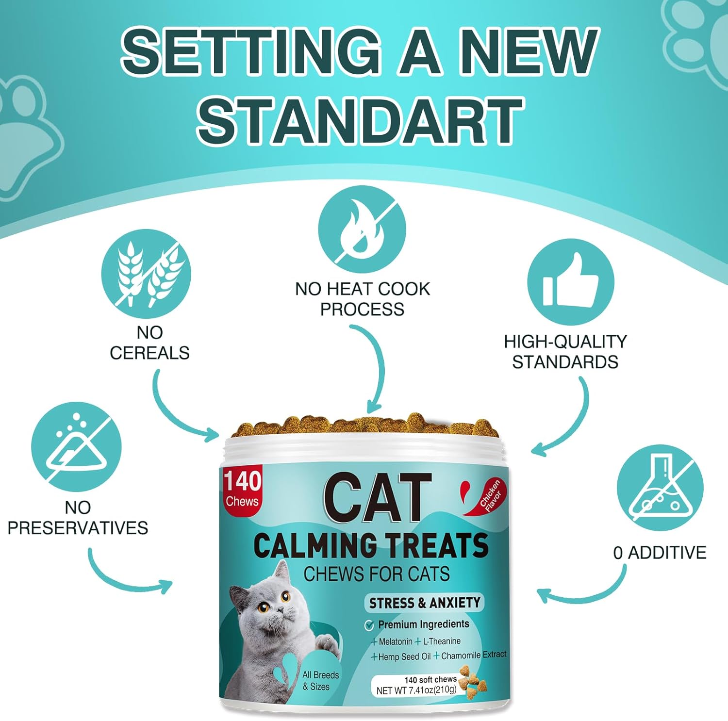 Effectively Calm and Relieve Stress: Our cat calming treats are formulated with natural plant extracts to help your feline friend stay relaxed during stressful situations like travel, vet visits, or boarding. These calming cat chews reduce anxiety, prevent scratching and biting, and promote a sense of calm. Perfect for calming care for cats, these calming cat treats are safe with no side effects, making them ideal for cat calming treats for indoor cats Delicious Chicken Flavor, Easy to Feed: Cats love the tasty chicken flavor of our calming cat treats, making feeding a breeze. No need to force-feed—simply add these calm treats for cats to your cat’s daily diet. Whether for cat calming treats for travel or calming cat treats for anxiety, these cat calming chews make the calming process enjoyable and stress-free Veterinary Recommended, Safe and Reliable: This calming cat chews is made from safe ingredients such as hemp seed oil and chamomile. Each cat calming chews is precisely measured to ensure your cat’s health and safety. Follow the weight-based feeding guidelines for cat calming treats for indoor cats to keep your cat relaxed and comfortable. These calming care for cats are a trusted solution for anxiety and better sleep Quick Onset, Suitable for Various Situations: This cat calming treats takes effect within 30-45 minutes and provides up to 12 hours of relaxation. These calming treats for cats are perfect for various scenarios, including travel, vet visits, or sudden stress spikes. Use cat calming treats for travel to ease your cat’s nerves or give calming cat chews before a vet appointment. Adjust the dosage of cat calming chews as needed to provide calming care for cats in high-pressure moments Bigger Particles, Long-Lasting Value: Each calming cat chews is 1.5g, larger than standard cat calming treats, ensuring your cat gets the full benefits. Meanwhile, soft chews are also very easy to consume. With 140 pieces cat calming chews per bottle (210g total), calming treats for cats offer long-term emotional balance and mental health support. Perfect for calming cat treats for anxiety and maintaining a serene environment for your furry friend › See more product details