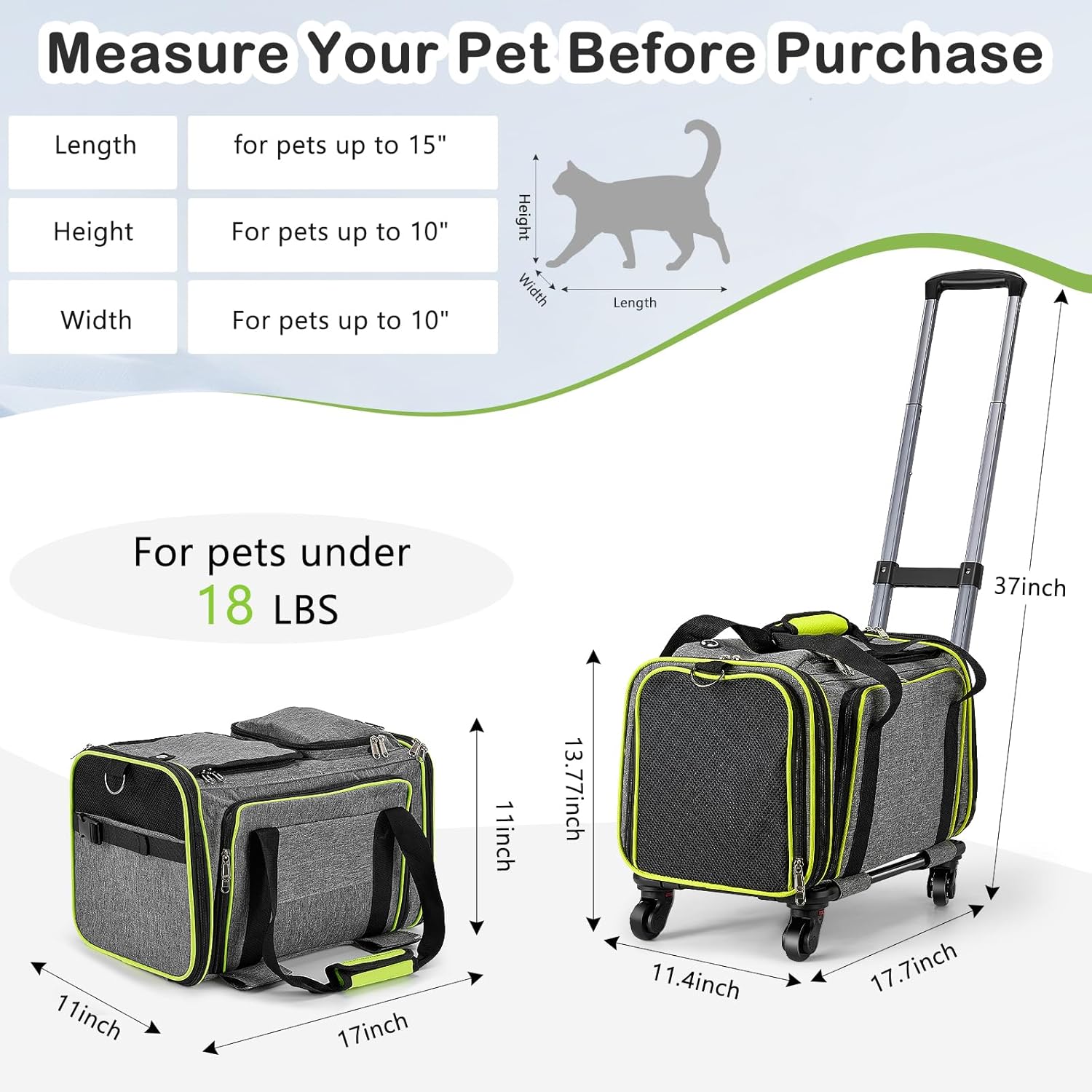 About this item Effortless Mobility with Removable Wheels: The Feestars Wheeled Pet Carrier glides smoothly through airports, parks, and city streets, eliminating the strain of carrying pets. Compact yet spacious (17"x11"x11"), this rolling cat carrier securely accommodates cats under 18lbs or smaller dogs. Its sturdy steel frame locks firmly in place, while the 360-degree removable wheels allow effortless maneuverability in crowded spaces. Detach the pet carrier with wheels from its base for easy hand-carrying or reattach it in seconds using heavy-duty hook-and-loop fasteners, Note: If you use this for your dog, you must measure the size carefully Airline-Approved Expandable Design: This airline-approved dog carrier with wheels fits most cabin seats and features a soft interior pad for ultimate comfort. The expandable mesh sides create 30% more space for pets to stretch, while enhancing airflow during hot weather. Designed as both a cat carrier bag and a pet stroller, its sleek structure balances portability and functionality—perfect for road trips, outdoor adventures, or daily errands. Detachable & Versatile Functionality: Secure it to the removable rolling base with hook-and-loop straps for smooth gliding, or detach it for lightweight hand-carrying. The 360-degree swivel wheels (easy to install/remove) tackle any terrain, while the padded top handle and adjustable shoulder strap offer flexible carrying options Breathable & Durable Construction: The airline-certified rolling pet carrier is constructed from scratch-resistant materials, with mesh windows on both the top and sides to ensure excellent ventilation and clear visibility. During hot weather, the side zippered panel can be opened to expand the living space and create additional ventilation access points Versatile All-in-One Carrier: This is a versatile pet carrier designed for outdoor adventures, road trips, and air travel. Certified for aviation use, it seamlessly integrates a wheeled base to transform into a pet stroller. When the base is removed, it can be used as a car seat or an in-cabin transport box. The foldable frame makes it easy to store. The wheeled cat carrier comes with a reinforced handle and an adjustable shoulder strap, offering flexible carrying options. Whether you’re hiking or flying, it’s a great companion for traveling with your pets › See more product details