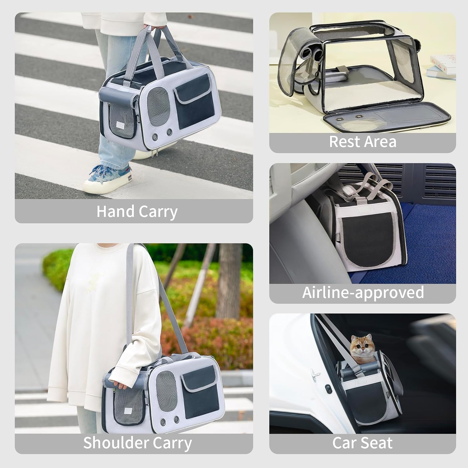 About this item : Designed for pets up to 15 lbs, this large cat carrier offers ample room for your pet to move comfortably. When not in use, it folds compactly for hassle-free storage, saving valuable space. : Our pet carrier for cats is crafted from premium, durable Oxford fabric with precision stitching for added strength. The specially designed 3mm thickened base provides extra support, allowing your pet to stand comfortably without the base sagging. : The roll-up curtain creates a calm, insulated retreat, perfect for sensitive or anxious pets. It blocks noise to reduce stress while retaining warmth for a cozy, relaxing environment. : Our dog carriers for small dogs includes a reversible mat for year-round comfort, keeping pets warm in winter and cool in summer, with a machine-washable design for easy cleaning. It also features a large front pocket for treats, toys, and other essentials, ensuring convenience on the go. : With ventilation openings on all four sides—including top, left, right, and front—this cat carrier ensures complete airflow, keeping your pet comfortable, relaxed, and well-ventilated during travel. : Carry this pet carrier bag by the sturdy handle or use the adjustable shoulder strap for hands-free convenience. The strap also secures the carrier safely in a car seat, providing peace of mind on every journey. › See more product details