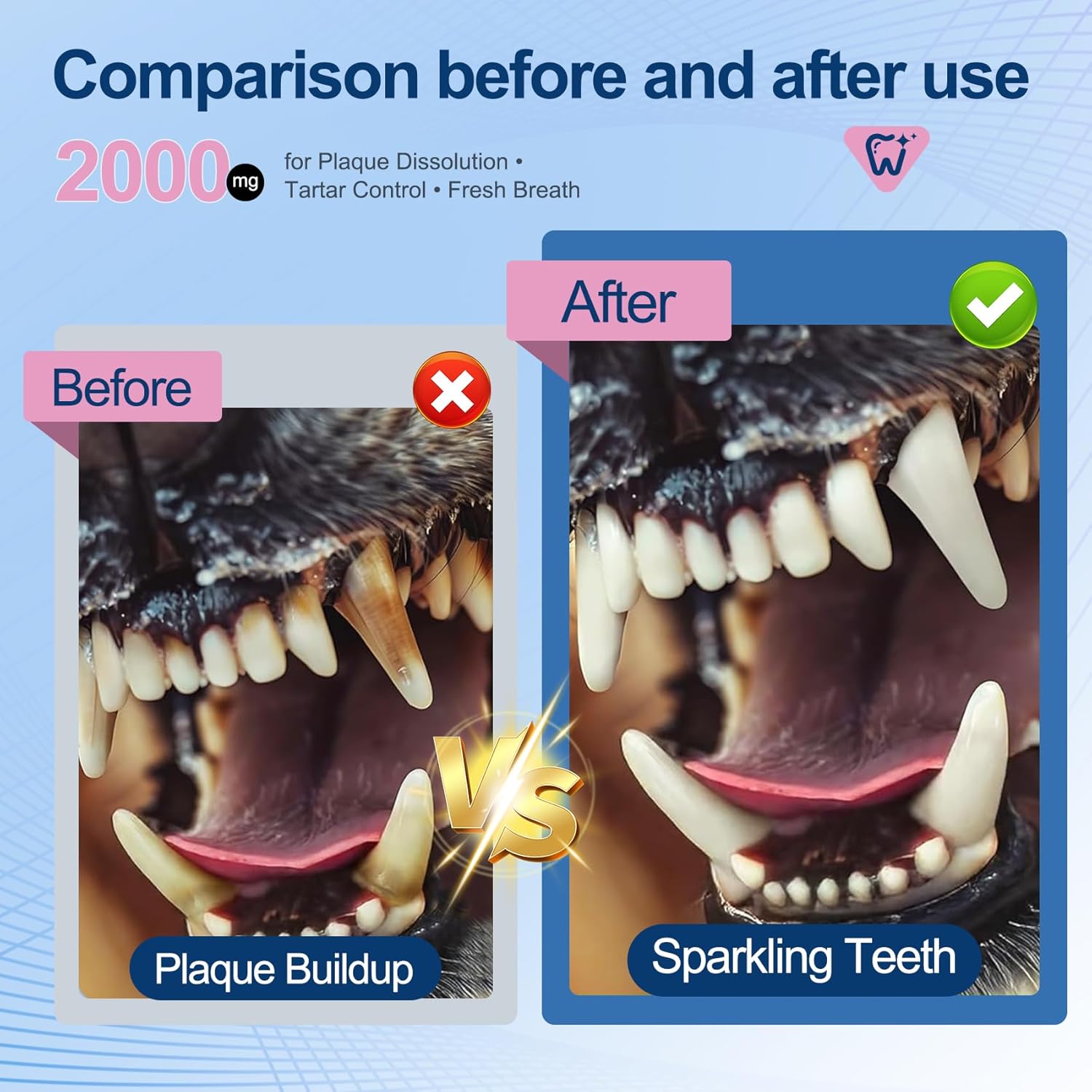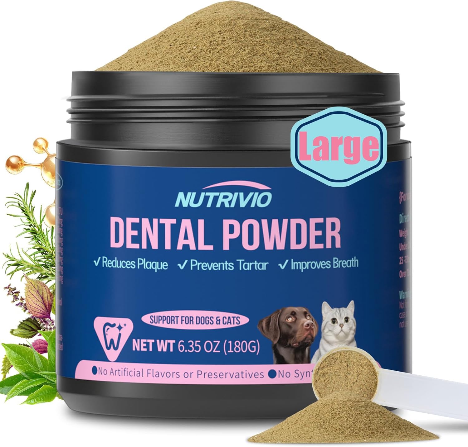 About this item All-Round Oral Care for Dogs and Cats – Enriched with 100 Million CFU Probiotics and botanical Actives, this powder targets oral issues at the root—reducing plaque and tartar buildup, repairing gums, and strengthening teeth. It effectively safeguards the oral health of dogs of all ages and lowers the risk of common dental problems in adult pets. Long-Lasting Fresh Breath Solution – By neutralizing odor-causing microbes in the mouth, the powder delivers long-term fresh breath for dogs. Say goodbye to stinky dog breath and enjoy more pleasant cuddle time with your furry friend. Hassle-Free Usage (No Brushing Needed) – Simply mix the powder into your dog’s daily food—no more struggling with toothbrushes or dealing with pet resistance. It works through saliva to clean the mouth, fitting easily into your daily feeding routine. Great Palatability – Micro-powder dissolves instantly with natural yucca extract for enhanced palatability-ideal for finicky pets, making oral care a stress-free process.Morning dosing recommended for 12-hour antibacterial efficacy. Natural Safety & Vet Approval – Nutrivio upholds the philosophy of "science-backed formulas to safeguard natural nutrition",sourced from premium global ingredients, grain-free, non-GMO formula with zero corn/soy/artificial colors. Meet AAFCO nutritional standards and vet-approved, it’s suitable for all dog breeds and even cats. › See more product details
