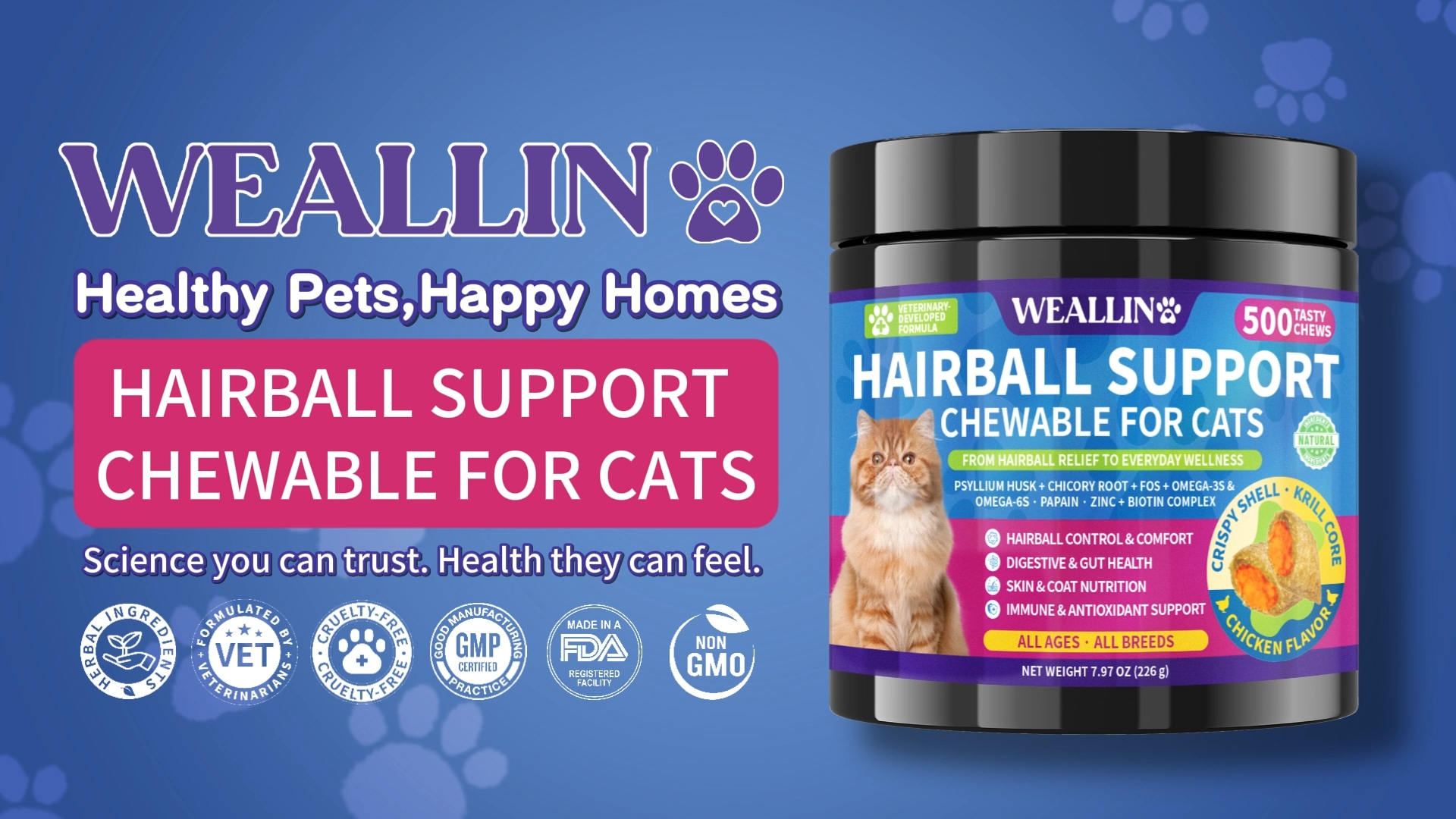 About this item Hairball & Digestive Care · Krill Core + Chicken Flavor: Formulated for cats of all breeds and ages, these cat hairball chews help manage hairballs from the inside out. With psyllium husk + dual prebiotics (FOS & chicory root) + papain, the formula helps smooth hair passage through the digestive tract, reduces hairball formation, and promotes healthy digestion. WEALLIN hairball remedy treats for cats has a crispy shell with a krill-infused core and savory chicken flavor — easy to digest and loved by picky eaters. Flexible Feeding · Treat-Like Experience: WEALLIN’s small, crispy hairball relief chews for cats are designed to be given in multiple pieces per day (about 1 chew per 1 lb of body weight). This small-piece format makes care more precise and gentler for cats, while also working perfectly as training rewards or bonding treats. Digestive support and hairball care become a natural, enjoyable part of your cat’s daily routine. Hairball Control & Digestive Balance: Packed with psyllium husk adds soluble fiber to move ingested hair through the gut naturally, reducing buildup and hairball-related discomfort. Chicory root and FOS act as prebiotics that nourish the beneficial gut, improving digestion, nutrient absorption, and stool quality. Consistent daily use helps minimize vomiting and constipation caused by hair accumulation. Skin & Coat Nutrition · Immune: With flaxseed oil rich in Omega-6, fish oil rich in Omega-3, zinc and biotin, these hairball remedy chews for cats go beyond enhancing immunity to nourish skin and coat. WEALLIN hairball treatment chews for cats help reduce shedding, enhance coat softness and shine, support immune balance, and maintain visible wellness from the inside out. 500 Chews · Long-Term & Multi-Cat Friendly: Each jar contains 500 crunchy, krill-core chews for cats— ideal for long-term daily support or multi-cat households. WEALLIN hairball support chews for cats turn hairball care into a sustainable, treat-like experience cats love and pet parents trust. › See more product details