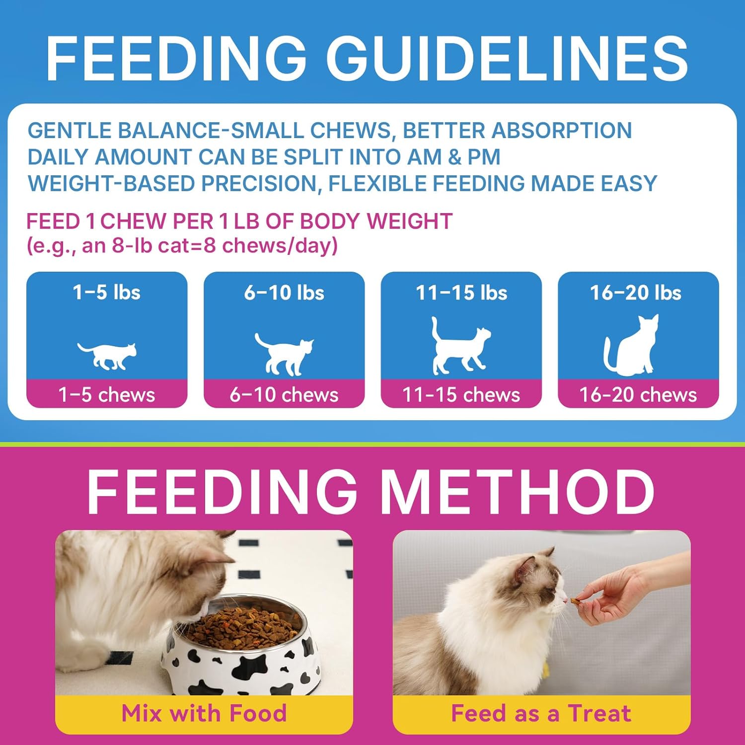- Directions: For cats only. Keep out of reach of children. Begin by offering the chews directly as a treat, or mix them with your cat’s regular food for easier acceptance. 1 chew per 1 lb of body weight daily. The daily amount may be divided into morning and evening feedings. For first-time use, start with half the suggested amount on day one for observation, then gradually increase to the full amount over the next few days.