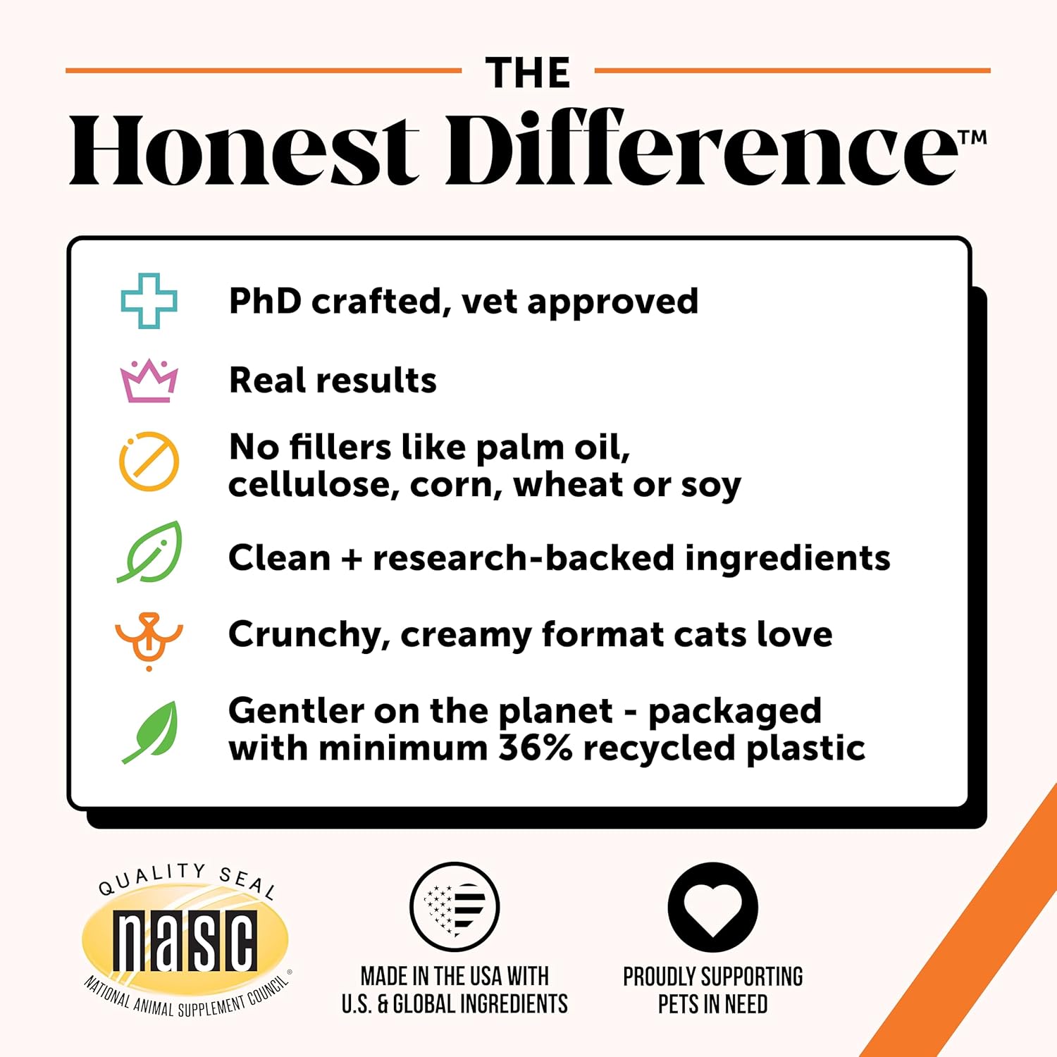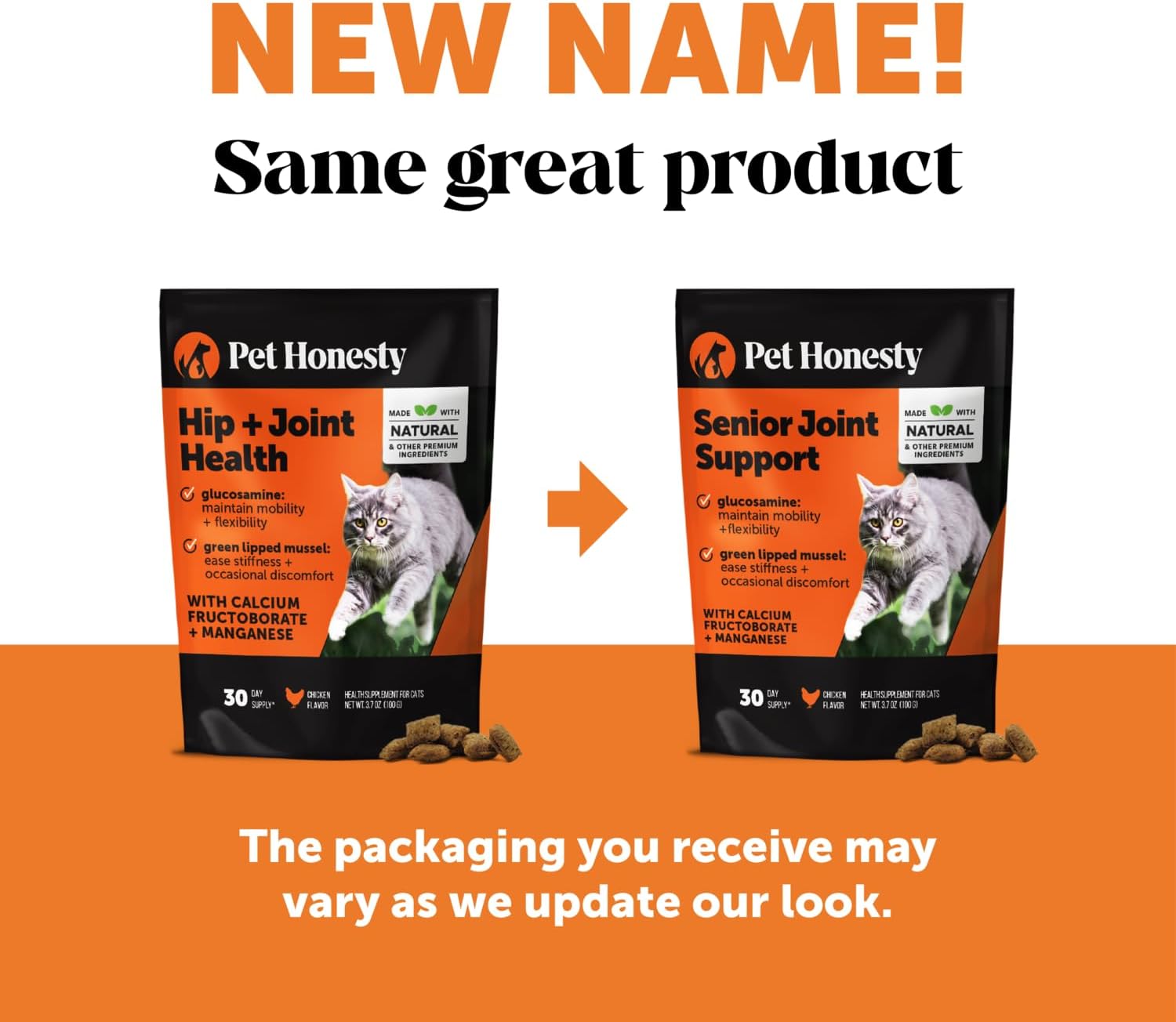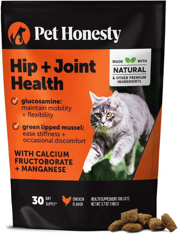 About this item POUNCE ON & ON: Help your cat stay playful, mobile, and active at any age. Pet Honesty’s Hip + Joint Health Chews support flexibility and joint comfort by helping relieve stiffness and promote easier movement. These tasty daily supplements help your furry family member leap, climb, and play with ease—so they can pounce on joy every day. THE INSIDE SCOOP: Formulated with powerful, natural ingredients like glucosamine, chondroitin, omega-3s, and green-lipped mussel, these chews help maintain healthy cartilage and joint fluid while easing occasional stiffness from daily activities. Our joint supplements also include antioxidants that support immune and joint wellness from the inside out—for smoother motion and longer-lasting comfort. REAL RESULTS, REAL JOY: Trusted by cat parents and recognized as the 2022 Cat Supplement of the Year by the Pet Business Industry Recognition Awards, these easy-to-give chews deliver science-backed benefits that keep your cat purring and pouncing. Designed for both indoor and outdoor cats, they help support healthy joints through every jump, stretch, and chase. DROOL-WORTHY TEXTURE: Not only do these crunchy, creamy chews support mobility and joint health—they taste amazing, too! In fact, 9 out of 10 cats love the flavor*. Give them as a daily oral chew or crumble over meals for easy serving. Your cat will think it’s a treat—while you’ll know it’s helping them feel their best. THE HONEST DIFFERENCE: Our products are made with clean, science-backed ingredients for results you can trust, & with no fillers, artificial preservatives, colors, or flavors, you'll have no doubt your cat is getting the best. Proudly supporting pets in need nationwide & using recycled plastic in our packaging, there's also no doubt that we're committed to doing our best. -- All products are manufactured in the U.S.A. | NASC Member Company. › See more product details