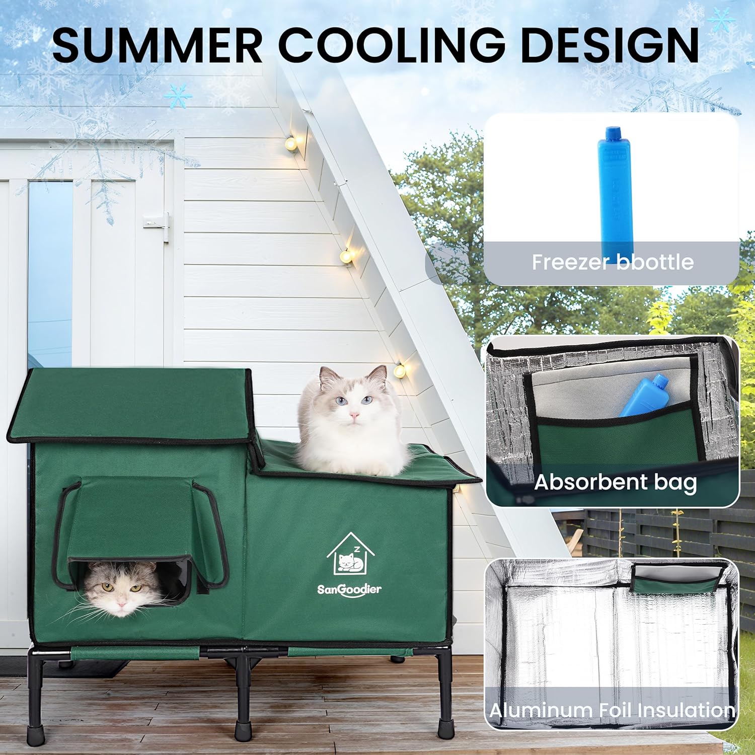 About this item Waterproof Design: Crafted from 600D high-density Oxford fabric and PP panel, combined with 0.3-inch thick pearl cotton and aluminum foil insulation layers, this cat house forms a rugged waterproof barrier to effectively repel rain and moisture. The dual-security system of zippers and hook-and-loop fasteners keeps the interior dry even in harsh weather conditions. Cat-Friendly: With a fully enclosed structure and a 5-inch elevated base, the cat shelter mimics natural den behavior, offering a secure hiding place that relieves stress. The enclosed design satisfies cats' exploratory instincts while allowing them to observe the surroundings through the window—ideal for both privacy-seeking and curious felines. Insulation layer for Winter: Thanks to the thermal insulation of the aluminum foil and EPE foam layers, it can create a warm microenvironment to protect cats from the cold. Easy Assembly & Portability: This outdoor cat shelter requires no tools for effortless disassembly and installation. When folded, it occupies minimal space, making the tent-style shelter easy to store and carry. Suitable for both outdoor use and indoor spaces like garages, balconies, and hallways, this weatherproof shelter offers versatile protection for cats in any environment. Ideal for Multi-Cat Households: The large size can support up to 35LB, comfortably accommodating 2-3 cats at once with ample interior space.Suitable for various outdoor settings such as balconies, courtyards, or barns, it provides a communal shelter for multiple cats, making it perfect for stray cat colonies or households with several feline companions. › See more product details