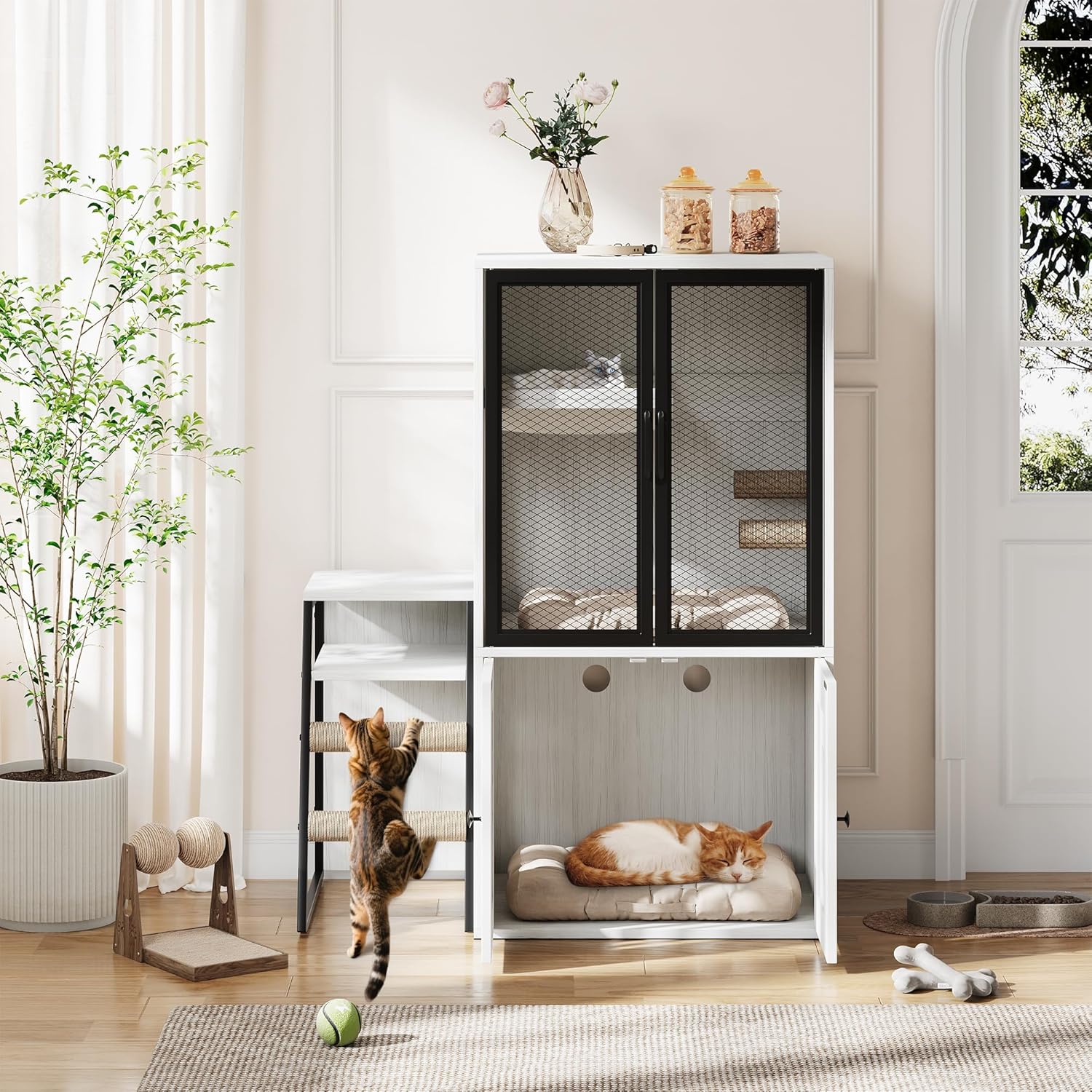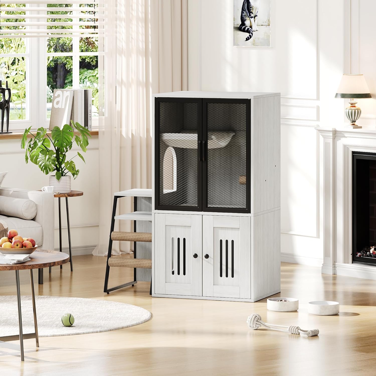 All-in-One Cat Haven :This sleek litter box enclosure combines a hidden litter area, cozy cat house, and storage cabinet in one. Gives your cat privacy while keeping your home tidy—perfect for storing supplies, hiding litter, or serving as a comfy nap spot. Interactive Play & Relaxation:Features a sisal scratching ladder, built-in hammock, and play area with a sisal post. The rounded-entry hole ensures safe access, encouraging play while protecting paws. Durable & Pet-Safe Build:Made with sturdy MDF and reinforced metal, designed for stability with an anti-tip base. Ventilation holes improve airflow, while the felt-padded bottom prevents floor scratches. Odor-Controlled :Discreetly blends into any room (living room, bedroom, or laundry room). The enclosed design traps litter and reduces odors, keeping your space clean and stylish. Easy Assembly:Space-Saving – Compact size (22.6" L × 17.7" W × 40.9" H) fits small spaces. Includes labeled parts & clear instructions for quick setup. › See more product details