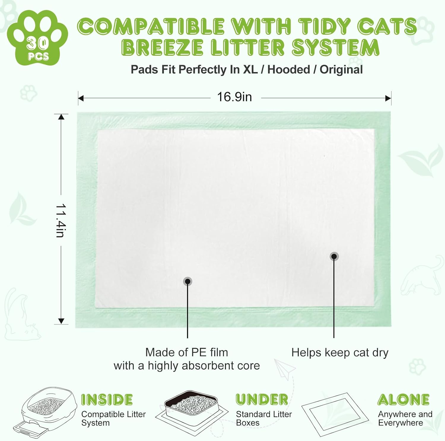 About this item 【Compatible Model】: Compatible with Tidy Cats Breeze Litter Box(XL/Hooded/Original). The size is 16.9" x 11.4", totally 30 PCS. 【Ultra Absorbent】: The 6-layer thickened design and super absorbent SAP core help absorb the liquid better. Each cat pad refills can hold up to 15 cups urine. 【Odor Control】: Topfeel cat pad refills for litter cat box are designed with fast-drying technology to prevent urine spills, and the fresh tea scent can help control the unpleasant odors very well. Each pads can last for 2 or 3 days. 【Easy to Replace】: The bottom of the cat pee pad is made of PE film and will not leak at all. We can replace easily within seconds. 【Economical Choice】: If you experience any issues with our cat pads, please do not hesitate to contact us. We will offer 24 hours customer service for u. › See more product details