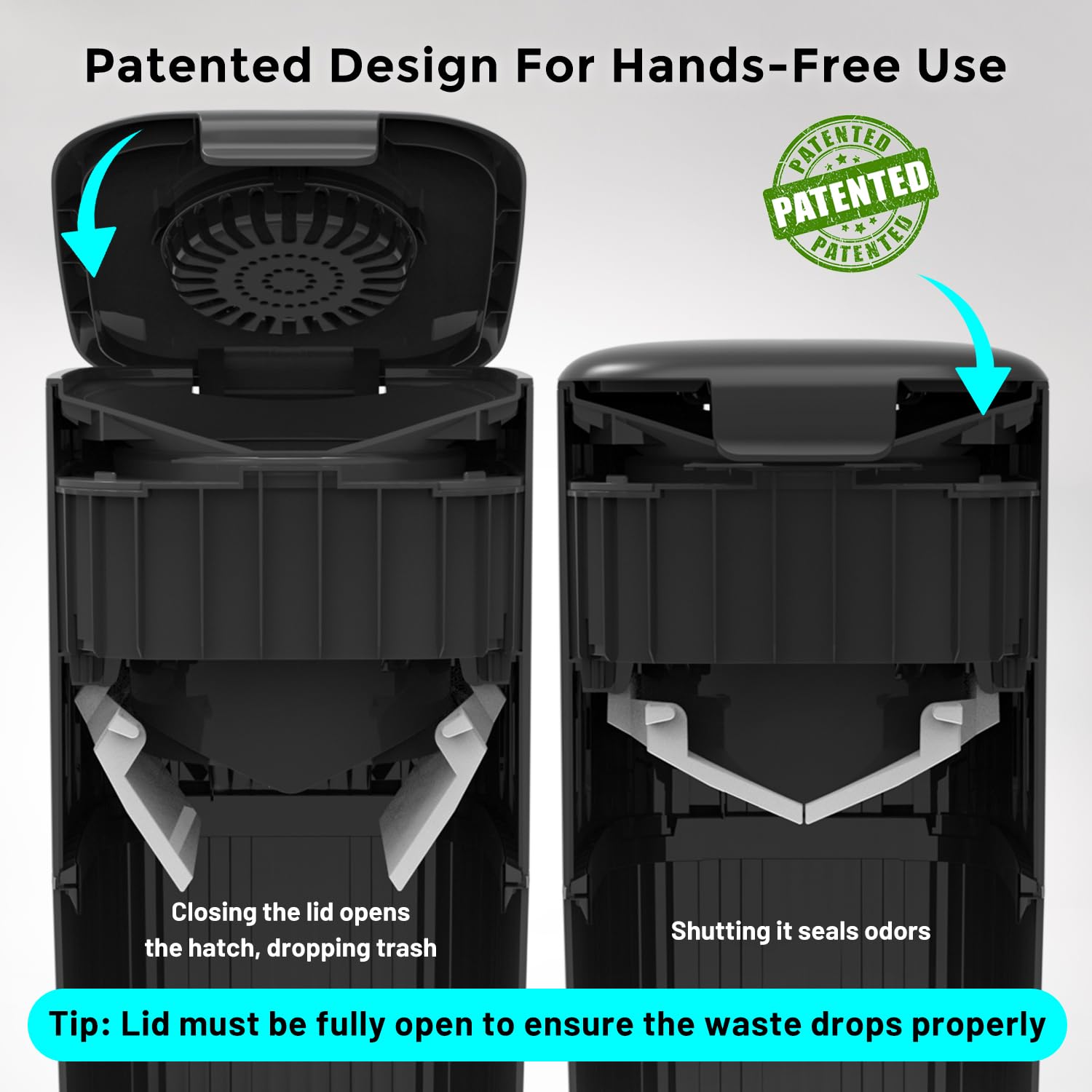 About this item Hands-Free Patented Structure: Scoop clumps directly from the litter box into the disposal bin. Simply close the lid—all operations completed single-handedly. A revolutionary design that keeps your space perpetually fresh! Effortless Cleaning: Never make daily trash runs again! This litter waste receptacles holds up to 7 days' worth of litter waste (for one cat), freeing up your time to play with your cat—not clean up after it. Triple Odor Isolation: The litter trash can is of a sealed structure, and it is equipped with a replaceable filter box inside. The inner isolation plates can ensure that the odor is completely locked at the bottom. Complete containment of unpleasant smells. Upgraded Features: Four detachable suction cups secure the base against pet tipping; Reversible scoop storage design (left/right placement per user preference) 2 Refill Cartridges: Our enhanced multi-layer refill bags feature Odor Barrier Technology that locks odors inside the used litter, ensuring your home stays fresh and odor-free. The dual-color design (black interior) provides added privacy Package Includes: 1 patented waste disposal bin, 2 refill cartridges (60ft total, lasts 36 weeks for one cat), 1 scoop with holder, 1 charcoal filter pack Tips: 1, Lid must be fully open to ensure the waste drops properly;2, When replacing the bag, ensure it's long enough the cat litter(approx. 18 inches after tying, reaching the bottom); 3, If waste won't drop or the door won't close, check and adjust the bag. › See more product details