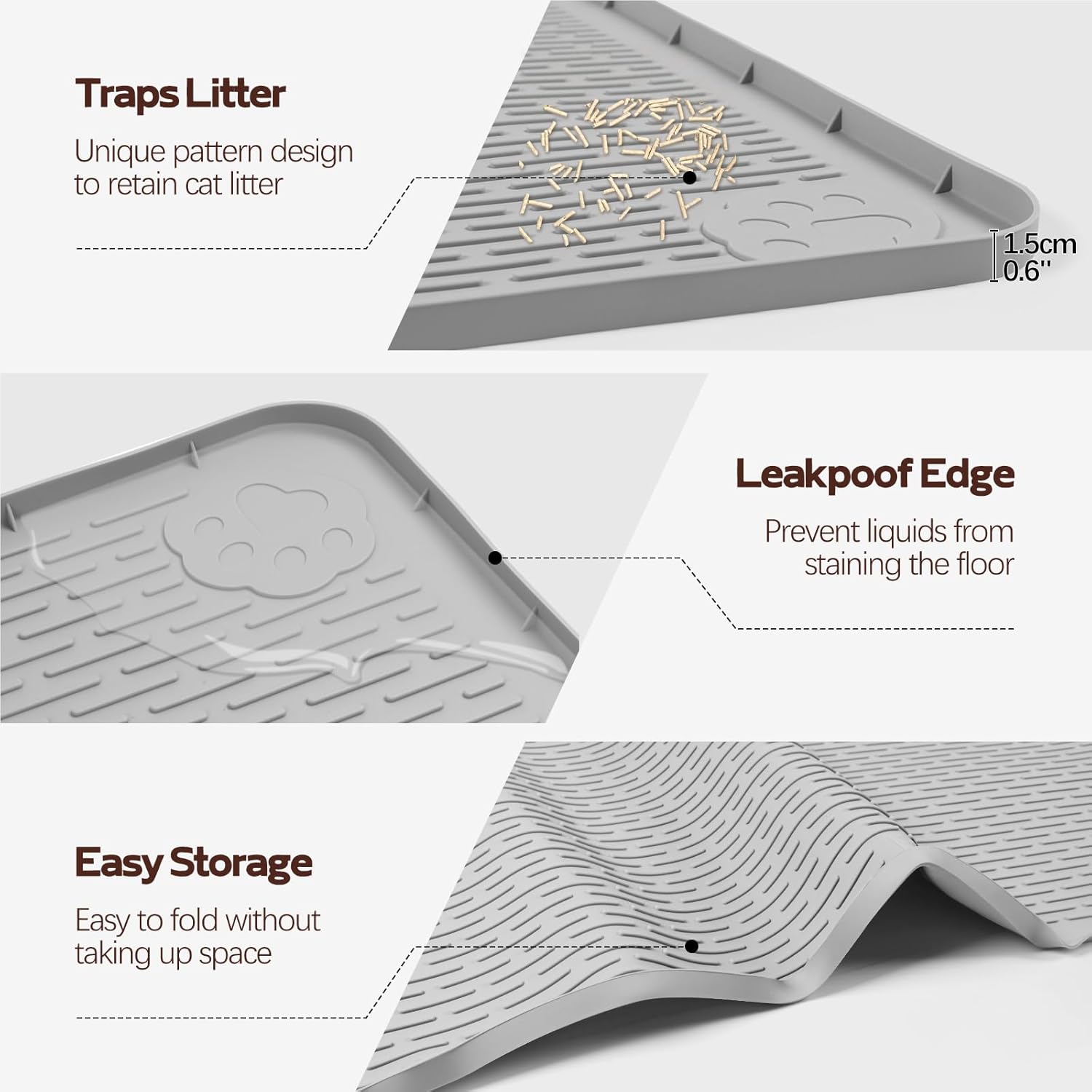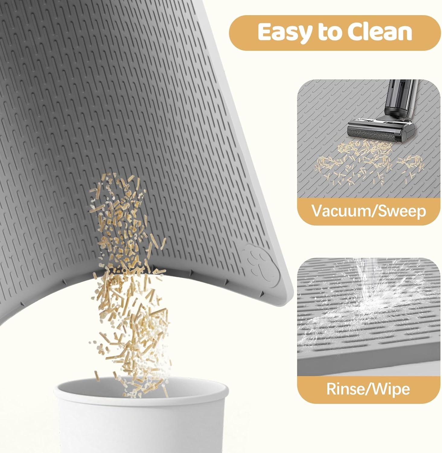 Bartuke cat litter box silicone mat is designed for convenience and cleanliness. Its large size (34"x22"/86.4 x 56 cm) fits most litter boxes, ideal for multi-cat homes. Made of soft silicone, it protects floors and is easy to clean. The textured surface traps litter. It can also serve as a feeding mat, making it a practical addition to any cat owner's home.