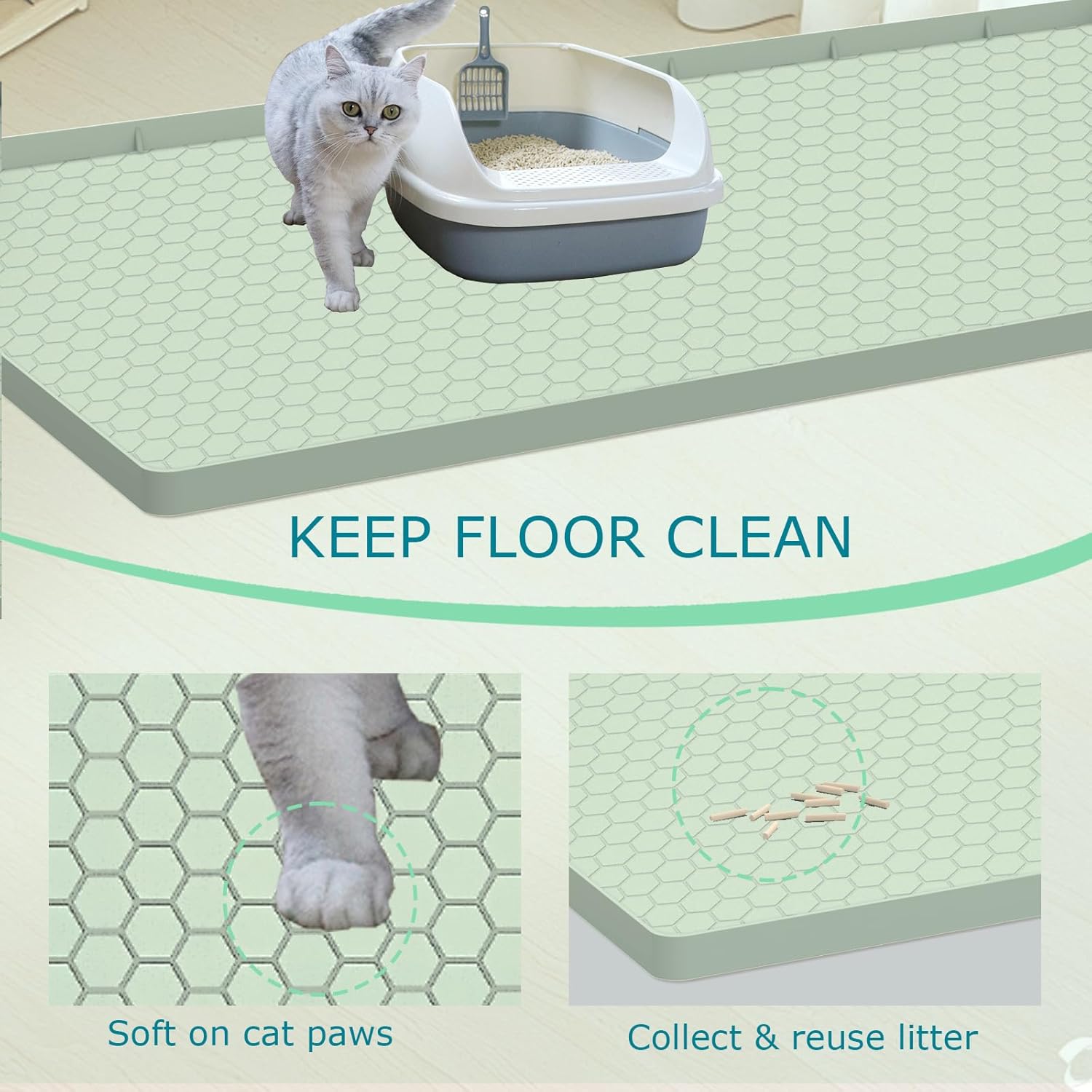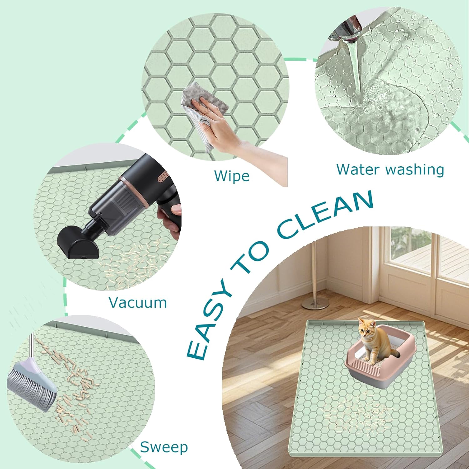 Designed for cat owners who value convenience and hygiene, keep your home clean with our silicone cat litter mat. 1. Premium Silicone Material: Made of food-grade silicone, safe for pets, flexible yet durable, resists scratches, tears 2. Stop Litter Tracking: Cat litter mat with raised edges trap scattered litter, keeping floors clean and reducing daily cleanup 3. Easy to Clean: Cat mat for litter box is easy to clean and sweep with a broom or vacuum, just rinse with water or wipe with a damp cloth for hassle-free maintenance 4. Pet-Safe: Non-toxic and soft on paws, perfect for kittens and senior cats