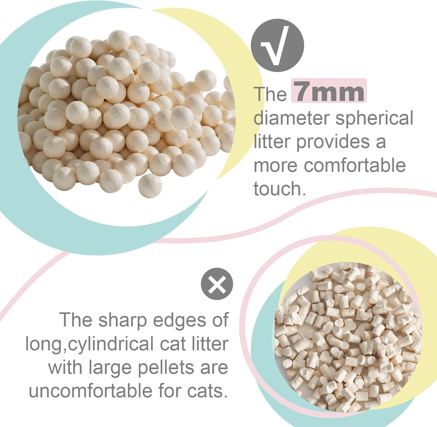 About this item The 7mm diameter spherical pellets help reduce litter tracking, keeping your floors cleaner. Larger 7mm pellets provide more comfort under your cat’s paws compared to smaller granules. Designed to stay in the litter box, minimizing the amount of litter your cat carries out. Enjoy improved cleanliness with reduced litter scatter around your home. The new 7mm size ensures better control over where the litter stays, making cleaning easier. While the size increased, the litter still retains its excellent odor control properties. Ideal for cats who prefer larger pellets for a more comfortable stepping surface. Resealable packaging keeps your litter fresh and dry, just like before. If you're not completely satisfied, please contact us for support—we’re happy to help! Show more › See more product details