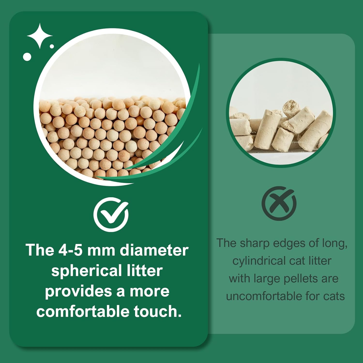 About this item Compatible with various layered litter systems, perfect for pet owners looking to reduce cleaning time. Made of Zeolite mineral, a natural odor eliminator. 4.5mm diameter spherical granules are designed to be more comfortable for cats to step on compared to larger cylindrical granules, making them more appealing for kittens to use. Smaller granules with a 4mm diameter have more surface area compared to larger cylindrical granules of the same weight, providing better odor control by absorbing cat urine odors more effectively. 9lb per bag, larger capacity, allows for more litter to be poured at once. The bag features a resealable closure at the opening to prevent unused litter from getting damp. Dust-free: The litter undergoes a dust removal process before packaging, leaving the granules virtually dust-free. Spherical design is less likely to be tracked out by cats, and any minimal tracking is easy to clean with a vacuum. Due to its spherical shape for better paw comfort, it may be more likely to be kicked out of the box (consider our new larger-pellet litter with stronger odor control as an alternative). If you have any dissatisfaction with our product, please let us know promptly. We will provide corresponding services to address your concerns. Show more › See more product details