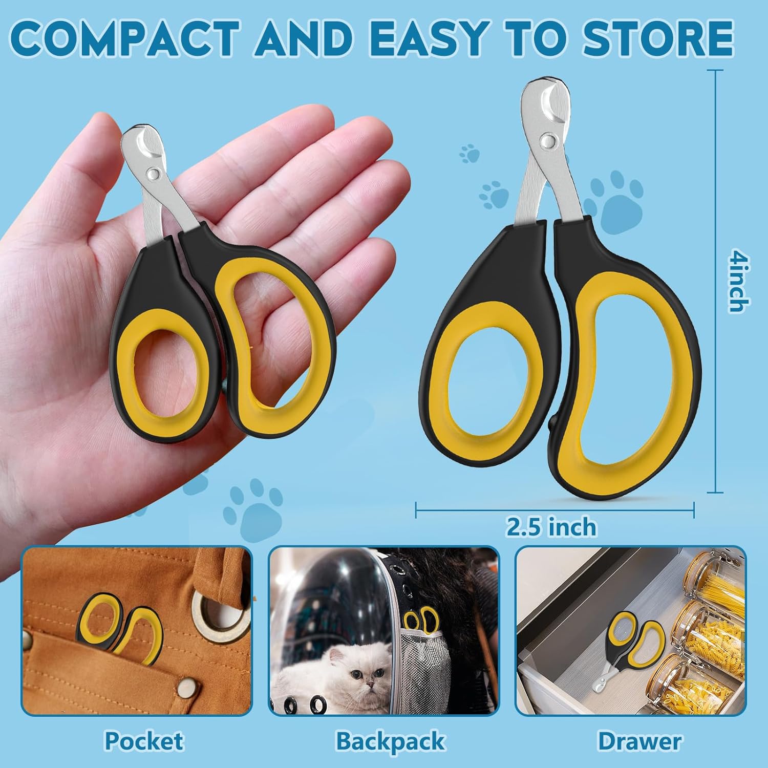 Welcome to FJCTER, where we focus on making pet care easier, safer, and more comfortable—right from the comfort of your home. Keep your pet’s claws healthy and your furniture scratch-free with our professional-grade Cat Nail Clippers—specially crafted for small pets like cats, kittens, rabbits, small dogs, and more. ✔ Perfect for Small Pets: Designed for cats, kittens, puppies, rabbits, birds, ferrets, hamsters, and other small animals—not suitable for medium or large dogs. ✔ Sharp Stainless Steel Blades: Delivers quick, clean cuts with minimal pressure—no splitting, crushing, or pulling. ✔ Ergonomic Non-Slip Handle: TPR-coated handle fits naturally in your hand, offering excellent grip and better control. ✔ Flat-Tip Blade Design: Unlike curved blades, the flat tip is versatile and easy to use on different nail shapes and sizes. ✔ Compact and Lightweight: Measuring 4” x 2.5”, the clipper is easy to handle and maneuver around tiny claws. ✔ Smooth & Stress-Free Grooming: Trims nails quickly, helping reduce anxiety in pets during grooming time. ✔ Secure Assembly: Built under strict quality standards—no loose parts or unstable components. ✔ Safe for Indoor Use: Ideal cat nail clippers for indoor cats and other small pets who need regular grooming at home. PARAMETER/SPECIFICATION: Color: Black/Yellow Size: 4” (L) x 2.5” (W) Blade: Stainless Steel Handle: ABS + TPR Rubber Grip Recommended Use: Cats, Kittens, Small Dogs, Rabbits, Birds & Other Small Animals SAFETY TIPS: ➤ Always trim in a well-lit area and keep your pet calm during grooming. ➤ Use only as directed and avoid trimming too close to the quick. ➤ Keep out of reach of children and store in a dry place after use. ➤ If unsure, consult a vet or professional groomer before first use.