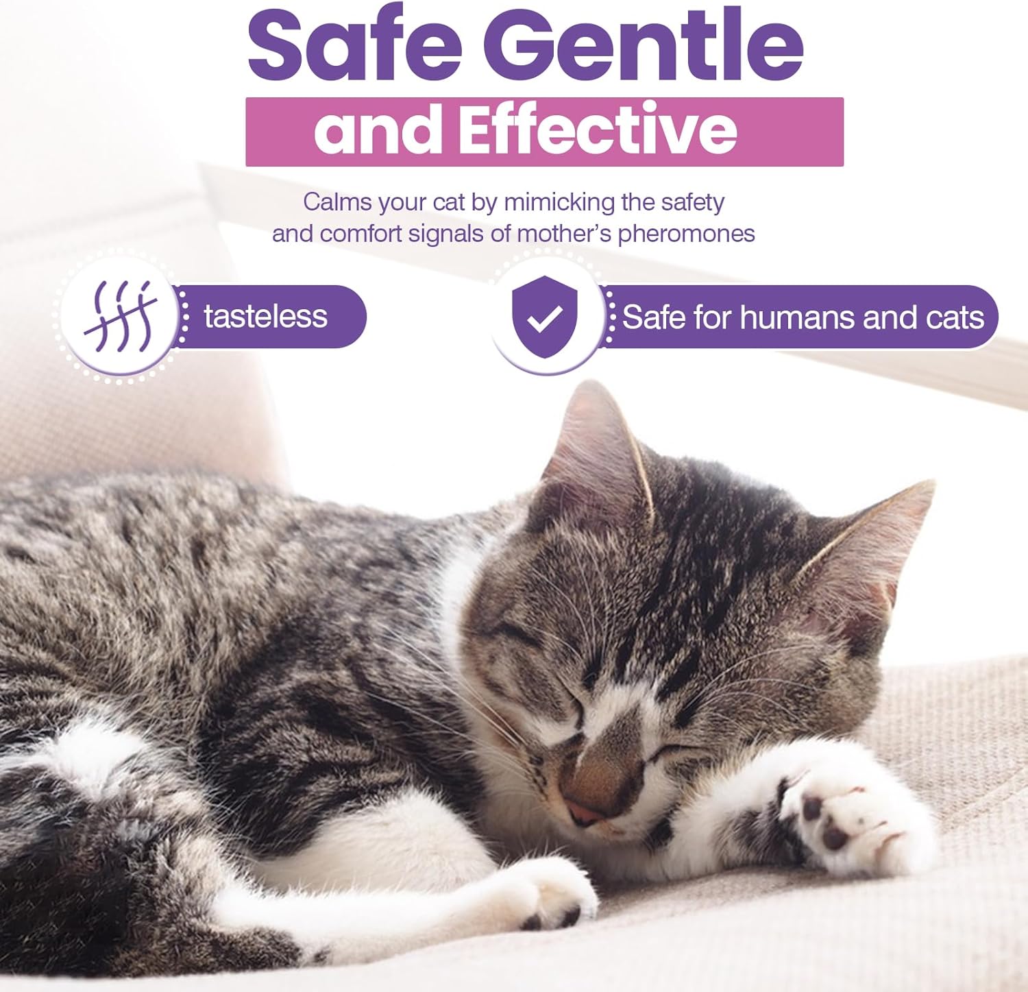 Kind tips:1. It is best to replace the cat calming diffuser plug in every 60 days2. Please keep the diffuser refill away from fire sources and children3. Do not swallow it. If swallowed by mistake, please seek medical attention immediately4. Please always keep the air outlet upward when inserting the cat calming diffuserCat pheromones calming diffuserCat calming diffuser will soothe and relax the nervous cat. And cats are naturally territorial, relying on cat pheromones to mark an area or object as familiar. Cat pheromone diffuser mimics the pheromones released by the mother, releasing a continuous release of odorless, non-toxic vapors that mimic cat pheromone to signal safety. So when cats feel safe, behaviors like cat fighting, scratching and urine marking decrease. Most cats show improved behavior after 2 weeks of using cat diffuser calming.6 Pack cat pheromones calming diffuser refillNever again worry about cats fighting, hissing, or showing signs of tension and conflict, pheromone diffuser for cats will help you solve these problems. Cat pheromones calming diffuser refill will provide your cat with calming enjoyment for up to 180 days. Pheromone Diffuser to Calm CatsCat pheromones calming diffuser is veterinarian recommended and perfect for pet parents with more than 1 cat household or considering adding another cat. Cat calming diffuser is very easy and portable to use, just plug the cat pheromones calming diffuser upright into an unobstructed outlet, away from drafts or windows, in your cat's favorite room. In larger homes, consider installing a cat pheromones calming diffuser on each floor.Configuration of cat pheromones calming diffuser refill:6 bottle cat calming diffuser refill(48ml each)*Cat pheromones calming diffuser refill kit does not include diffuser plug, only diffuser refill*