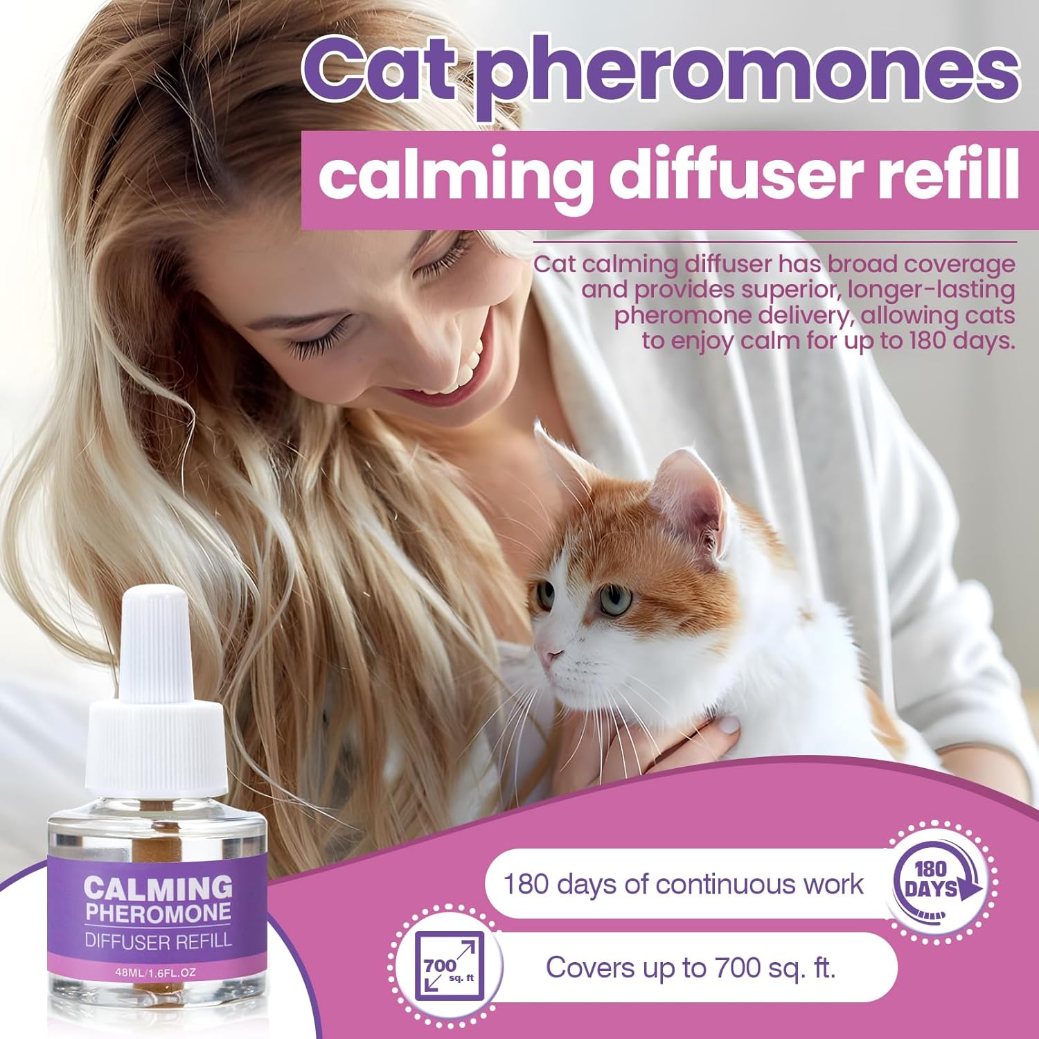 6 Pack cat pheromones calming diffuser refillNever again worry about cats fighting, hissing, or showing signs of tension and conflict, pheromone diffuser for cats will help you solve these problems. Cat pheromones calming diffuser refill will provide your cat with calming enjoyment for up to 180 days. Pheromone Diffuser to Calm CatsCat pheromones calming diffuser is veterinarian recommended and perfect for pet parents with more than 1 cat household or considering adding another cat. Configuration of cat pheromones calming diffuser refill:6 bottle cat calming diffuser refill(48ml each)*Cat pheromones calming diffuser refill kit does not include diffuser plug, only diffuser refill*Cat pheromones calming diffuserCat calming diffuser will soothe and relax the nervous cat. And cats are naturally territorial, relying on cat pheromones to mark an area or object as familiar. Cat pheromone diffuser mimics the pheromones released by the mother, releasing a continuous release of odorless, non-toxic vapors that mimic cat pheromone to signal safety. So when cats feel safe, behaviors like cat fighting, scratching and urine marking decrease. Most cats show improved behavior after 2 weeks of using cat diffuser calming.Kind tips:Cat calming diffuser is very easy and portable to use, just plug the cat pheromones calming diffuser upright into an unobstructed outlet, away from drafts or windows, in your cat's favorite room. In larger homes, consider installing a cat pheromones calming diffuser on each floor.1. It is best to replace the cat calming diffuser plug in every 60 days2. Please keep the diffuser refill away from fire sources and children3. Do not swallow it. If swallowed by mistake, please seek medical attention immediately4. Please always keep the air outlet upward when inserting the cat calming diffuser