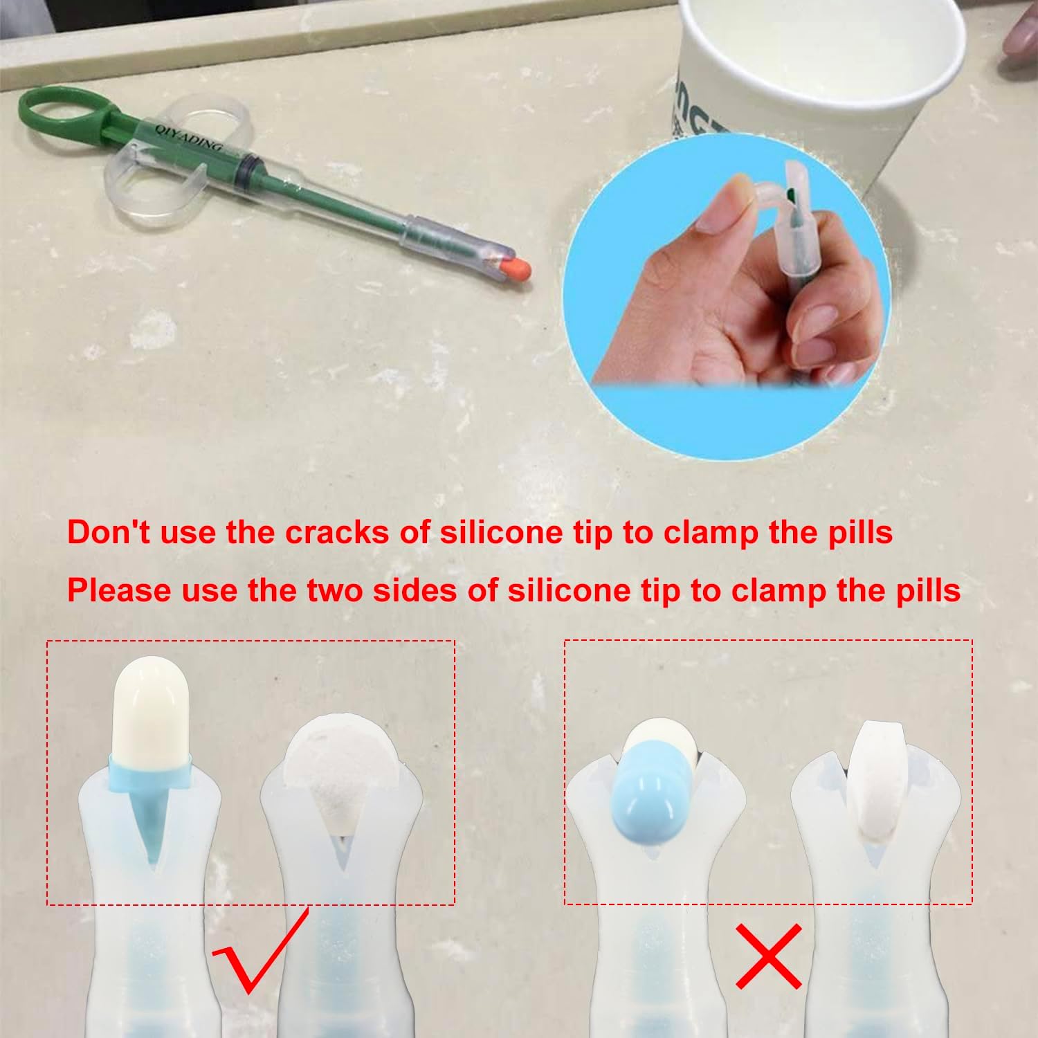 This cat pill shooter comes with two silicone soft tips. One of the tips has cracks, so the tip can be opened to clamp the pill. (don't use the cracks to clamp pills, please use the 2 sides of the silicone tip to clamp pills). Another tip has no cracks and can be used for feeding water or liquid medicine. (If the crack is not large enough to clamp the pill, you can use scissors to enlarge the crack. The tip for liquid feeding can also be cut cracks to feed the pill.) This product does not have a spring device, so the pill will not pop out quickly, but will be pushed out. Made of high quality silica gel, reusable and washable. Product size: 5.9x1.97inches. Product weight: 1.06 ounce. Especially for feeding solid medicines, pills, capsules to pets. (It's suitable for size of pill between 0.15-0.4 inches.) NOTE: 1.The soft tip must be completely sleeved on the top, ensure that it will not fall off during normal use. 2.Ensure that the tip and injection tube are in the same straight line, so that the push rod can smoothly impact on pill and push it out. 3.Do not stick the soft tips into pet's throat to prevent the tips from getting stuck in the throat. The correct use is to put the soft tip to the posterior position of tongue, then use the push rod to push out the pill and let the pet swallow it by himself. 4.Do not stuff the pill tightly into the soft tip, avoiding the pill not being able to be pushed out or the soft tip falling off with the pill. Gently clamping it is correct. NOTE: Please make sure to check all accessories and installation before use. Please try using it before use to ensure it works properly without any fault. Due to aging or wear of plastic and silicone parts over time, please replace them with new ones after 1 month of use. › See more product details