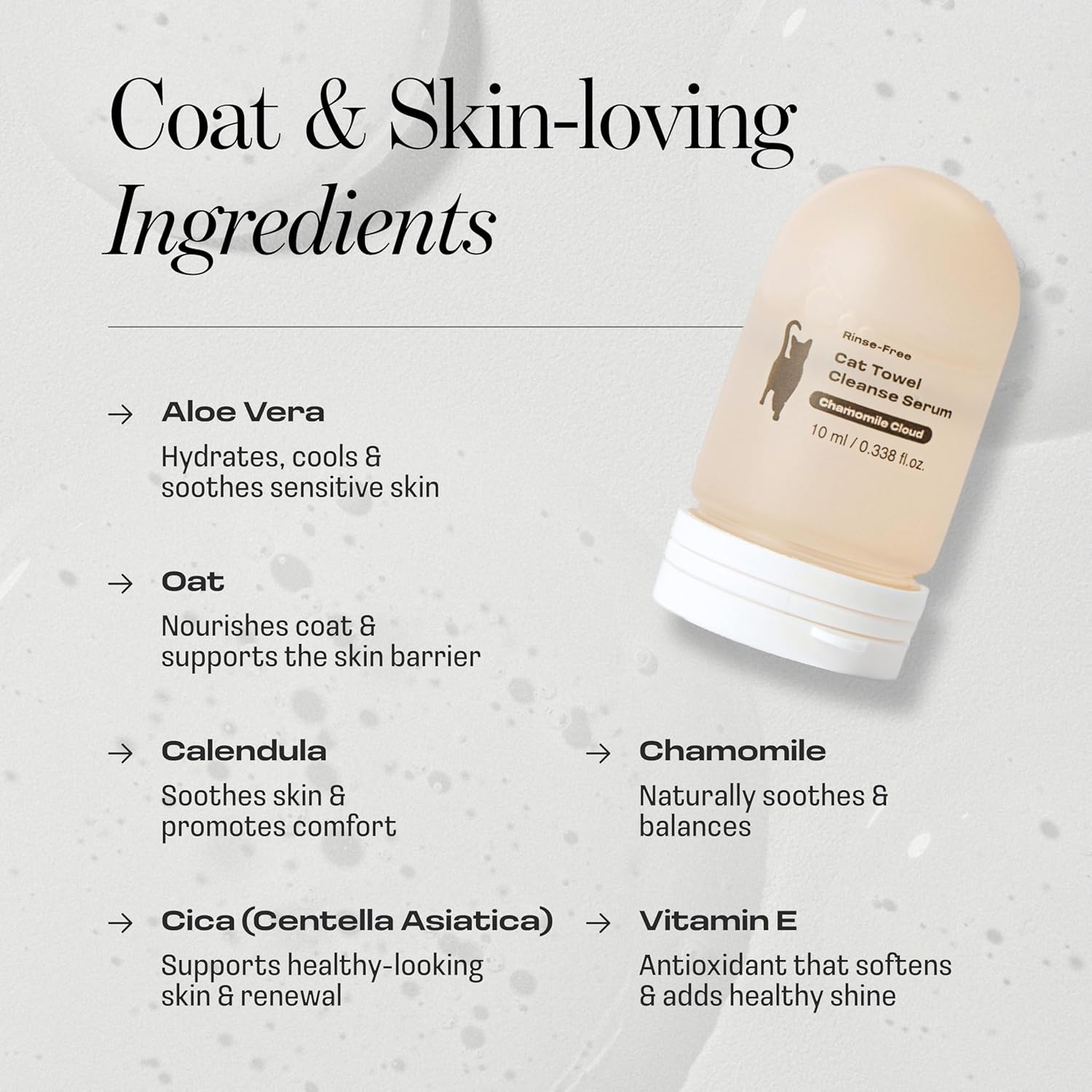 About this item Rinse-Free Cat Dry Shampoo & Conditioner: A 98.65% naturally derived cat dry shampoo and conditioner formulated for gentle, in-between grooming. This waterless cat shampoo cleanses, hydrates, and refreshes without rinsing—perfect for water-averse cats, anxious cats, senior cats, and sensitive-skin felines who dislike traditional bathing. Skin-Calming Botanicals for Sensitive or Itchy Cats: Formulated with oat extract, aloe vera, cica, Roman chamomile, calendula, portulaca, vitamin E and other soothing botanicals to lift dirt, hydrate the coat, reduce odor, and calm irritation without disrupting the skin’s natural balance. A gentler alternative to harsh cat deodorizing spray or foaming waterless shampoos. Low Stress Towel Cleanse Ritual for Cats: Perfect for in-between baths, shedding season, senior cats, nervous cats, long-hair breeds, and quick cleanups after messes. This no-rinse towel-cleanse method reduces bath stress and offers a calming, low-pressure grooming experience—no tub, no dryer, no struggle. Better Than Pet Wipes—A Deeper, Cleaner Finish: Unlike wipes that smear dirt and irritate sensitive skin, this rinse-free serum allows for a deeper clean with any towel. Lifts buildup, dander, and odors more effectively and leaves the coat soft, hydrated, and fresh without residue. Gentle Formula for Sensitive or Allergy-Prone Cats: Free from parabens, sulfates, artificial fragrance, alcohol, and harsh detergents. Safe for kittens, adults, and senior cats needing a waterless cat shampoo, no-rinse cat wash, or fast, soothing refresh between full grooming sessions. Ideal for felines with delicate skin or fragrance sensitivity. › See more product details