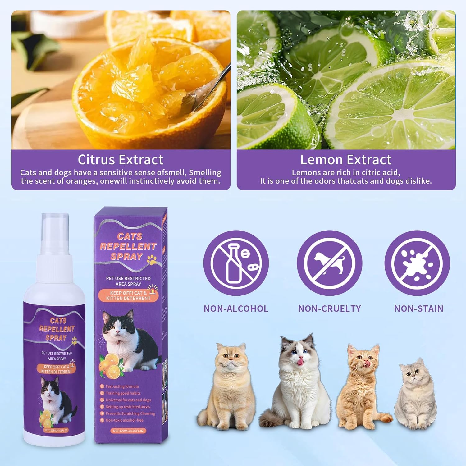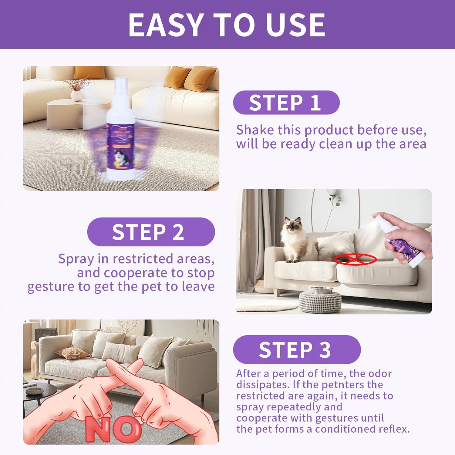 EFFECTIVE DETERRENT: This cat anti-scratch furniture spray is an excellent training aid for discouraging from cat damage chewing on furniture, curtains, carpets, and other household items. 2-IN-1 UNIQUE SAFE FORMULA: Our cat spray deterrent is formulated with gentle, plant-based ingredients. 1.Specially formulated with a scent that pets dislike discouraging scratching 2. Bitter taste to discourage chewing and gnawing. The compact bottle design ensures easy handling and portability, allowing you to use the spray wherever needed. INDOOR & OUTDOOR USE: This cat repellent spray formula is safe for indoor and outdoor use. Our dog deterrent spray can give off smell that is unpleasant to dogs for a long time on the surface. And licking can create a bitter taste. Keep Pets away from the wrong place. EFFECTIVE BEHAVIOR TRAINING: Our no scratch spray for cats is an effectively corrects bad habits in cats. Combined with blocking gestures or passwords rewards or punishments based on pet performance. As needed, it can be used repeatedly every day until the pet develops a good habit. EASY TO USE: Shake well before use. Spray where you want pets to stay away. The anti scratch cat spray suitable for use on various materials such as wood, fabric, furniture, shoes and plastic. Observe your pet's response and adjust the frequency accordingly until there is no more scratches and chewing. › See more product details