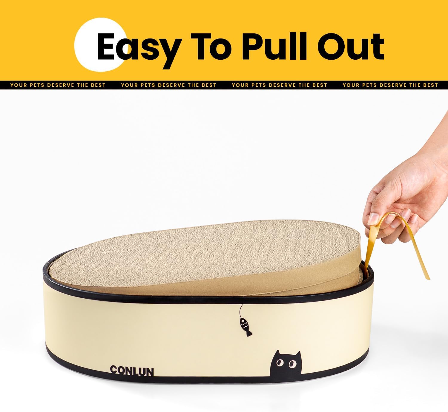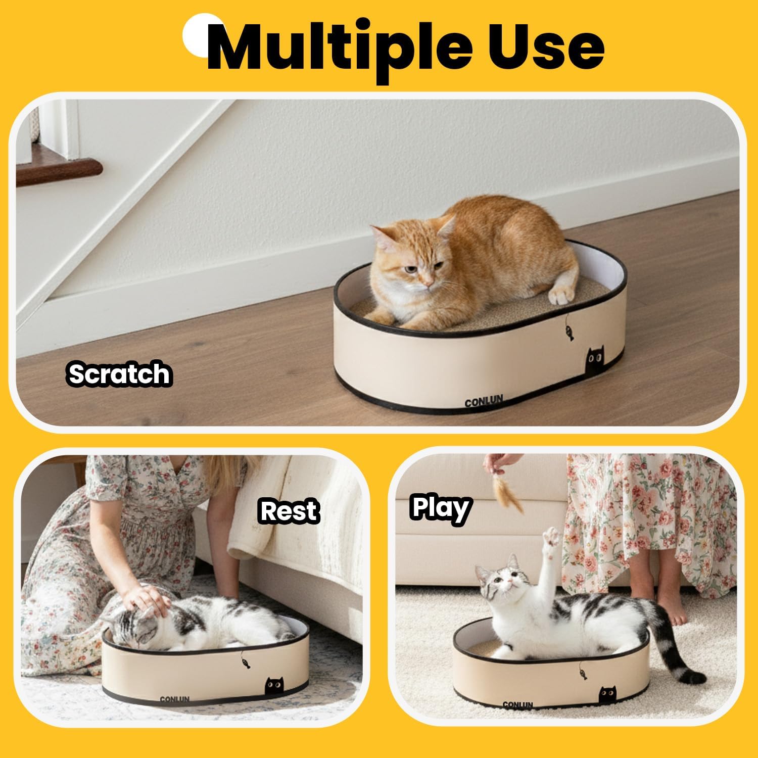 About this item Ideal for Multi-Cat Homes: Each cat scratch box comes with 4 double-sided cat scratch pads refill, durable and easy to replace, perfect for multi-cat households. The double-sided design extends the lifespan of the cat scratching pads, providing your cats with long-lasting scratching fun while reducing the need for frequent replacements, making pet care stress-free. All-in-One Cat Scratching Box: Conlun cat cardboard scratcher combines scratching, playing, and relaxing into one versatile solution, catering to your cat’s various needs. After a satisfying scratch session, your cat can snuggle up comfortably in the cat scratcher box. Whether enjoying it solo or sharing with furry friends, this multi-functional cat scratcher bed offers endless fun and exploration for your cats. Perfect for Gifts: Available in 3 unique designs, this cat scratch pad box seamlessly blends with any home decor while adding a touch of charm. Measuring 16 x 12 x 4 inches, it features a spacious design that accommodates cats of all ages—supporting up to 11 lbs. Whether it’s your cat’s birthday or a special holiday, this cat scratch board box makes a thoughtful and practical gift, bringing comfort to your furry friend and warmth to your home. Protect Your Furniture: Place the kitten scratcher box near your sofa, bed, or your cat’s favorite spots to redirect their attention away from furniture. Designed specifically for cats, it satisfies their scratching instincts while keeping your furniture safe from damage. Achieve a harmonious home where your cats and furniture can coexist peacefully. Mess-Free Scratching Solution: Made with high-quality, dense corrugated cardboard, this cat furniture is built to handle your cat's scratching needs while being gentle on their paws. The enclosed bottom design prevents debris from scattering, keeping your floors and carpets spotless. A practical choice to keep your home tidy and your furry friend happy. › See more product details