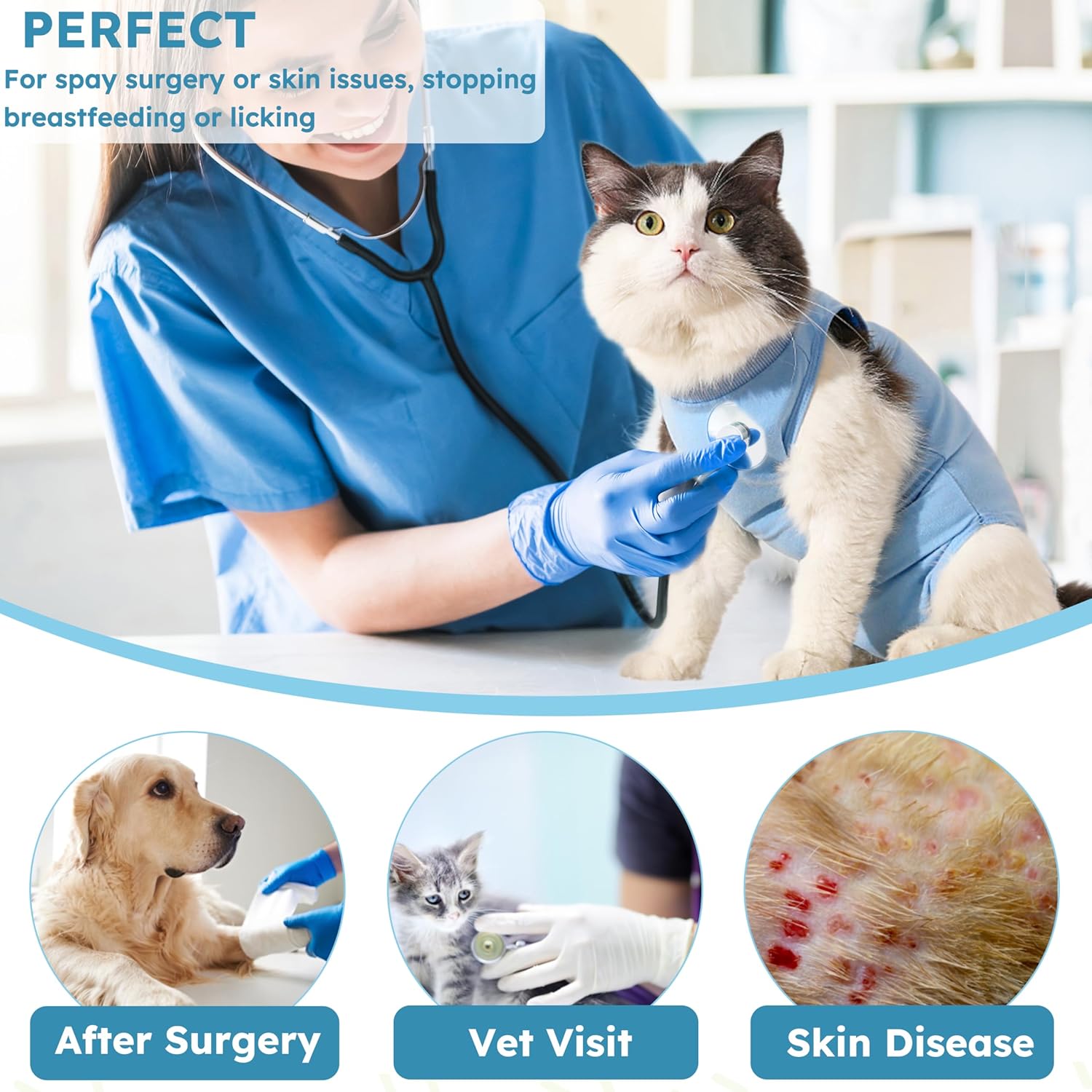 About this item GOOD FOR NEUTERING RECOVERY: The recovery suit helps to prevent your pet from licking and their scratching surgery wounds, and it also can ease your female male cat's anxiety after been spayed or neutered, making the recovery process more enjoyable. BETTER THAN TRADITIONAL CONES: The post-operative recovery suits are a perfect replacement for cone and E-collar. Pets can eat, sleep, walk, and use the litter box without limitations, ensuring they can move freely and comfortably during their recovery. TAILORED FOR COMFORT: Cat recovery suit is made of premium high-elastic fabric, soft, stretch, lightweight and comfortable, which keep the covered areas dry and clean, and reduce the risk of infection. Gives your furry friends enough comfort when moving and healing. SIMPLE TO PUT ON/OFF: With an adjustable neck elastic band and back velcro tape design, our cat spay recovery suit ensures both safety and a perfect fit that can help reduce your cat's anxiety. You'll have no trouble dressing or undressing your cat. KEEP CLEAN & & PREVENT INFECTION: This cat onesie can cover most of the cat's hair and prevent the hair from falling everywhere, keep you room clean whether indoors or outdoor. Also prevent pets from licking wounds, skin conditions, hot spots and allergies. EASY CARE AND REUSABLE: Our kitten recovery suit is reusable and machine washable. It can endure many washings without losing quality, making it a durable and trustworthy companion throughout your pet's recovery process. › See more product details