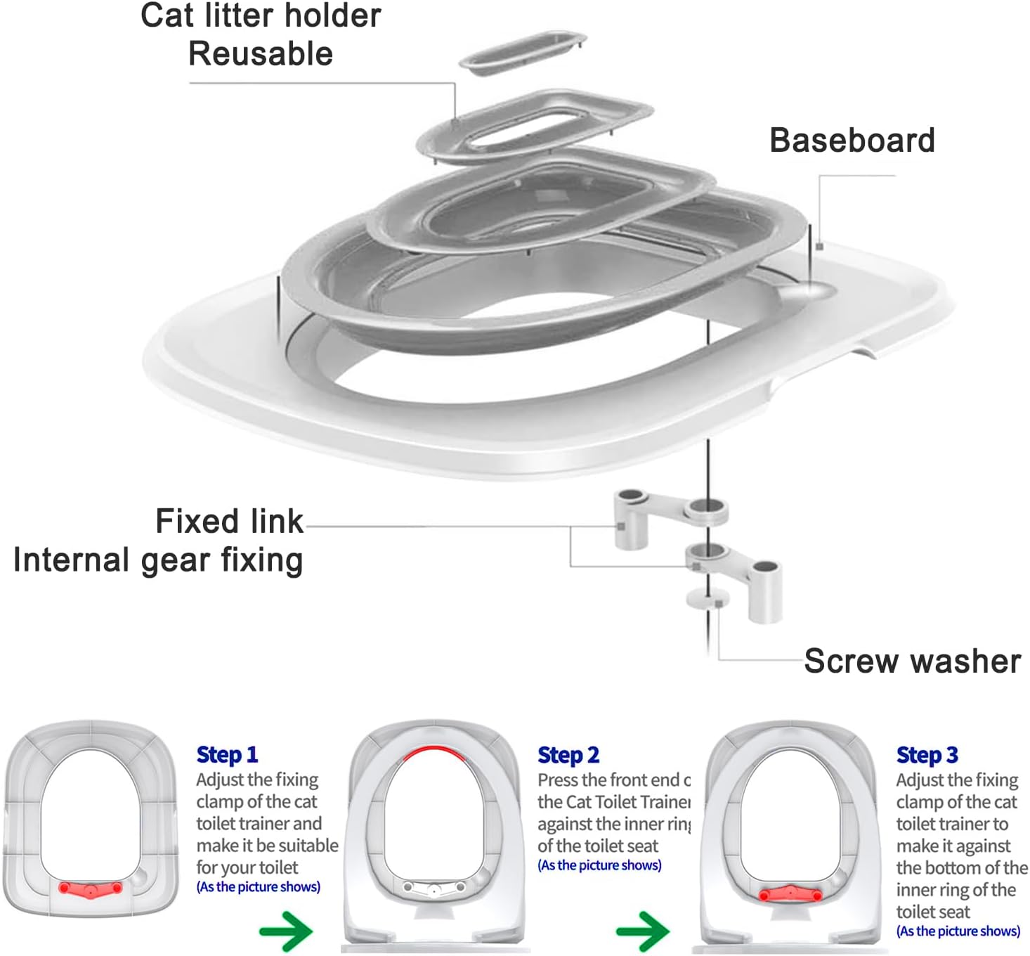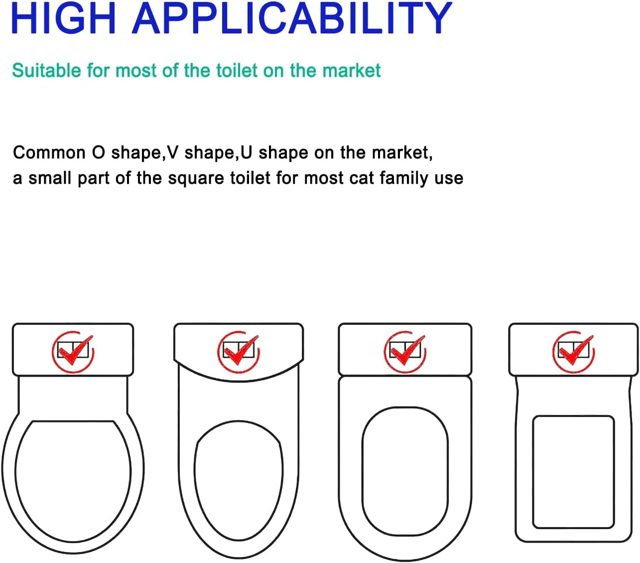 FeaturesPremium Quality Cat toilet training kit is made of ABS, which is safe, non toxic and harmless to pets. And it has a strong bearing capacity, which can bear the weight of most cats. Separation Design Pet cat toilet trainer adopts groove design, which is beneficial to the disassembly of the pallet. The special design will not interfere with the normal use of the toilet by adults. You can switch between them in a quick and easy way. Strong Bearing CapacityCat toilet trainer has a strong bearing capacity, which can bear the weight of most cats.Specification· Item Type: Cat Toilet Training Kit· Material: ABS· Color:White and BluePackage Include· 2 x Cat Toilet Pads· 1 x English Manual· 1 x blue feather ToyWarm Note1.Please measure the size of your toilet before buying to make sure it is suitable.2.You can use a knife to cut the recess and get your cat used to going to the toilet. If your cat can't adjust to the new situation, you can use the spare tray to return to the previous step.3.We recommend using biodegradable litter. Because at the beginning of training, the litter can get into the toilet and may cause clogging.