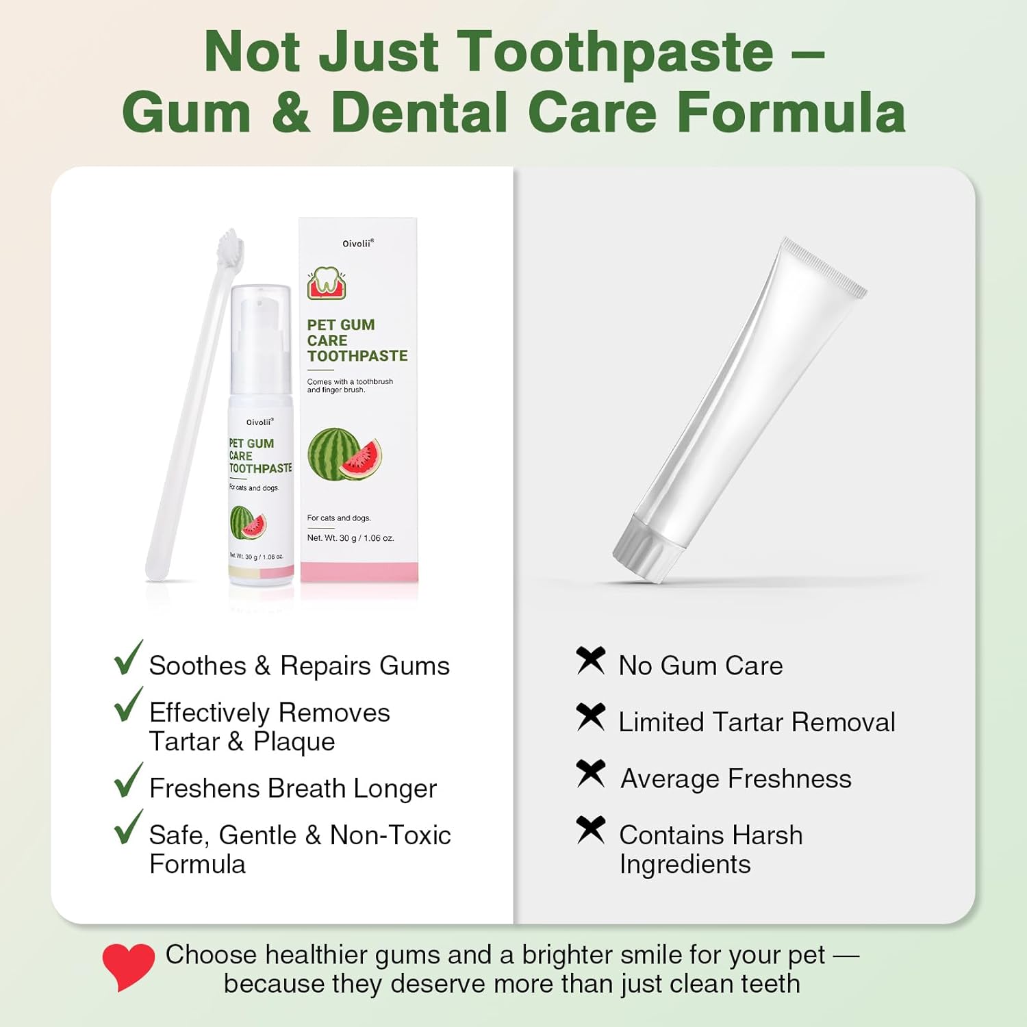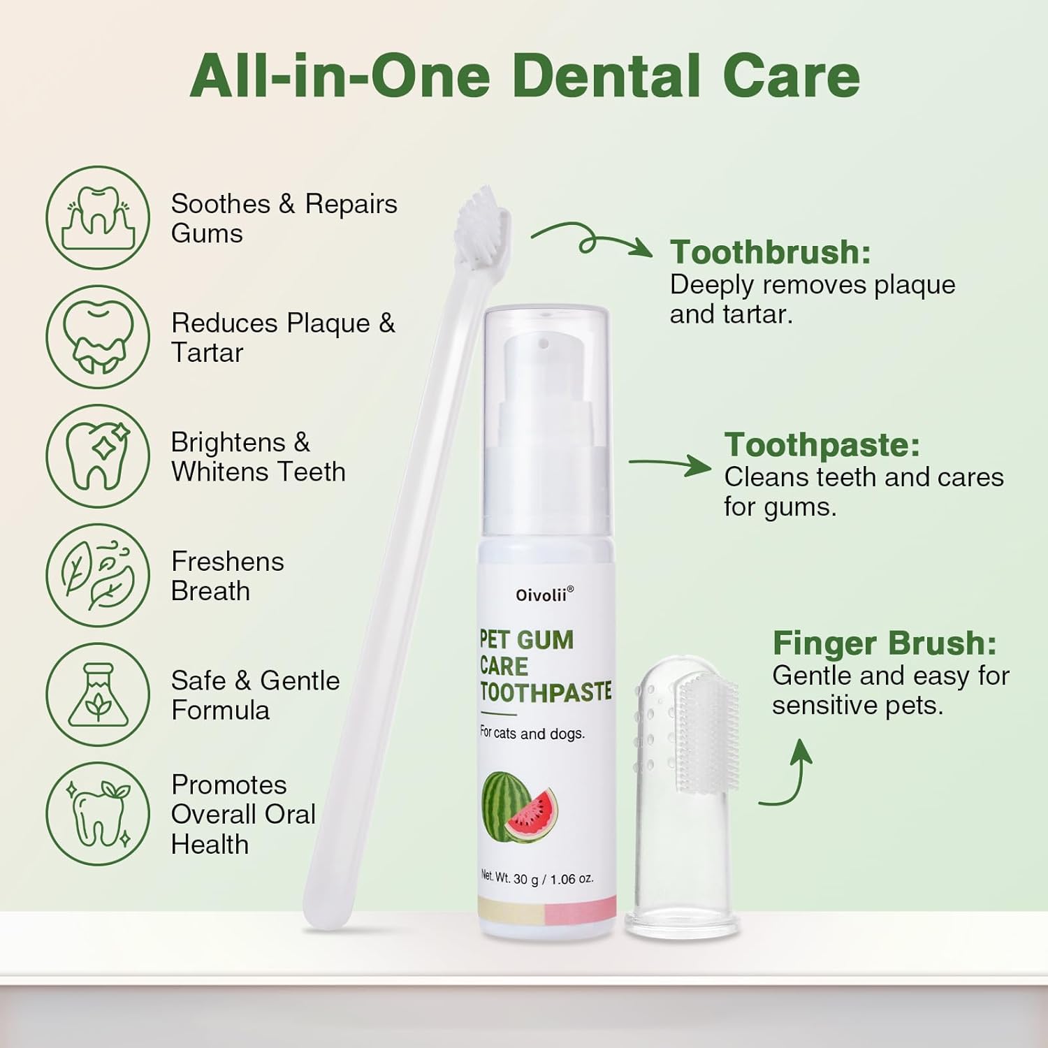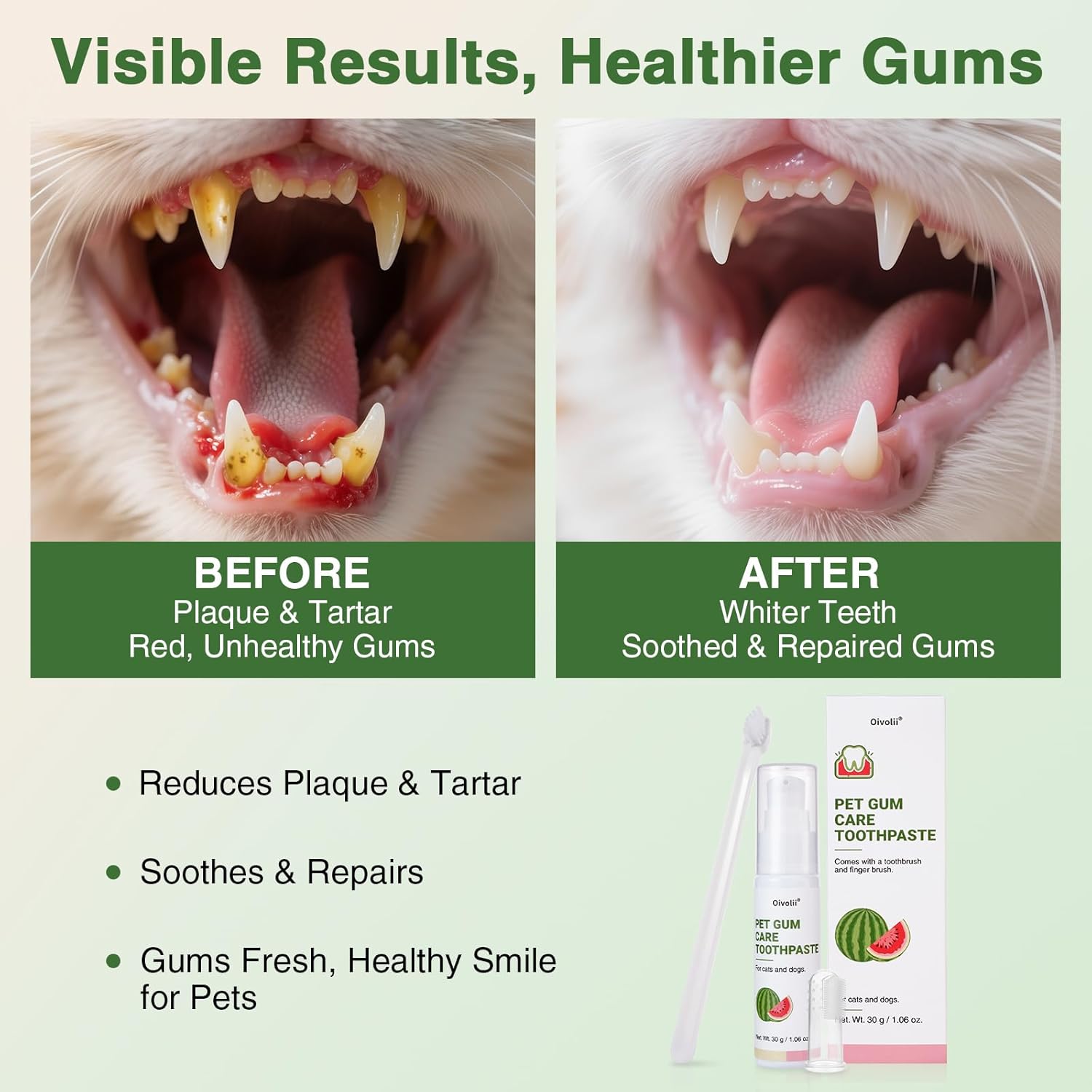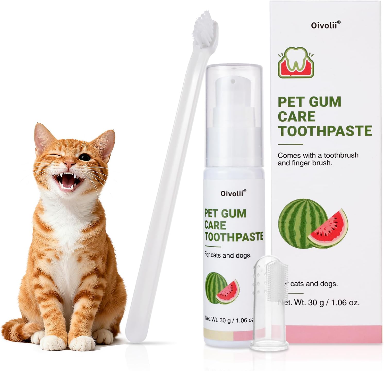 About this item Specially Formulated for Cats’ Sensitive Gums:Designed for delicate feline mouths, this toothpaste helps soothe and protect gums while gently removing plaque and tartar — ideal for cats prone to gum irritation or redness Reduces Plaque & Prevents Tartar Build-Up:Regular brushing with our cat toothpaste helps keep teeth clean and breath fresh, reducing the risk of gum disease and oral discomfort Mild Watermelon Flavor Cats Tolerate Well:Unlike strong minty flavors, this light watermelon taste is cat-friendly — no irritation, no struggle, just easier daily brushing Complete Dental Care Set for Cats:Comes with a soft silicone finger brush for gentle gum care and a professional long-handle toothbrush for reaching hard-to-clean back teeth — suitable for kittens and adult cats Safe, Non-Toxic & Vet Recommended:Made from pet-safe ingredients, free from alcohol, fluoride, and harsh chemicals. Safe if licked or swallowed, perfect for daily feline dental care routines › See more product details