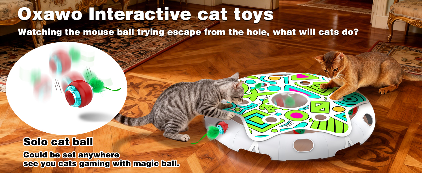 Interactive Puzzle Toy - Cat puzzle toy with six hunting holes; Allows your cat to reach in and swat the prey (bouncing balls) inside for interactive play. Large PVC holes help kitty view clearly but they cannot catch the ball,keep your kitty entertained and active Hide n Seek game - The electric cat ball hidden under the mat constantly jumping and trying to escape through one of the holes. Will your kitty be attacted in this catching mouse game? A good cat exercise for high energy cats, adults cats or fat Automatic cat ball with motion sensor, which will be wake up by touch ( Ball works 5mins then go standby).Rechargeable cat toys ball will be charge within 2hrs 3 Modes - Set the mouse ball in soft, active, or interactive mode, Distinguish working mode via LED lights (Blue/Purple/Yellow) Extra TWO cat bell, your cats also could have a large garden when you put the single ball on floor. Colorful mat will decor your home and it's a great gift for Halloween, Christmas or New Years › See more product details