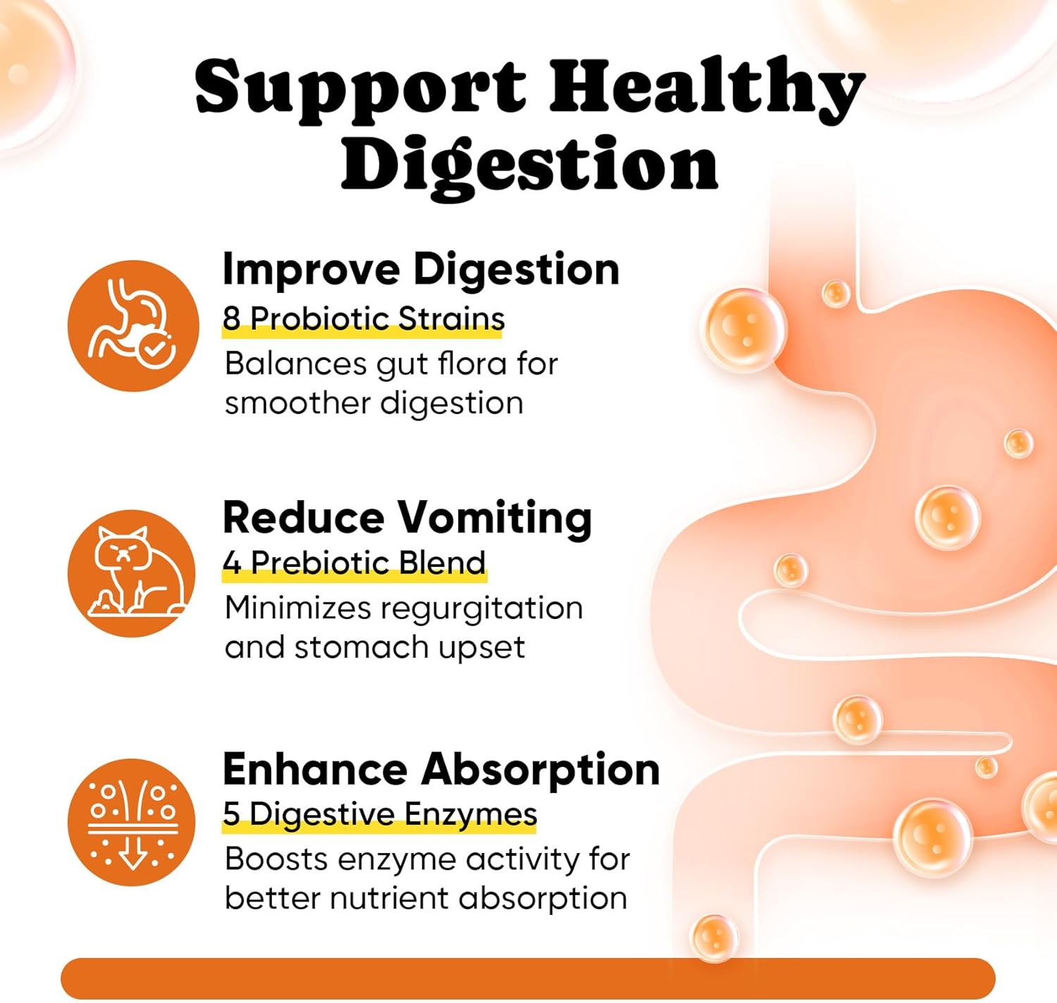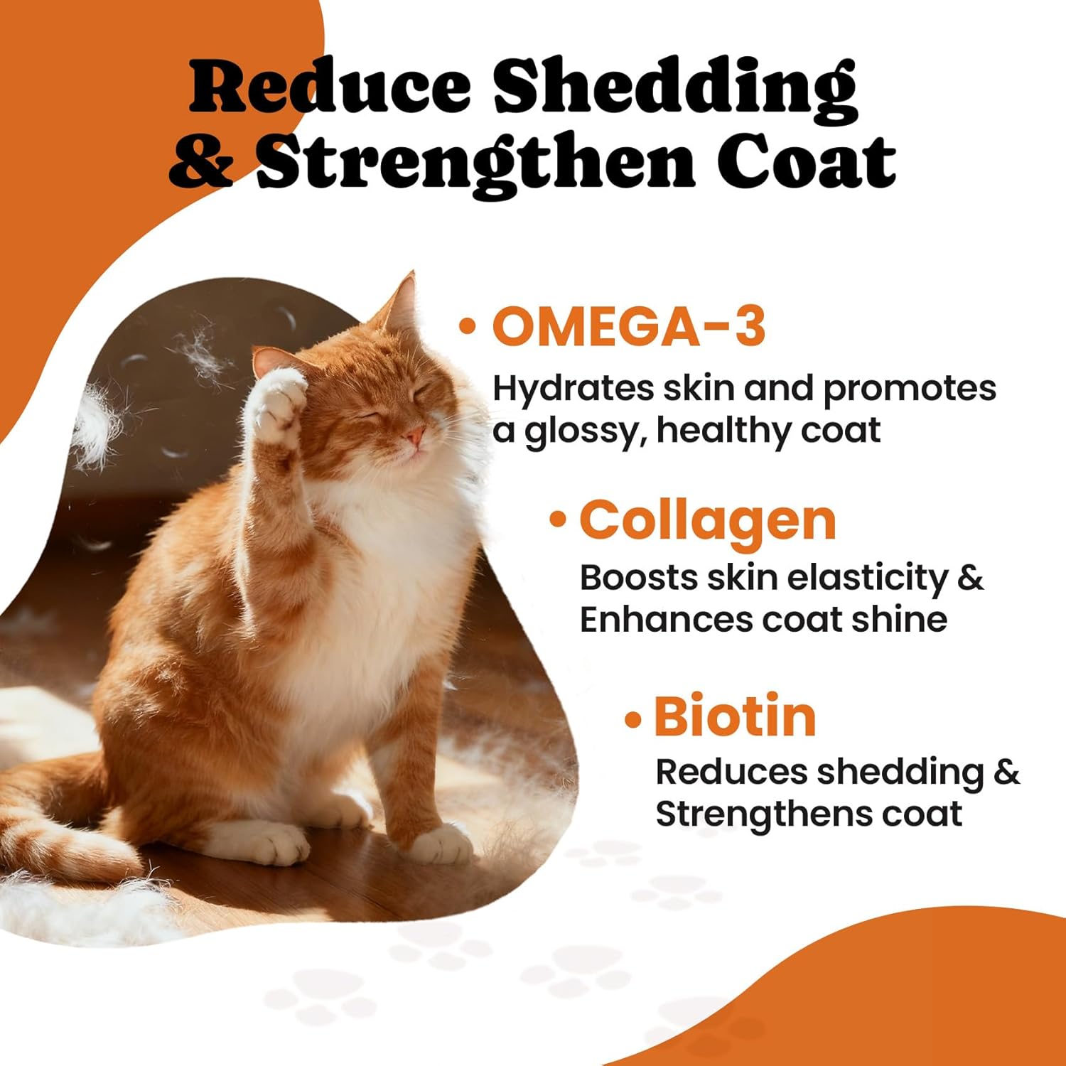 About this item 【Complete 12 Vitamins + 5 Minerals】Designed specifically for felines to fill nutritional gaps. Supports multiple bodily systems—helping maintain metabolism, boost energy, and promote whole-body wellness. Perfect for indoor cats, picky eaters, and growing kittens 【Enhanced Immune Defense Boost】A powerful immune blend featuring L-Lysine for cats, Beta-Glucan, and taurine supplement for cats. Helps reduce sneezing, eye discharge, and respiratory irritation while boosting viral defense to keep your cat strong and resilient at every age 【5-in-1 wellness system Support】Inside each chew, a powerful blend of L-Lysine, Taurine, Omega-3s, Collagen, Probiotics, Digestive Enzymes, Glucosamine, and Cranberry works together to boost immunity, enhance skin & coat, improve digestion, support joint mobility, and maintain urinary health—all in one daily bite 【Preventive Support for Every Stage】Designed for kitten treats, adult indoor cats, picky eaters, and cats senior. Daily use helps prevent early decline—dull coat, low immunity, digestive imbalance, stiffness, or urinary discomfort—before symptoms begin. A smarter choice than ordinary cat treats healthy 【Buy with Confidence】 We stand behind our products. If you or your pet aren’t fully satisfied with the results, we’ve got you covered. 👉️Any product issues, please contact us via Amazon Message Center. Enjoy a FULL-REFUND, NO QUESTIONS ASKED! For first-time use, start with half of the recommended dosage and observe your pet's reaction › See more product details