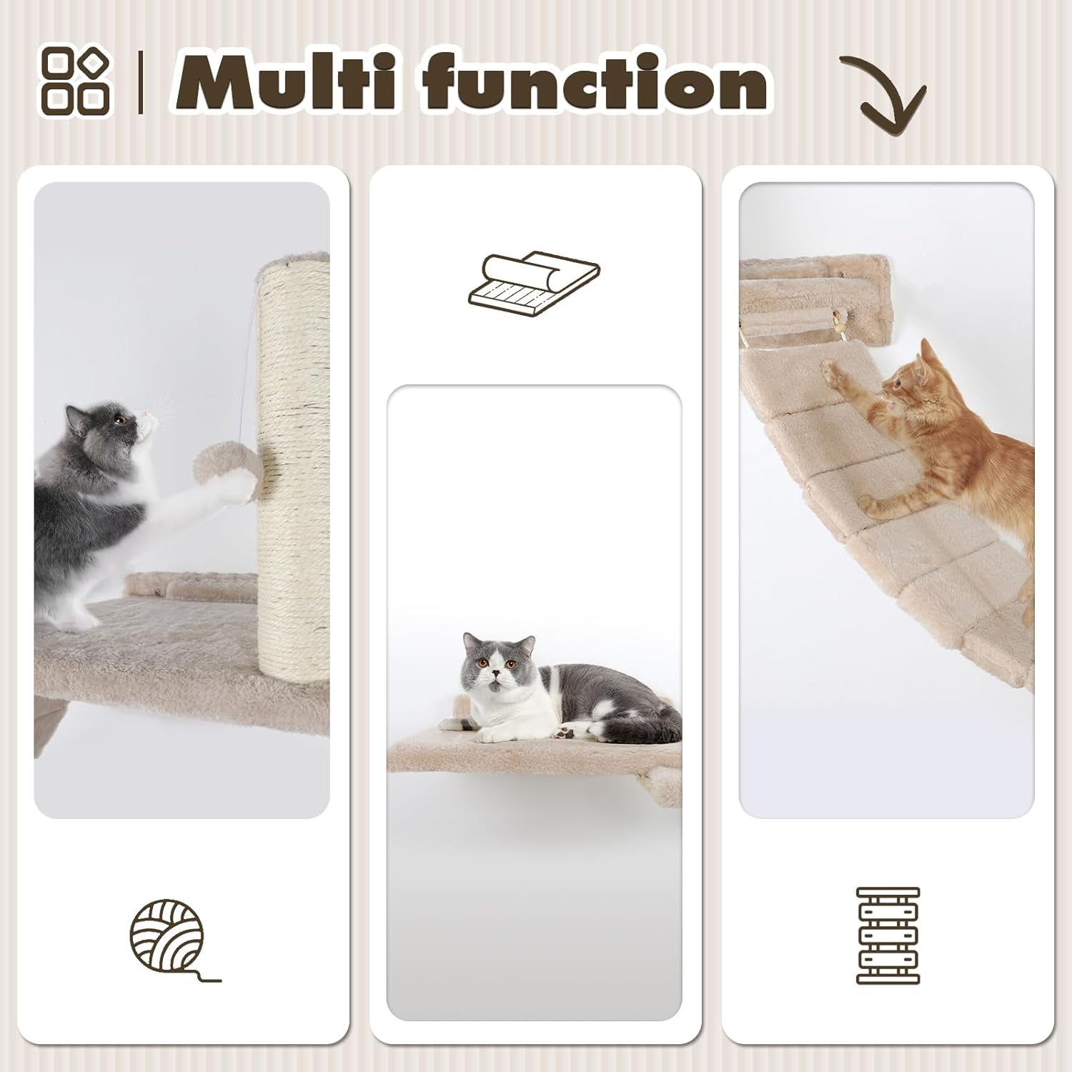 About this item Wall Mounted Cat Furniture - HDLKRR 7 pcs cat wall furniture, making it a versatile and multi-purpose solution for your feline friend's climbing and lounging needs. Premium Material - Cat climbing wall shelves using high-quality, environmentally materials. It ensures the longevity of the product while also promoting the safety of your furry friend. Easy Installation - The cat wall shelf comes with all the necessary hardware and a clear set of instructions, making installation a breeze. High Quality - This versatile cat wall furniture is suitable for cats of all sizes and body types. Whether you have a small, medium, or large-sized cat. Maximum weight of 22lbs Sleek & Durable Design - The wall mounted cat shelves also features a cozy cushion to provide additional comfort for your feline companion. Its modern and sleek design adds a touch of elegance to any room decor. › See more product details