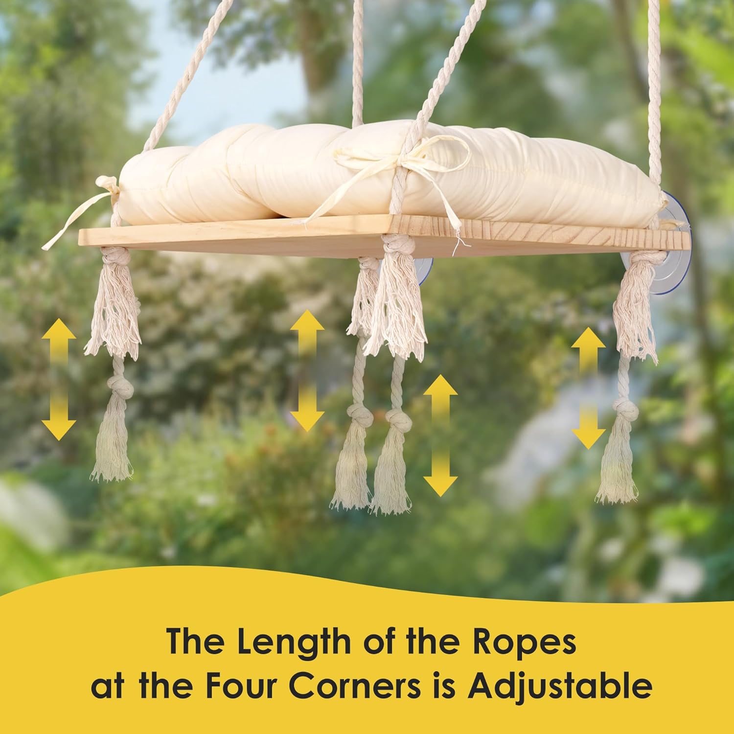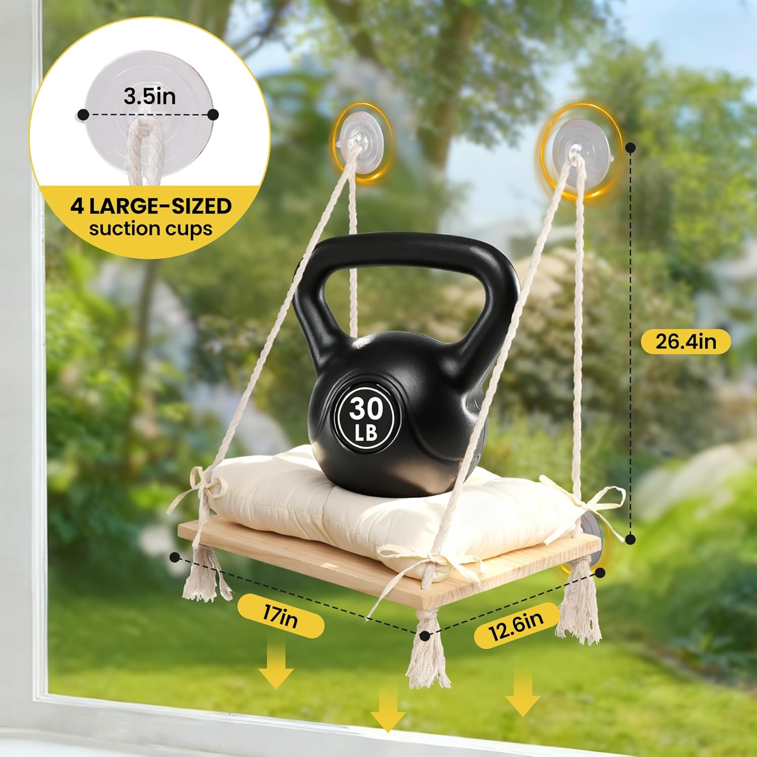 About this item Cat's Exclusive Rest Spot: Even when you're away, your cat naps comfortably, soaks up the sun, and watches birds—our cat window perch with a soft cushion is their cozy go-to spot Tassels - Cotton Rope: The adjustable lanyard of our cat window hammock fits all window sizes perfectly, and the bottom can be styled into cute cotton rope tassels—they’re not just a charming decor piece, but also your feline’s favorite plaything Soft Cushion - Solid Pine Wood: The soft padded cushion of our cat window seat delivers your cat’s ultimate comfort—scratch-resistant, tear-proof, and easy to clean. Its lightweight yet sturdy solid pine wood base ensures safety Large Suction Cups - 30 lbs Capacity: Equipped with 4 large 3.5-inch suction cups, supporting up to 30 lbs—perfect for cats of all sizes Boho-Chic Style: More than just a cat window bed—it’s a stylish boho-chic addition to your home decor › See more product details